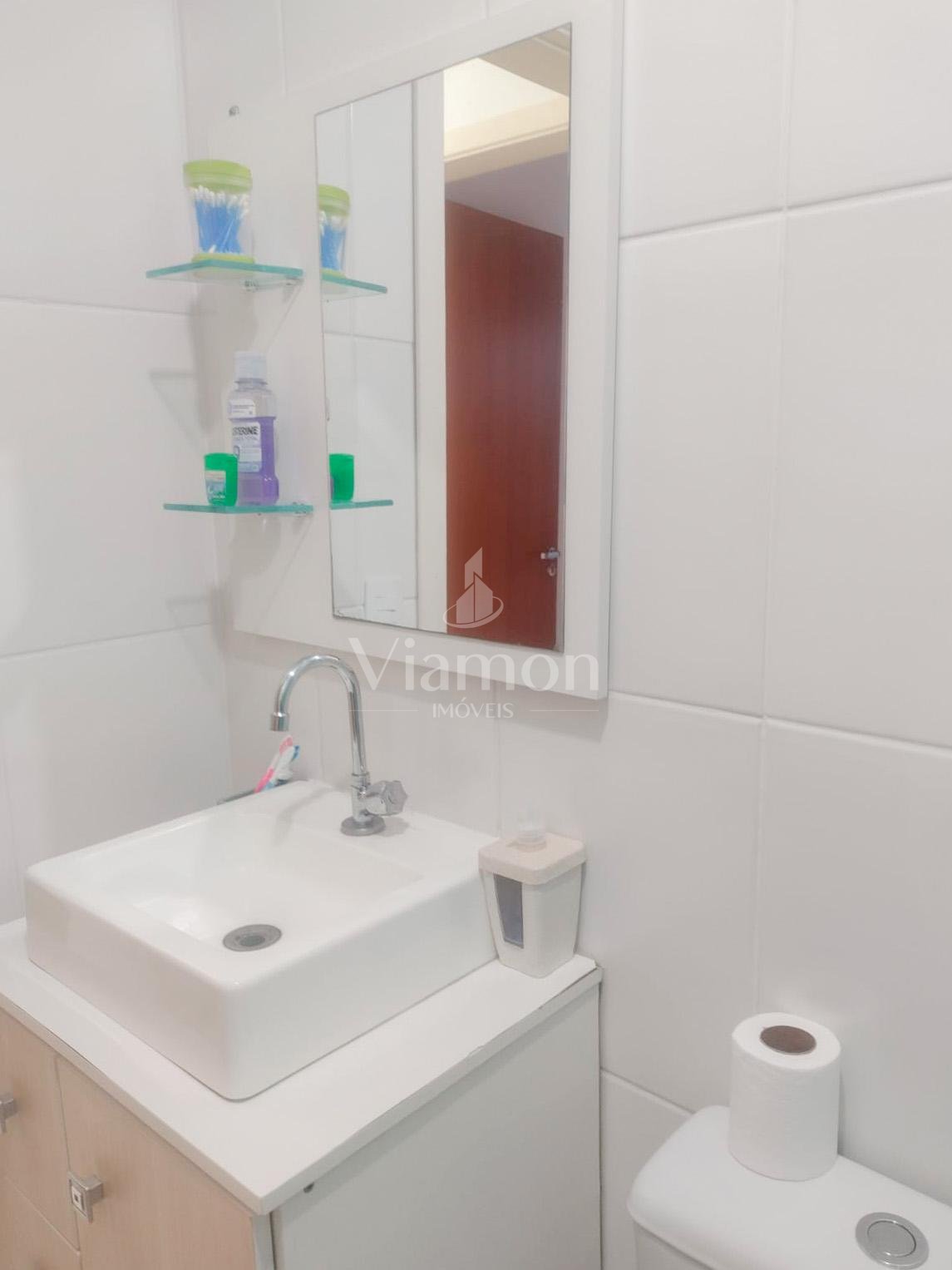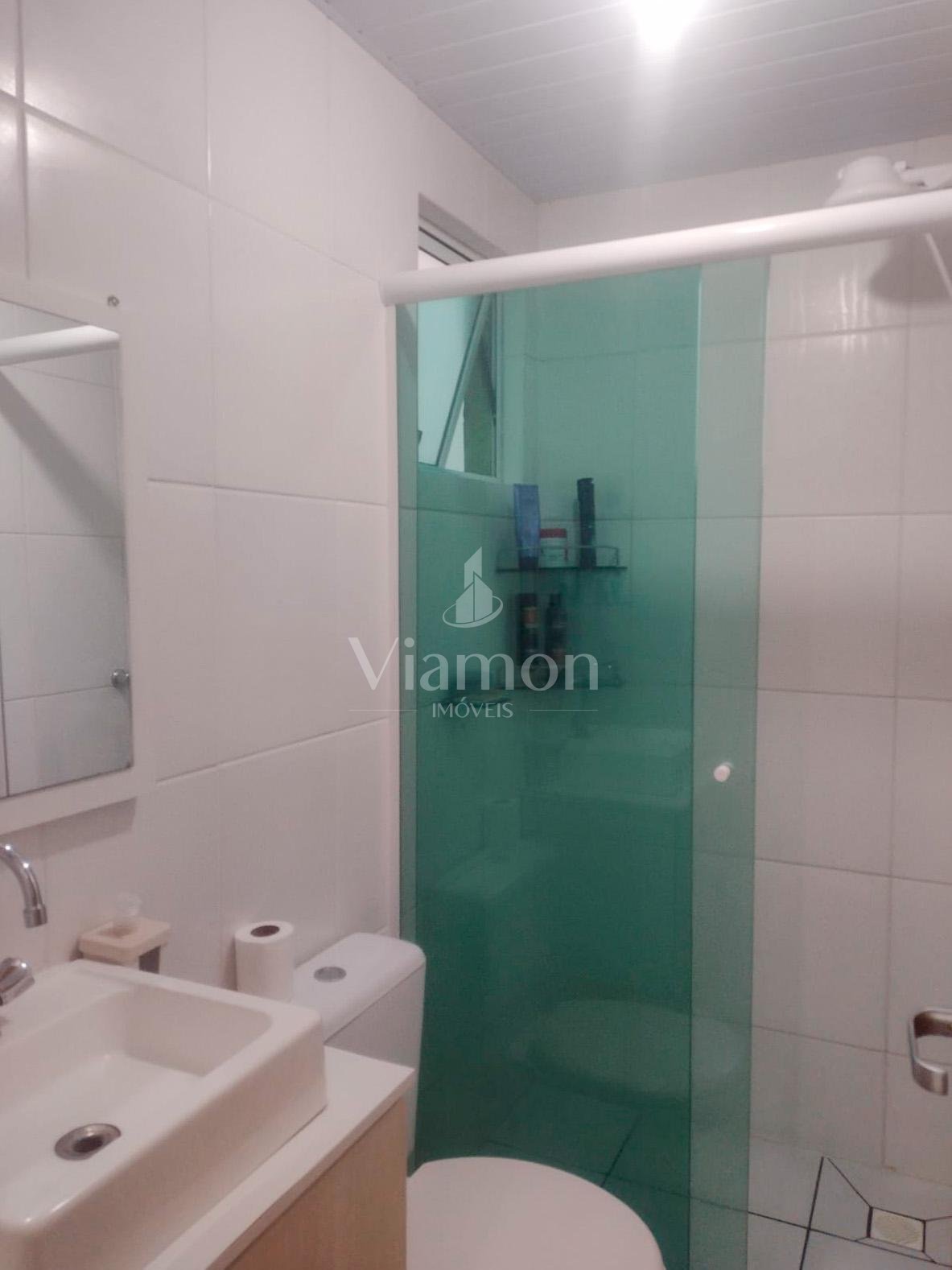 Banheiro completo com box de vidro, armário, espelheira e prateleiras.