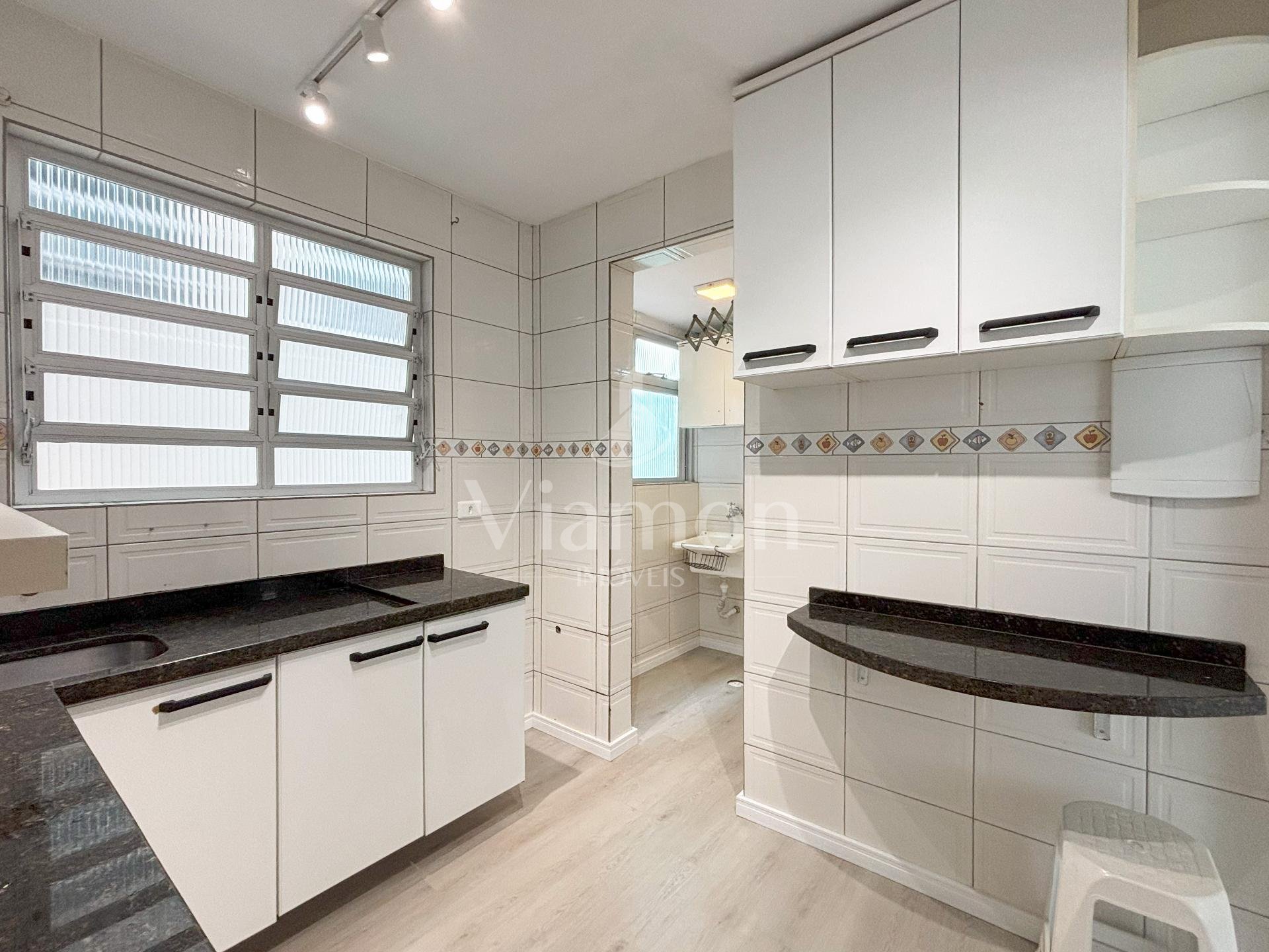 Cozinha e lavanderia com armários planejados e acabamento moderno
