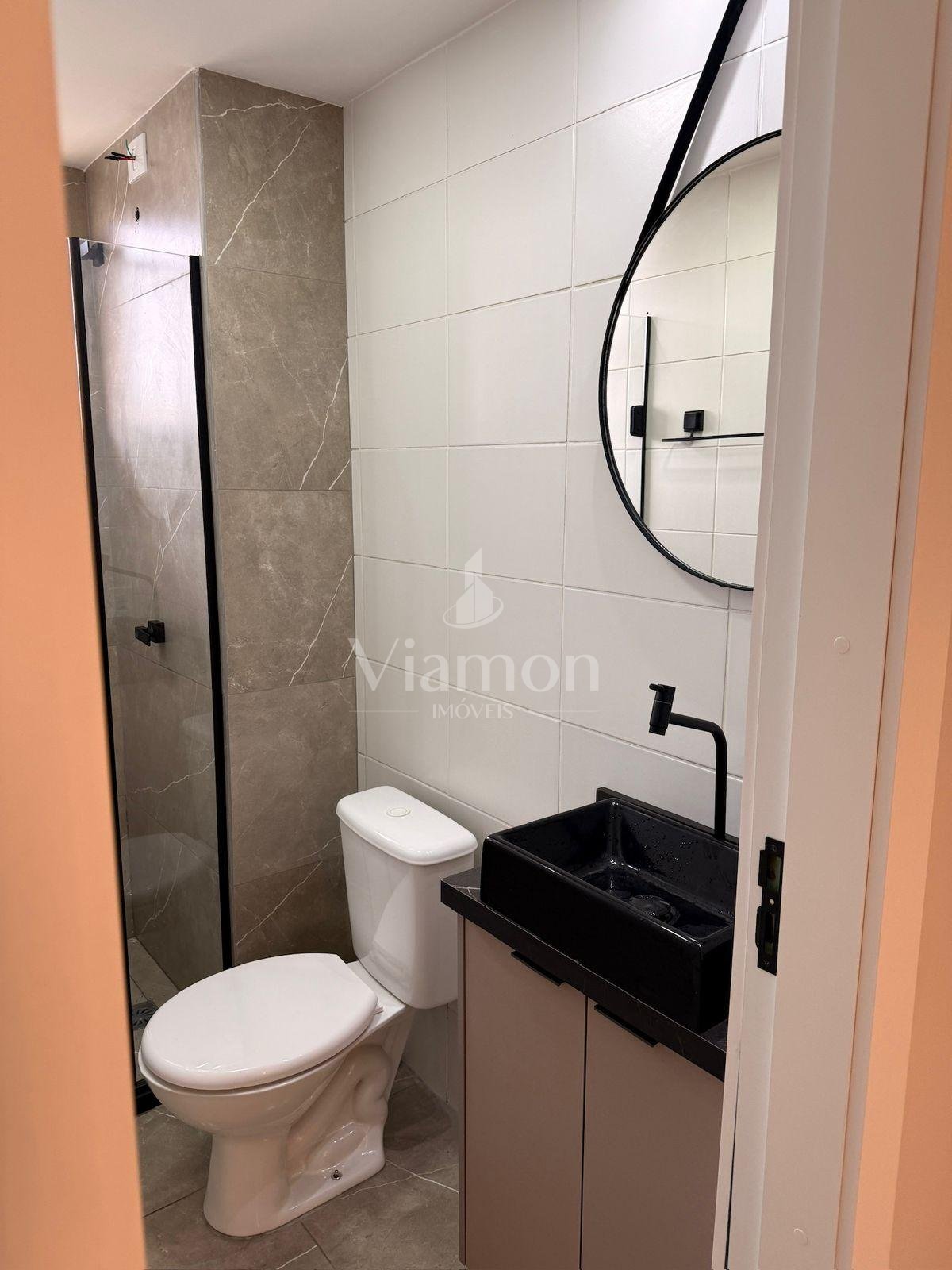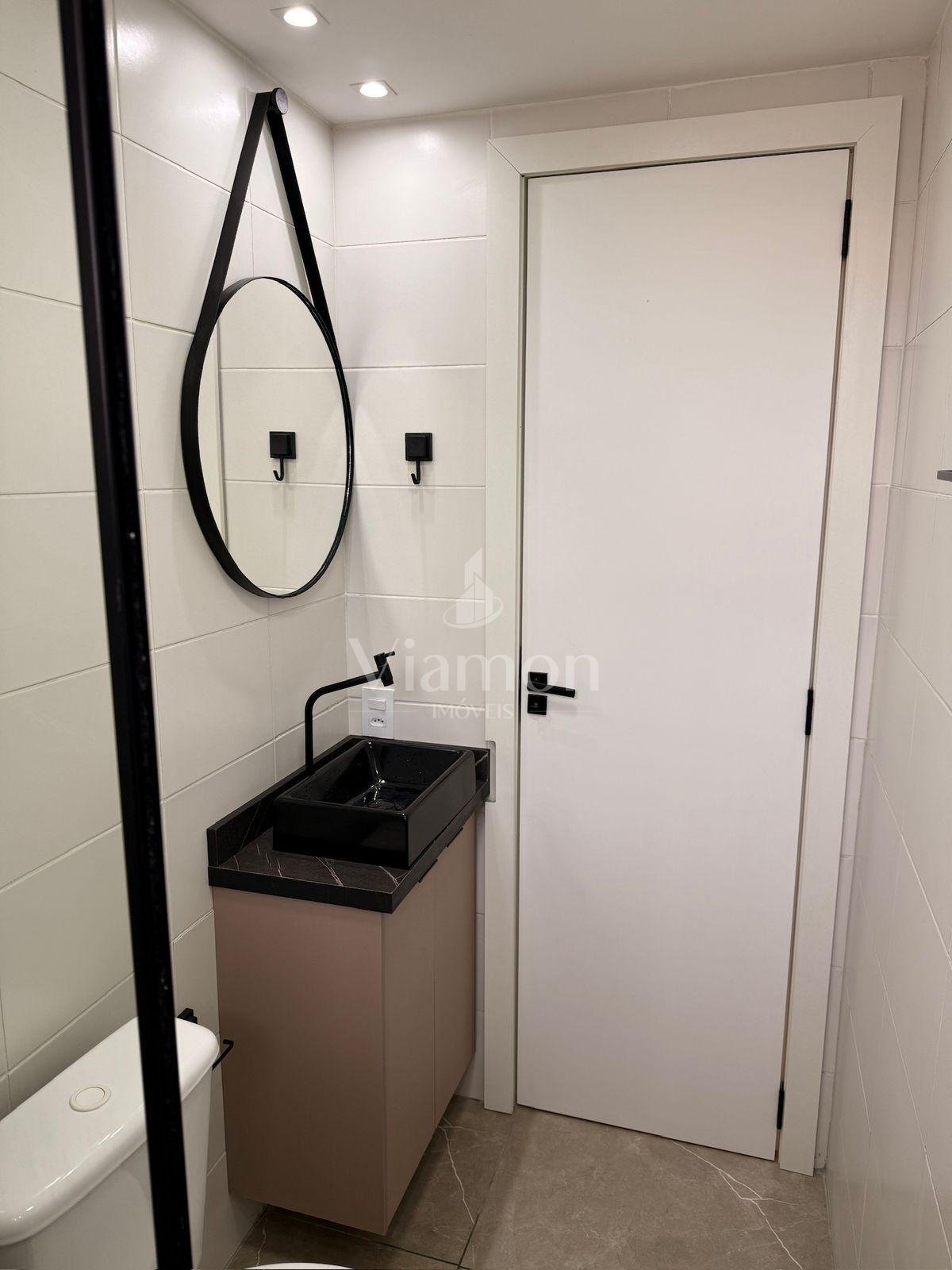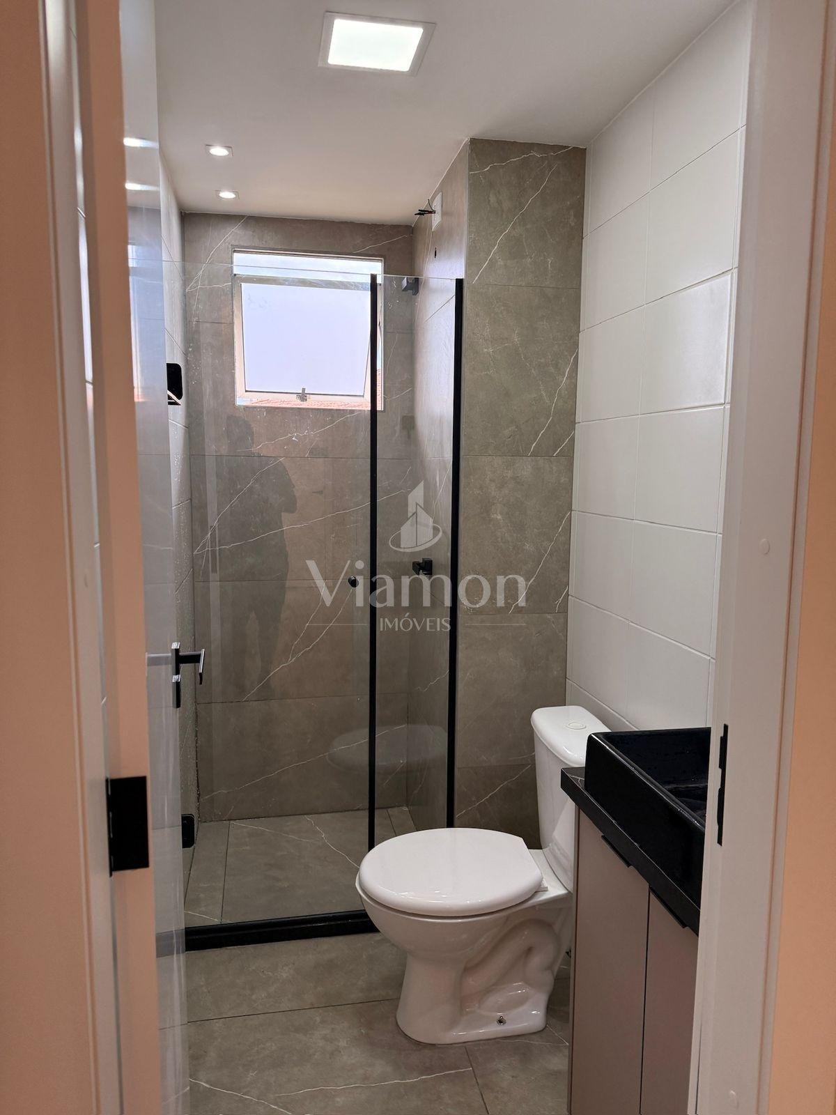 Banheiro moderno com armário planejado, pia em mármore e box em vidro temperado, garantindo praticidade e elegância.