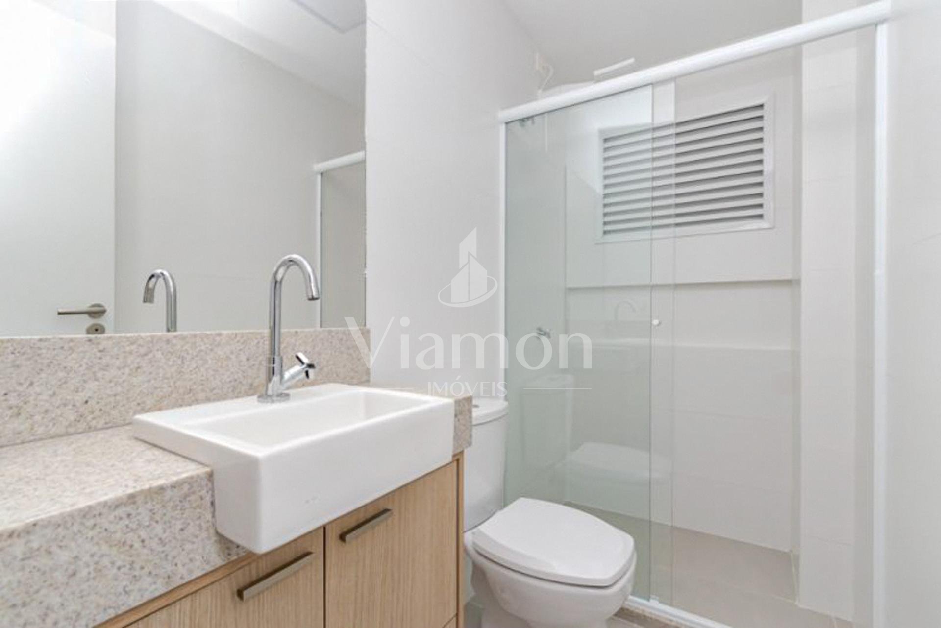 Banheiro completo, com armário sob medida e box de vidro.