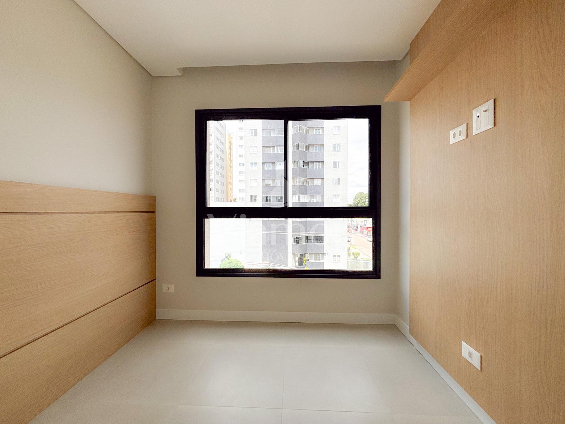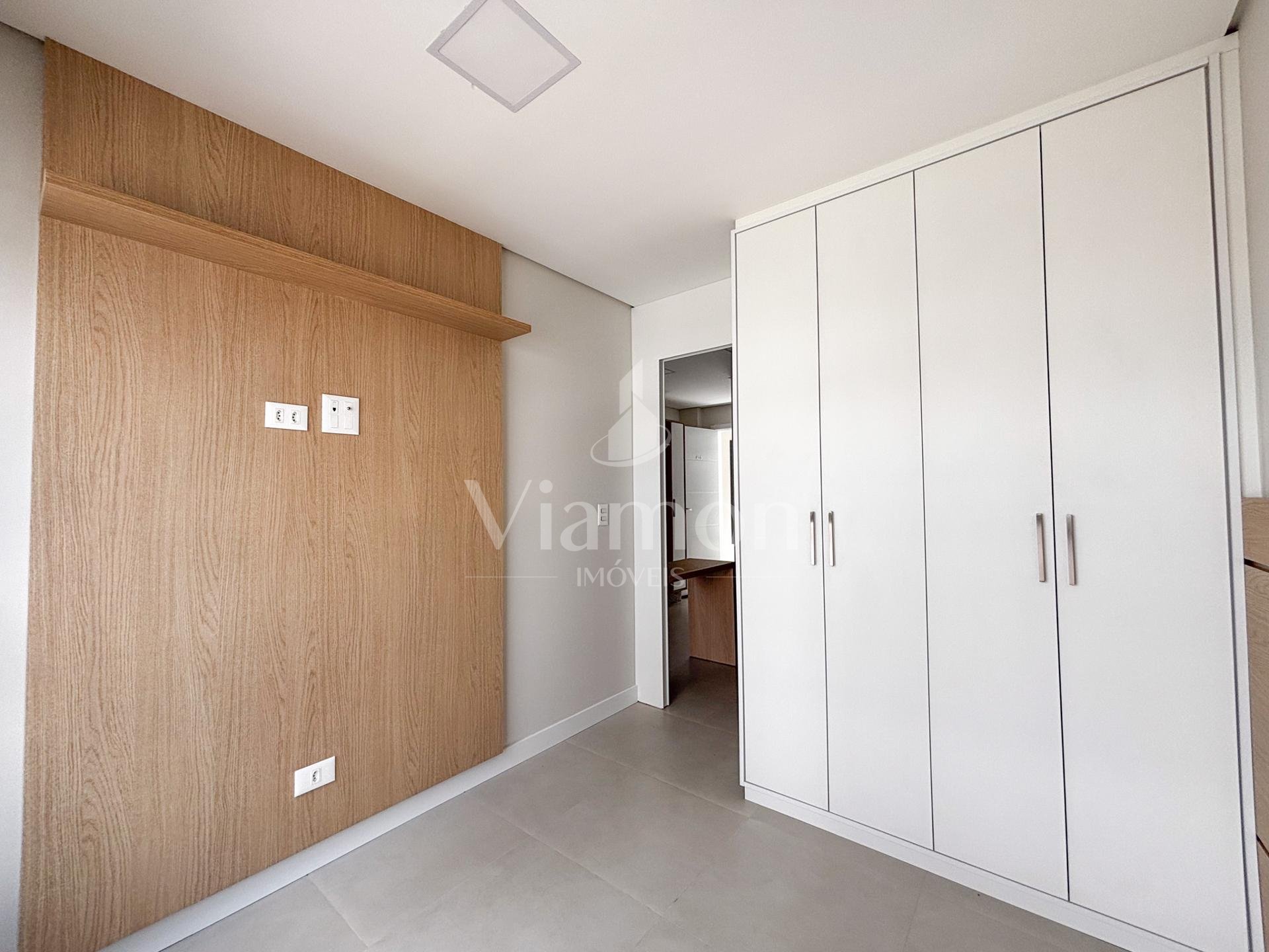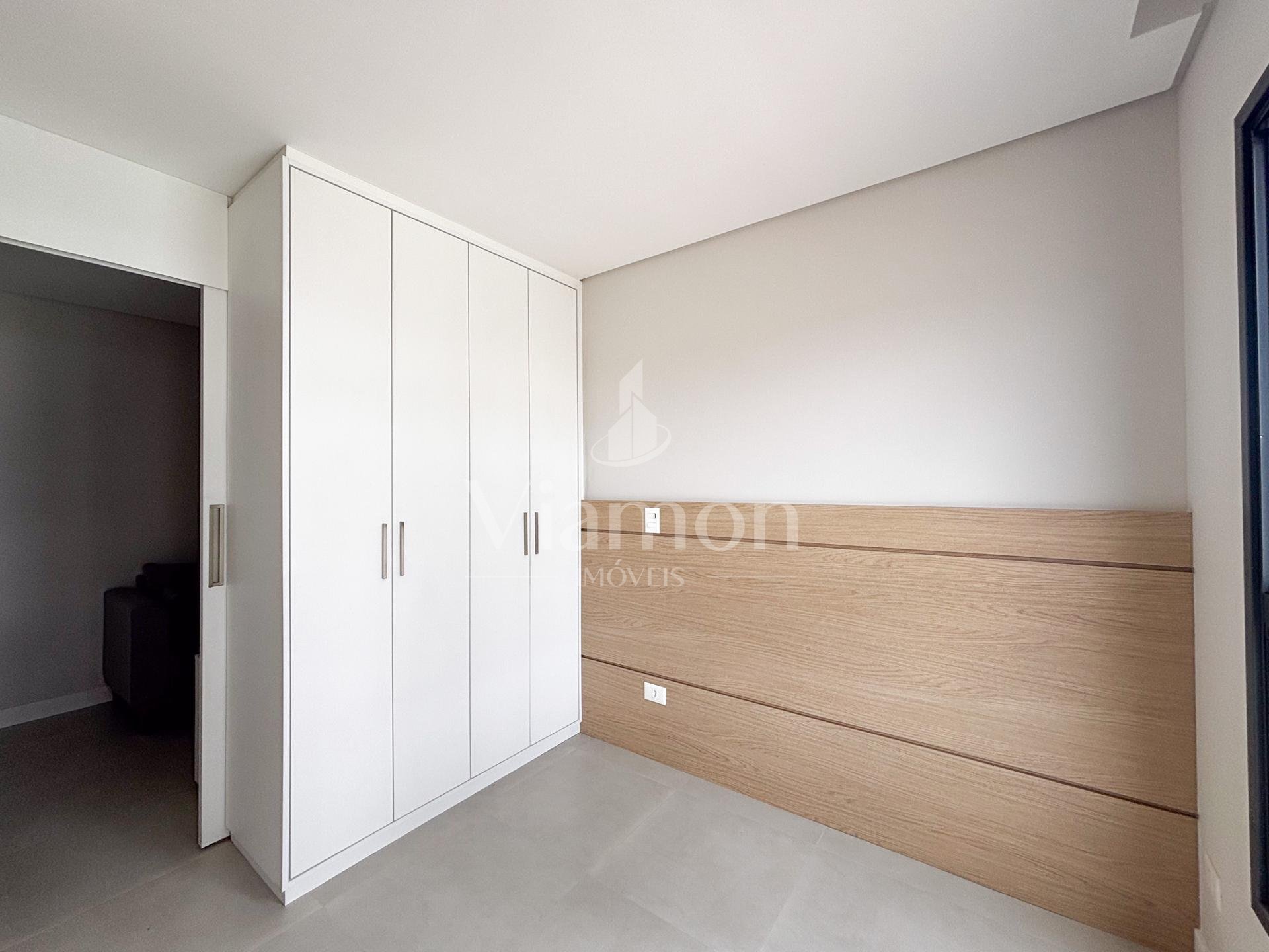 Quarto separado por porta de correr, com painel de TV, cabeceira em madeira nobre e amplo armário de 4 portas;