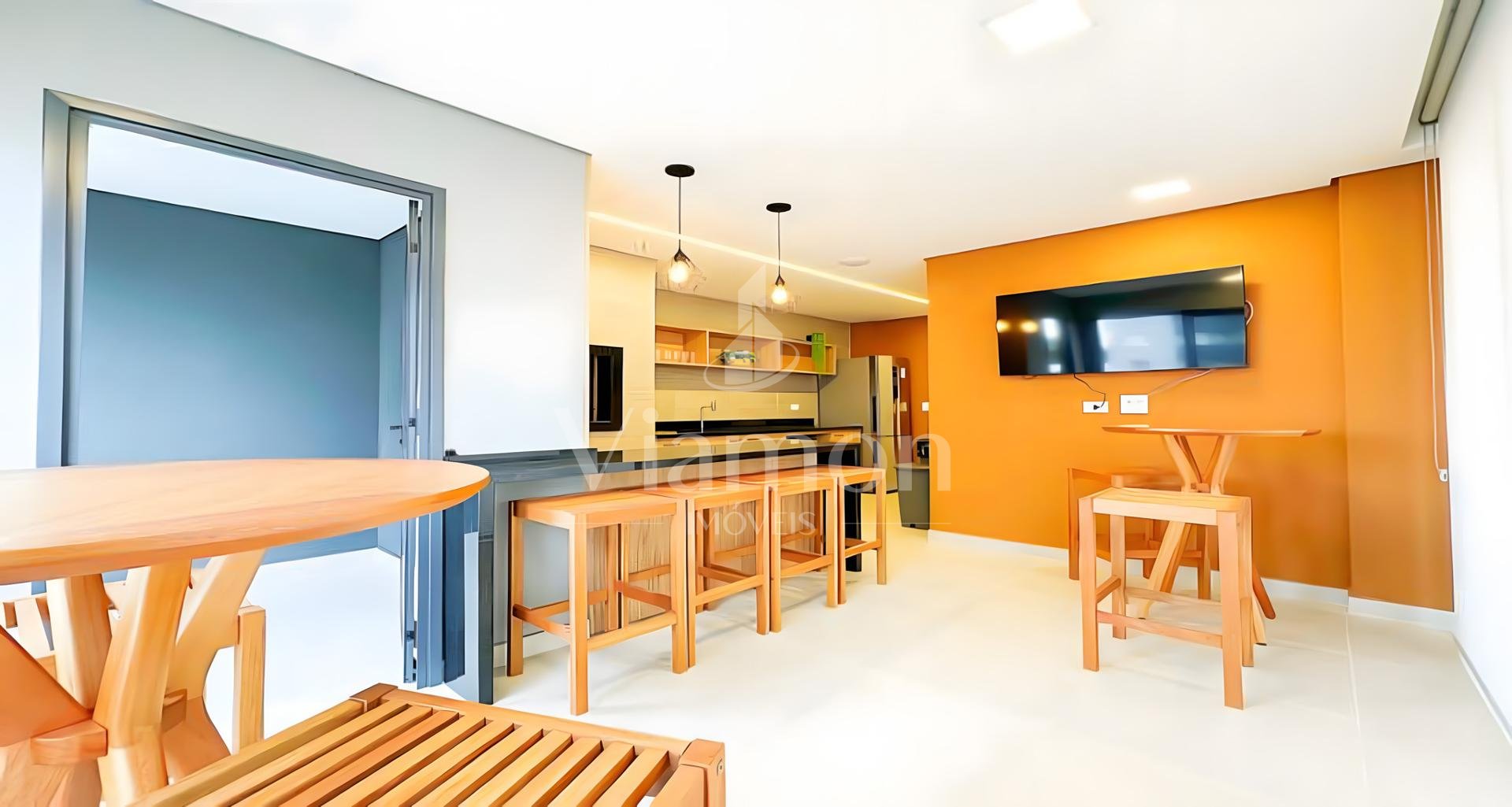 Sala integrada com painel de TV, sofá, armário e bancada;