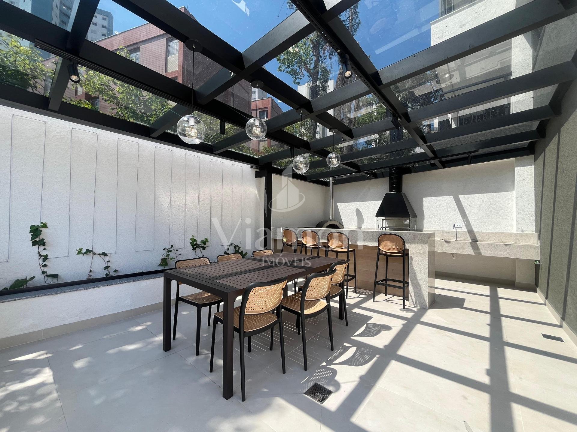 Ampla sacada com churrasqueira a carvão e vista direta para o Jardim Botânico