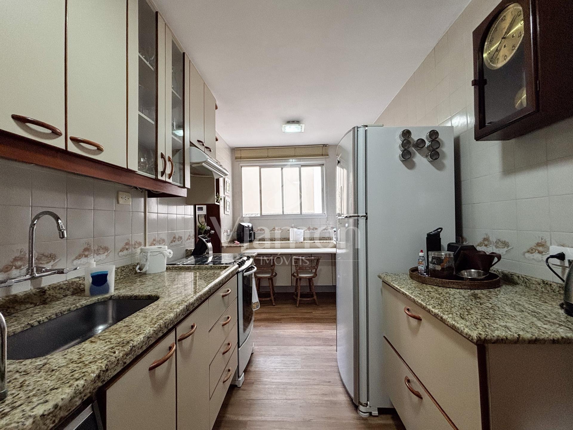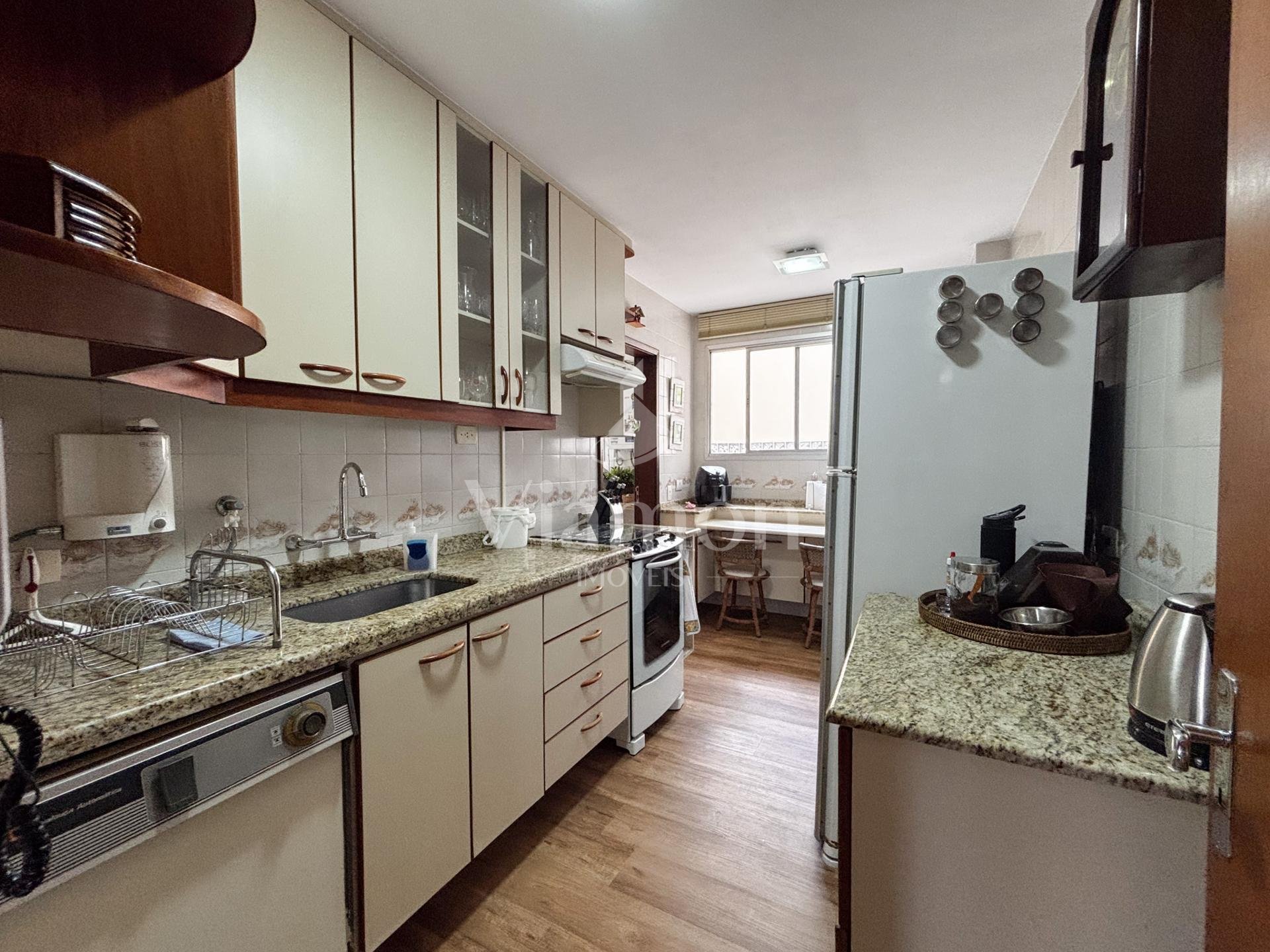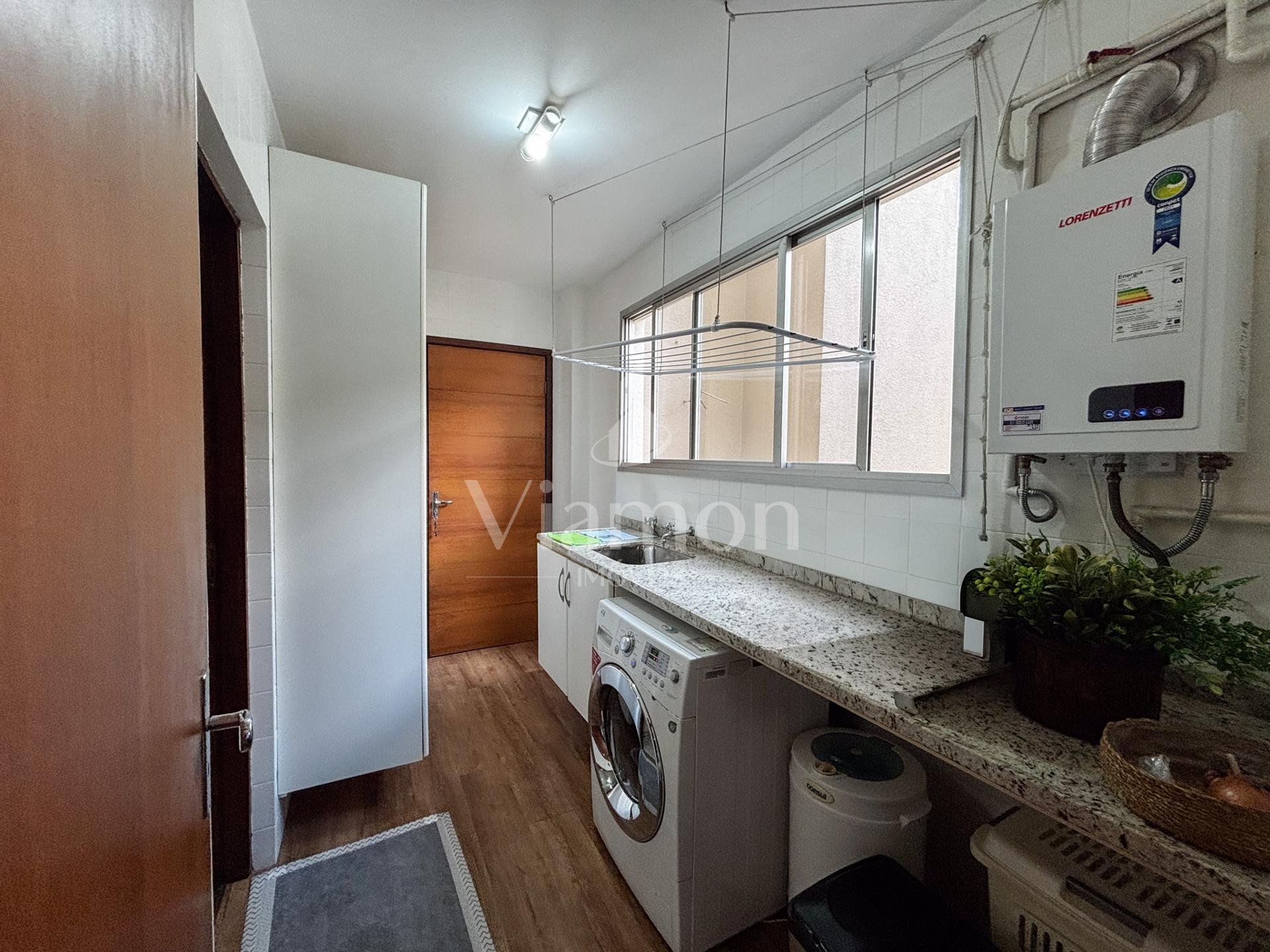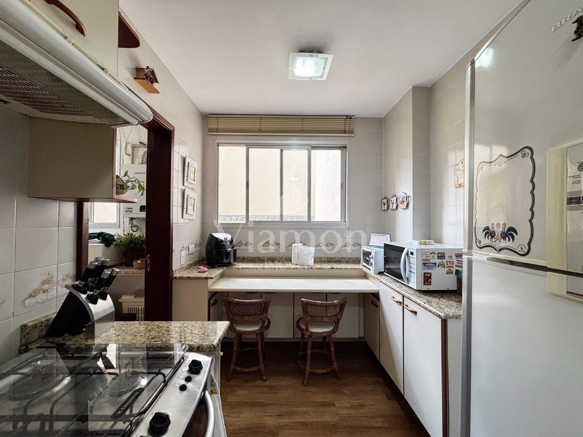 A cozinha é independente, equipada com armários planejados, e integrada à área de serviço ventilada, também com armários. O imóvel ainda oferece banheiro de serviço, despensa com armários e entrada de serviço, garantindo praticidade e melhor organização no dia a dia.