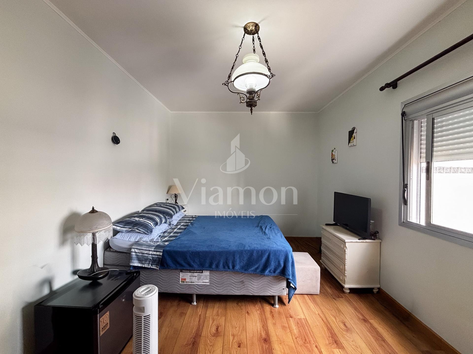 A área social é composta por sala ampla para dois ambientes, com piso de madeira, além de banheiro social.