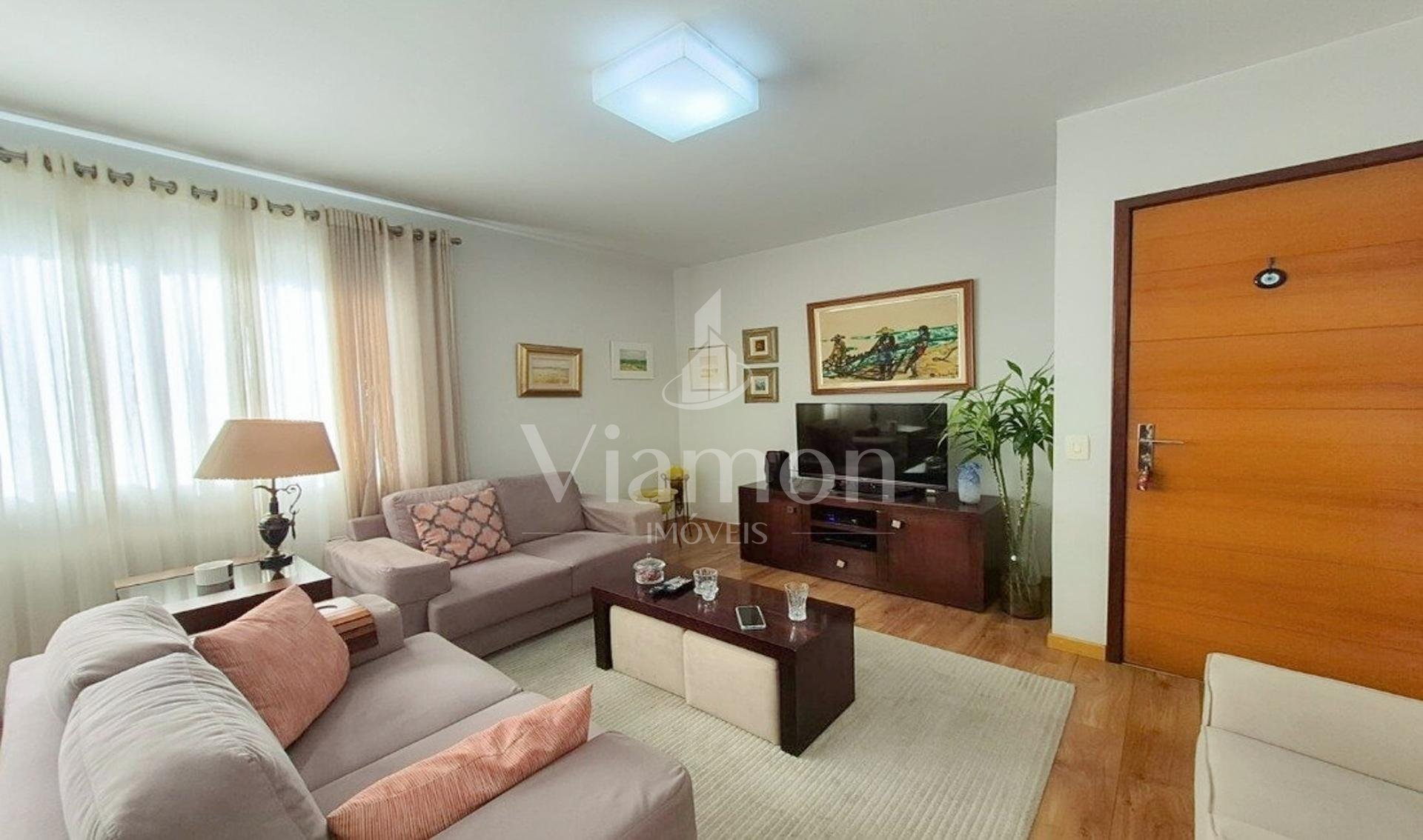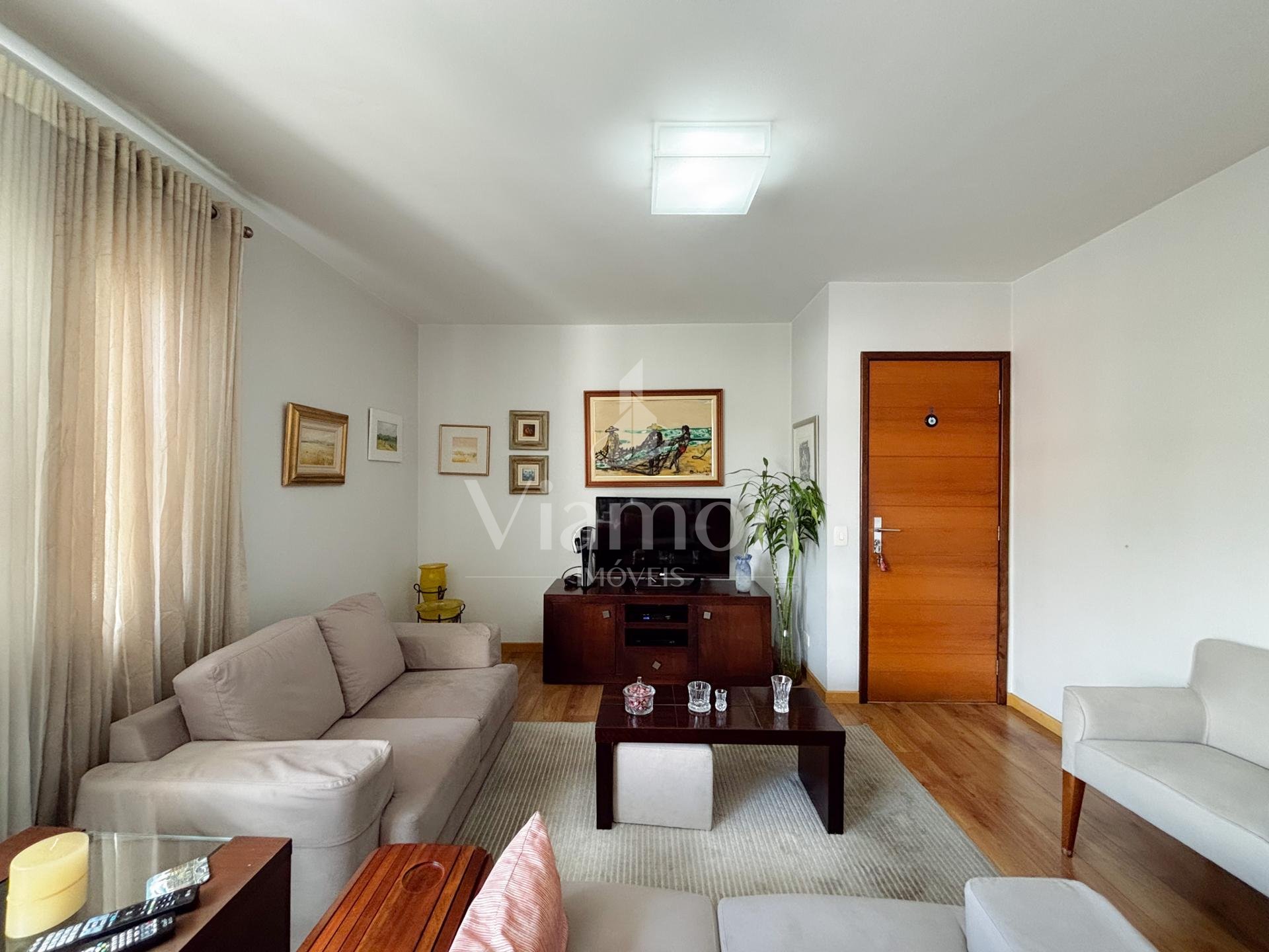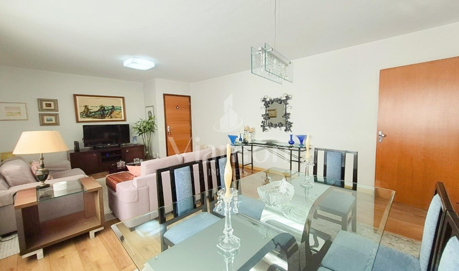 O apartamento possui 114 m² privativos, é semimobiliado, bem iluminado, com sol da tarde, e apresenta uma planta funcional e bem distribuída.