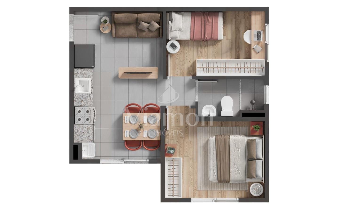 -Unidades de 2 Quartos: Espaços planejados para conforto e funcionalidade.