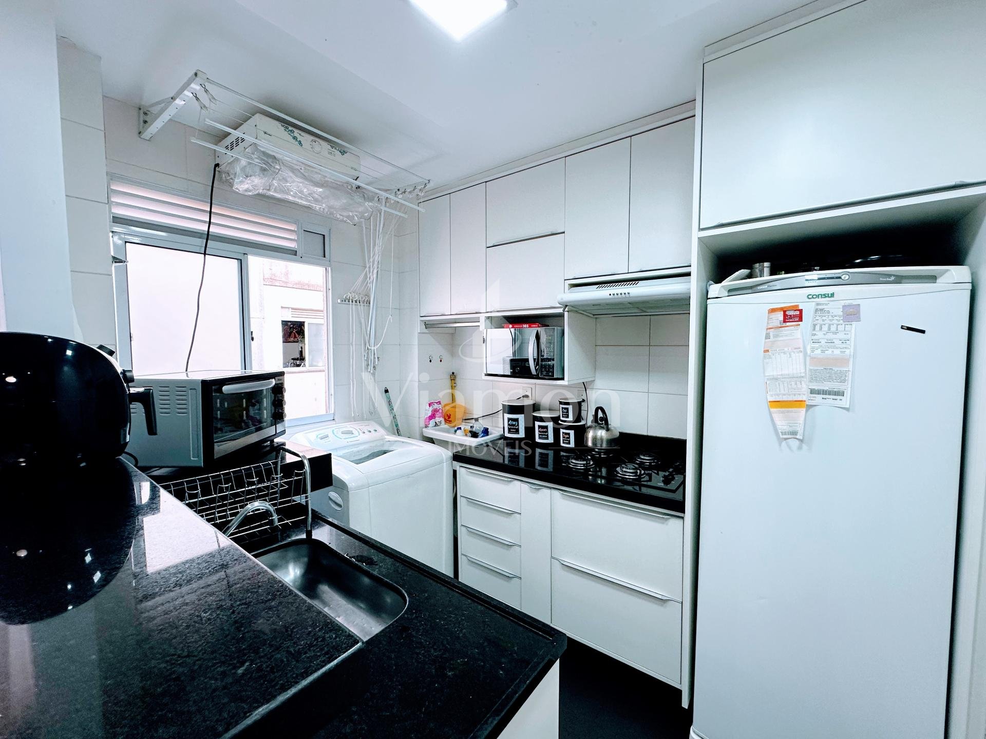 O Apartamento conta com aquecimento a gás na cozinha e banheiro, peitoril das janelas em mármore, piso de porcelanato preto na cozinha e banheiro, piso laminado na área social e quartos, cozinha com armários planejados, pia e bancada em granito, banheiro com armário e box de vidro, teto com rebaixamento em gesso com projeto luminitécnico na sala e cozinha, a sala de estar possui uma da paredes com placas em gesso. O apartamento conta ainda com as janelas dos quartos voltadas para uma das áreas verdes do condomínio, trazendo privacidade e tranquilidade para o seu novo Lar.