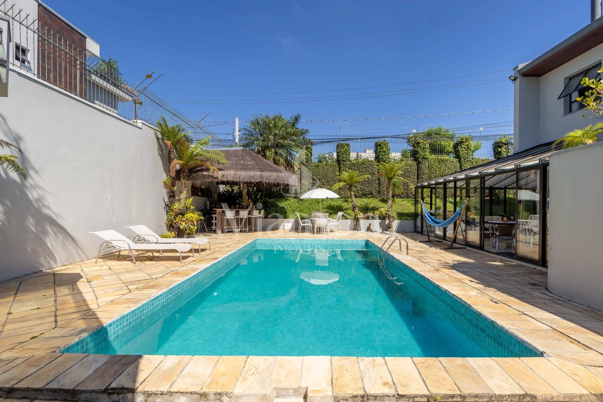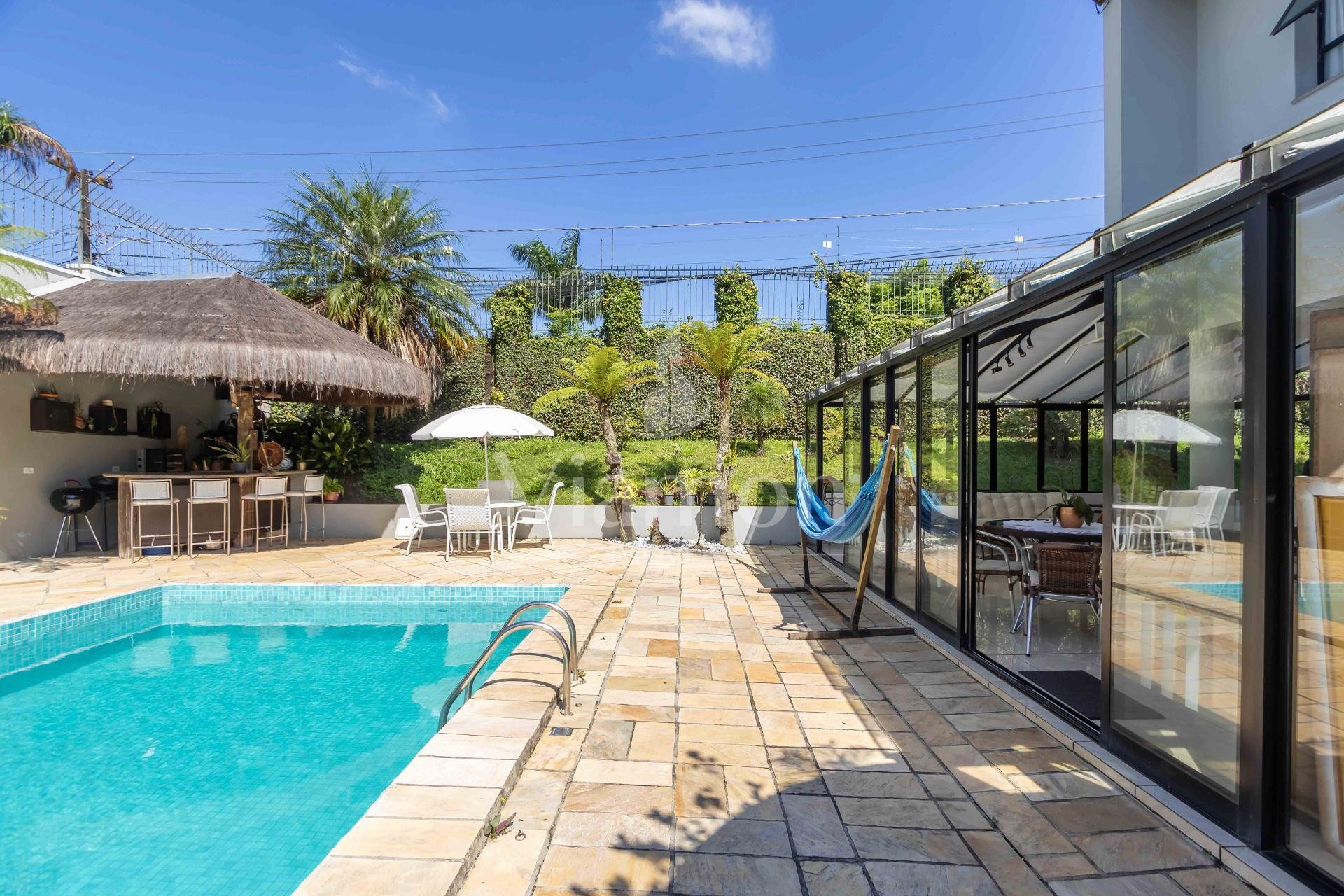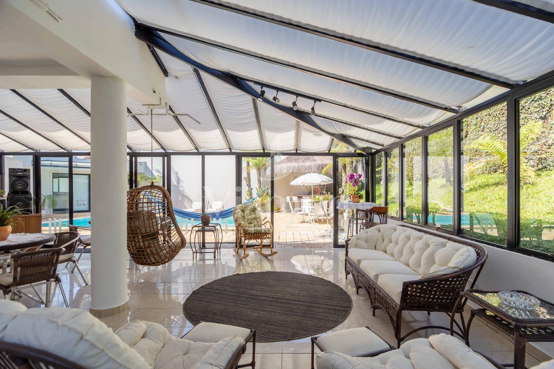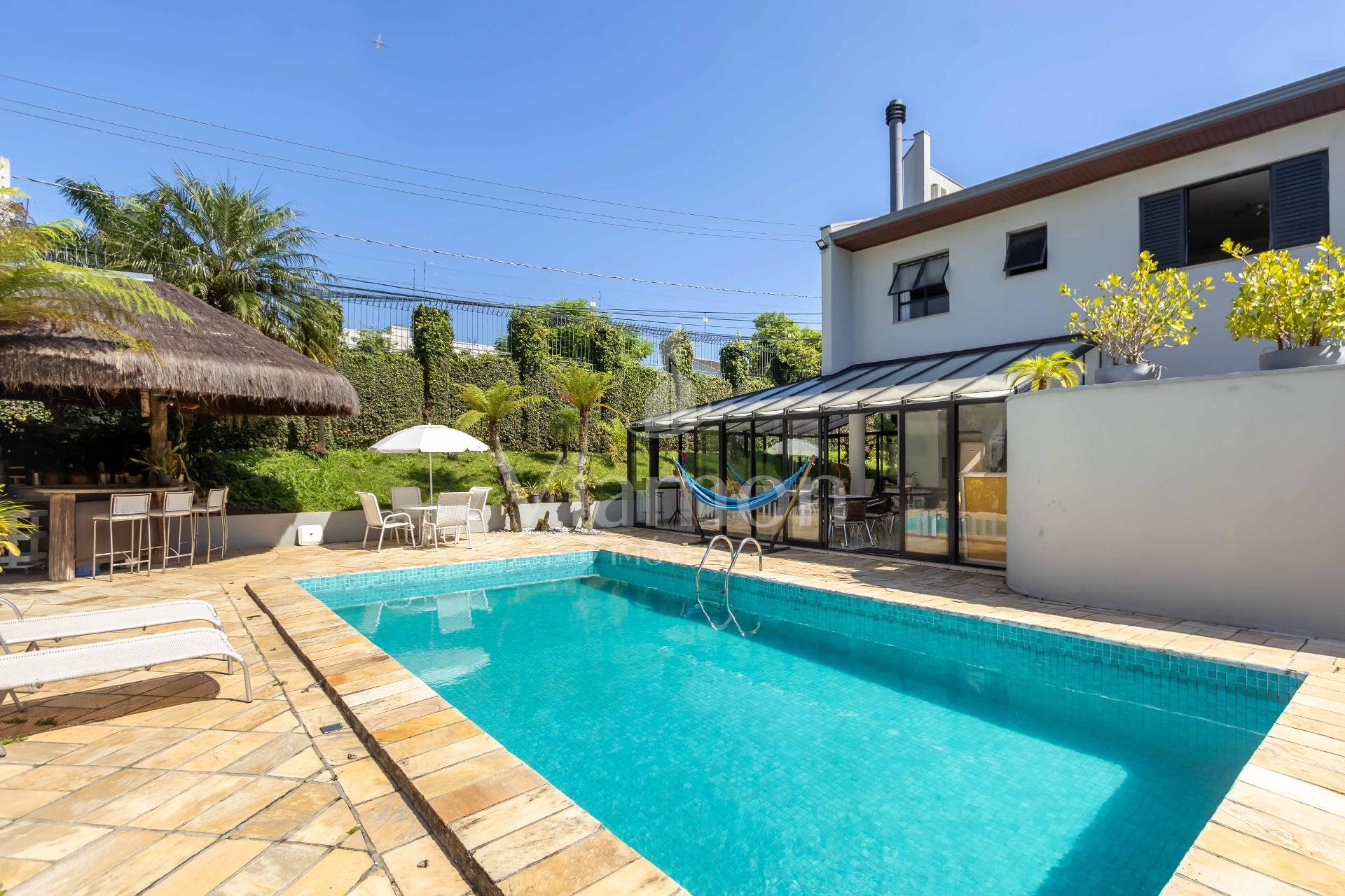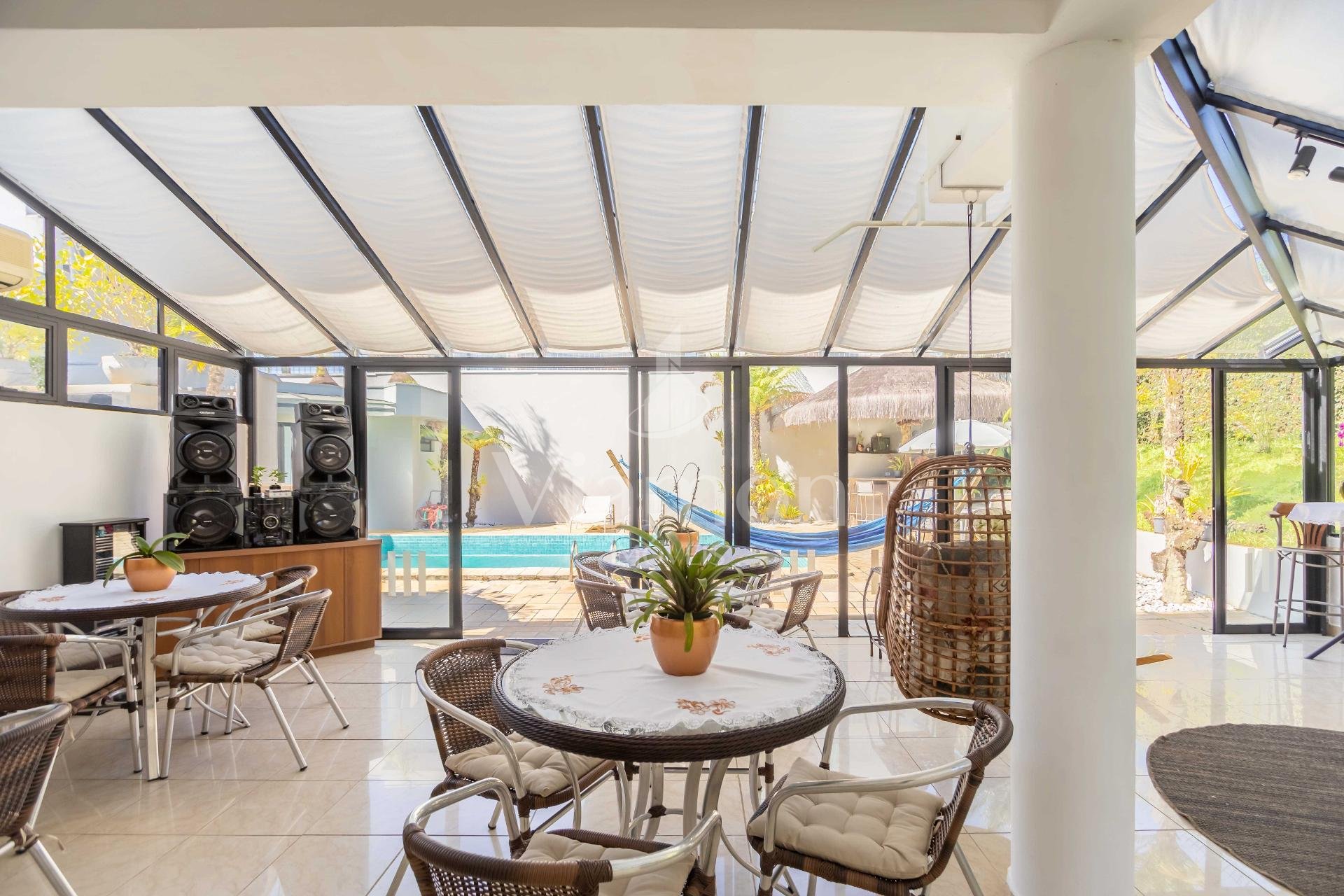 A residência conta ainda com 5 banheiros, 4 vagas de garagem, vestiário completo com chuveiro para atender com praticidade momentos de lazer e piscina, além de acabamentos de altíssimo padrão incluindo pisos de porcelanato premium, esquadrias amplas e infraestrutura pronta para climatização e automação residencial.