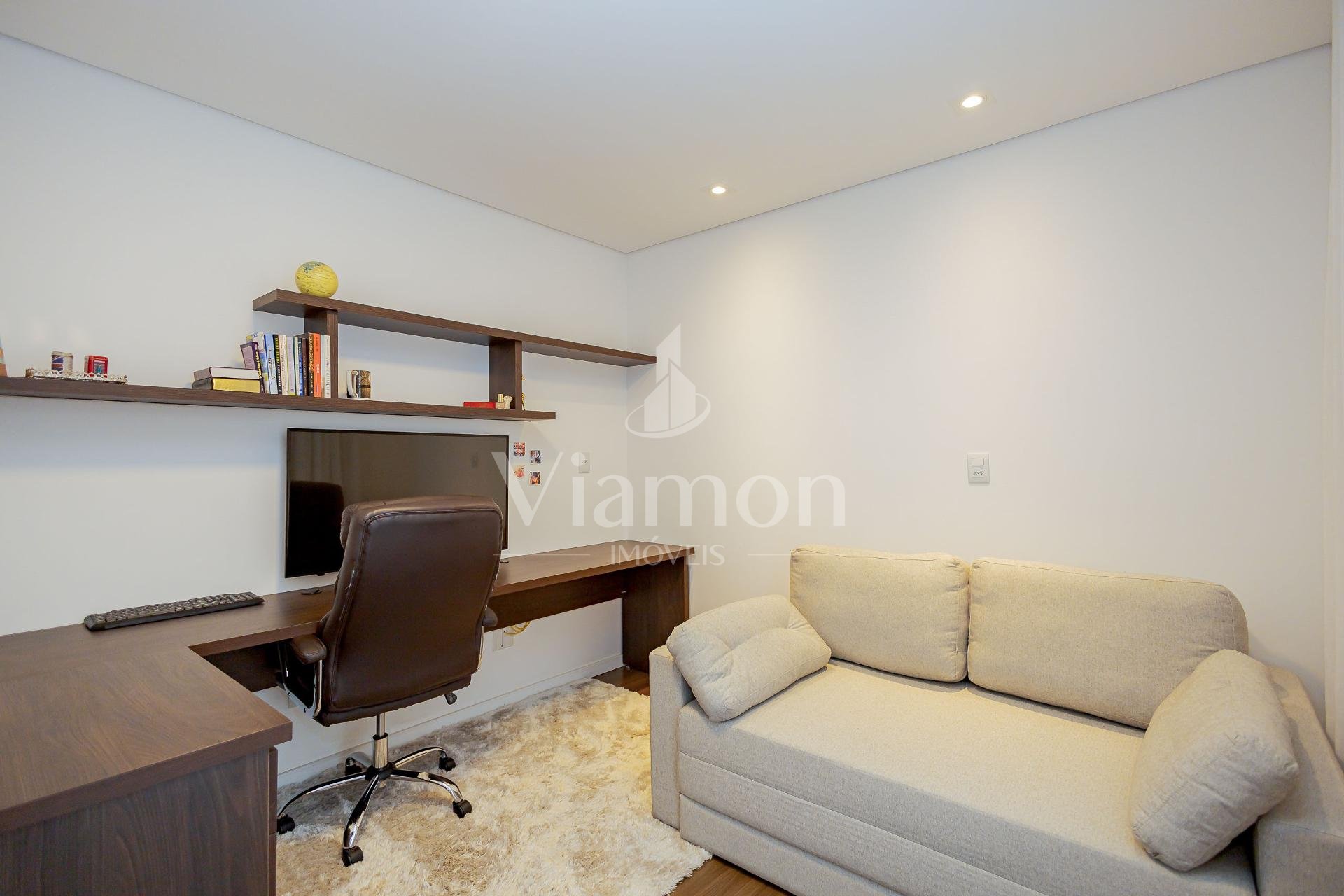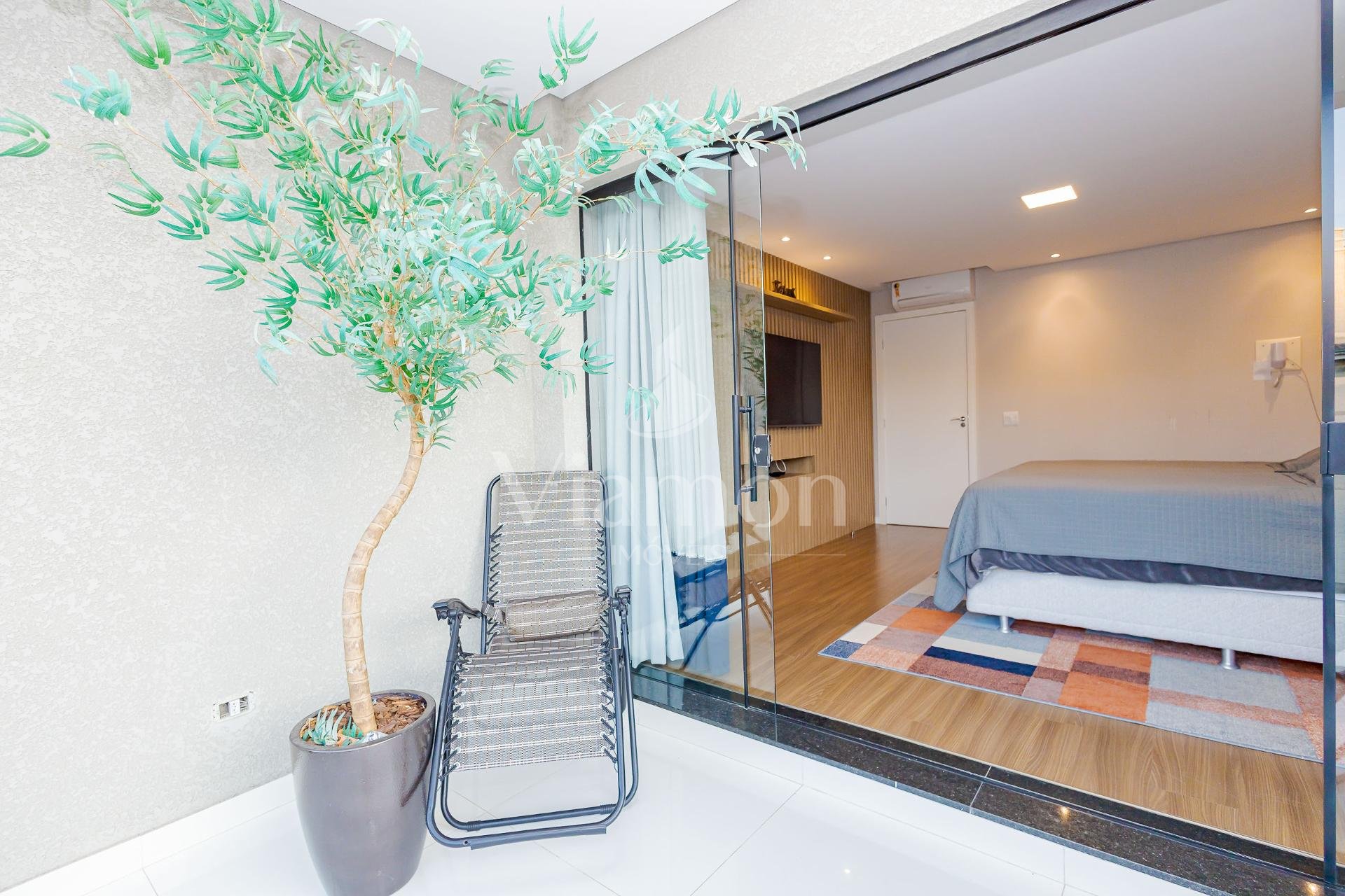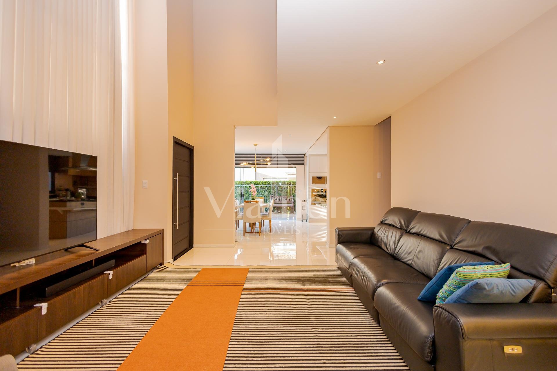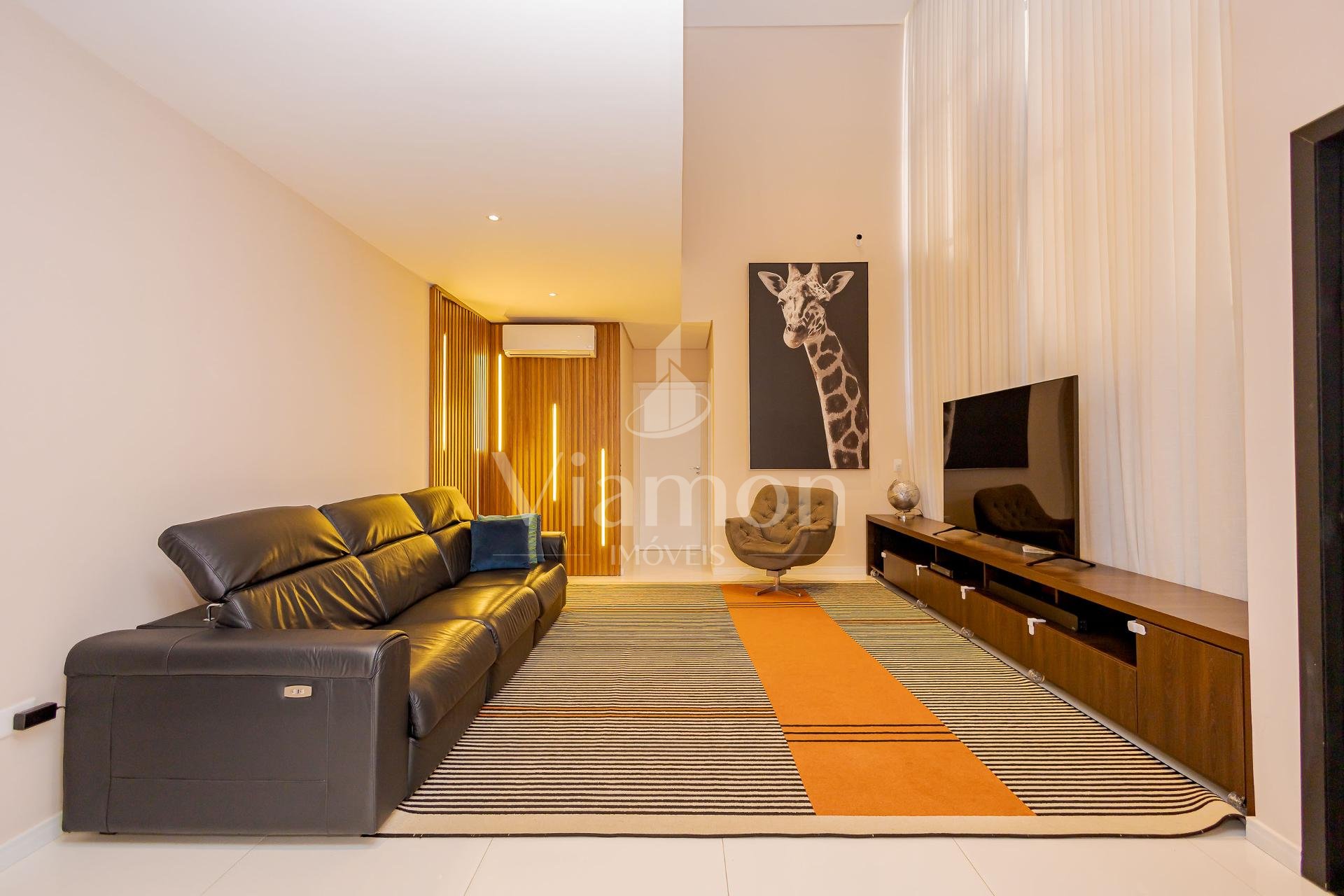 * No piso térreo a sala com pé direito duplo e um mezanino que garante excelente iluminação natural