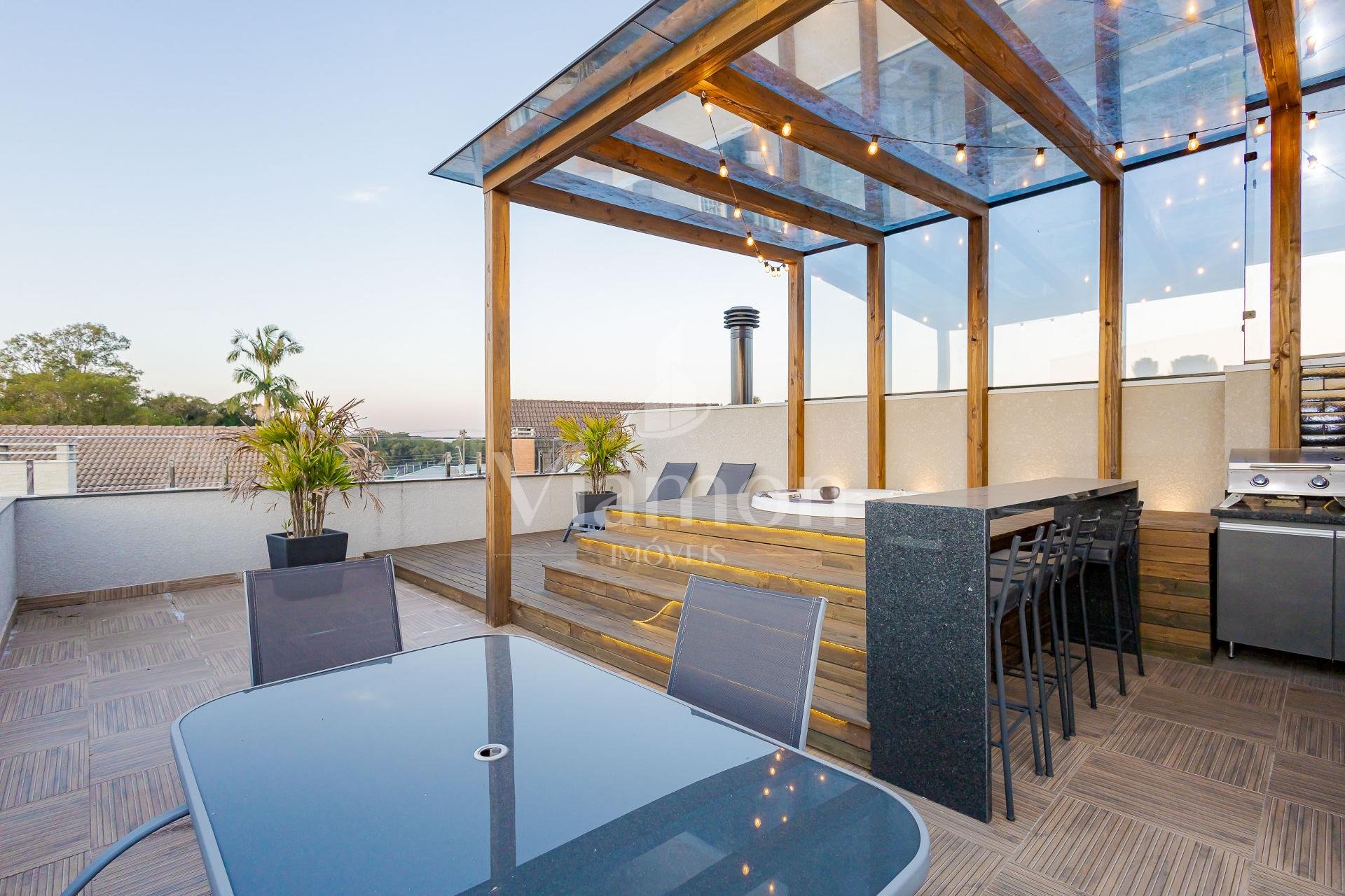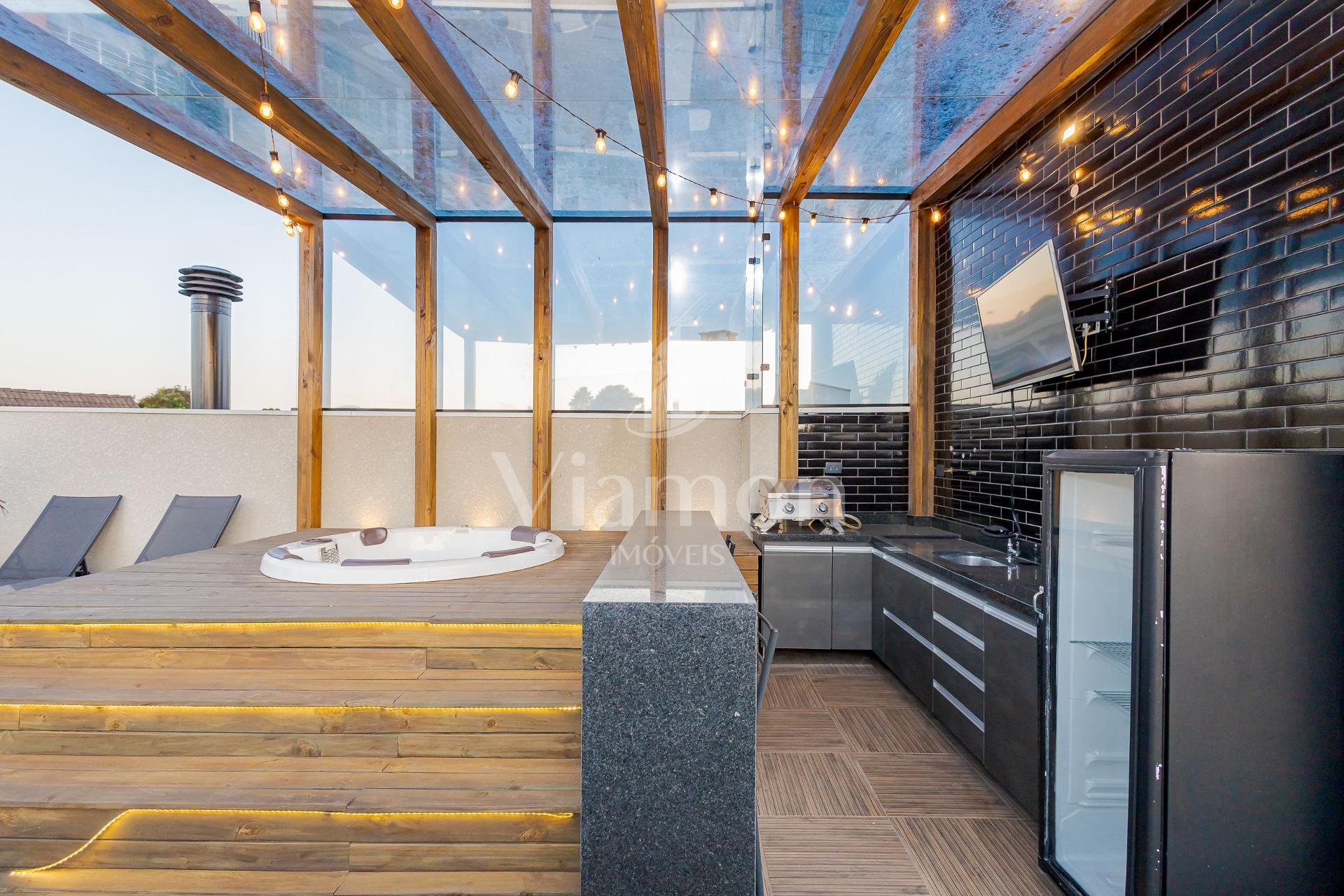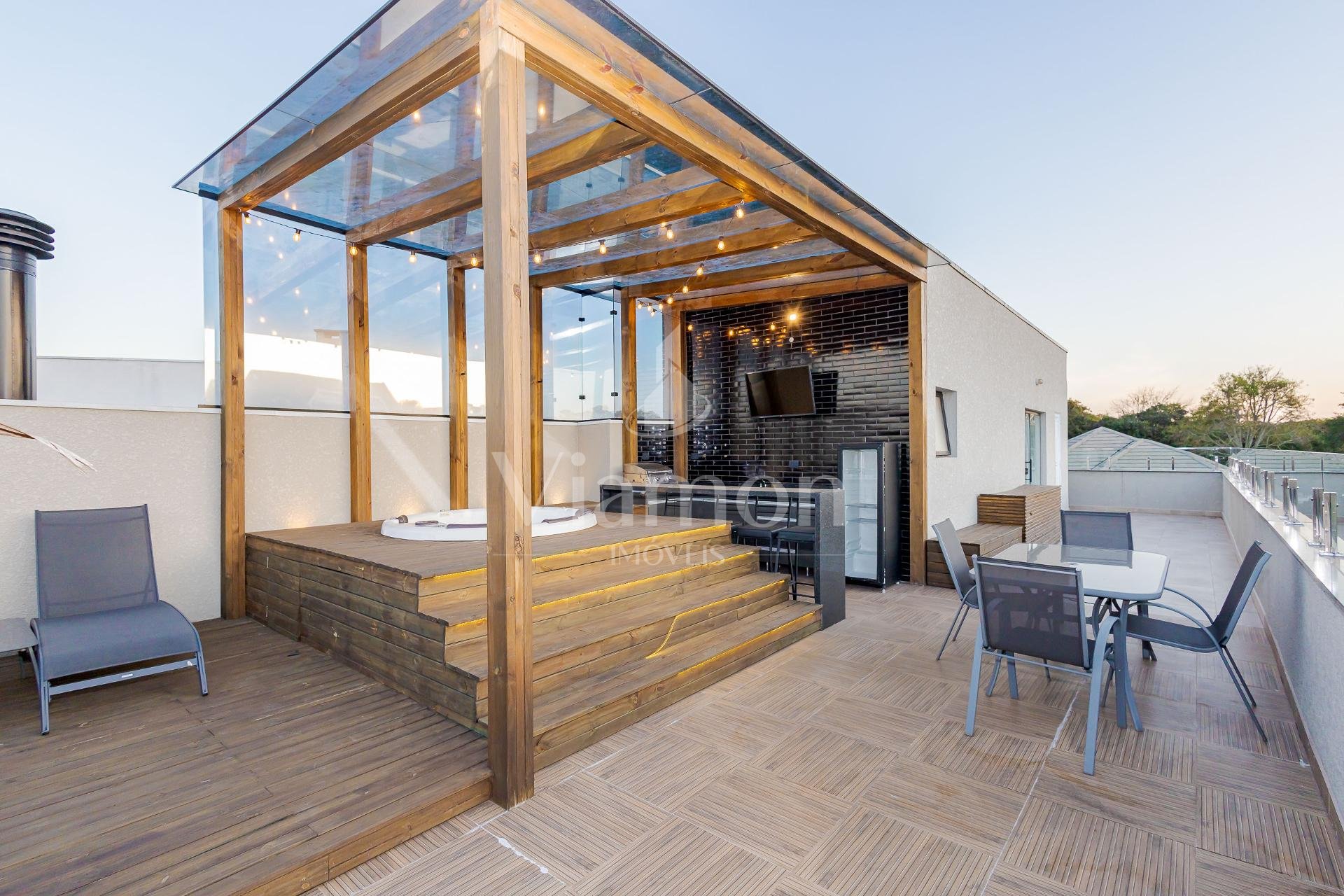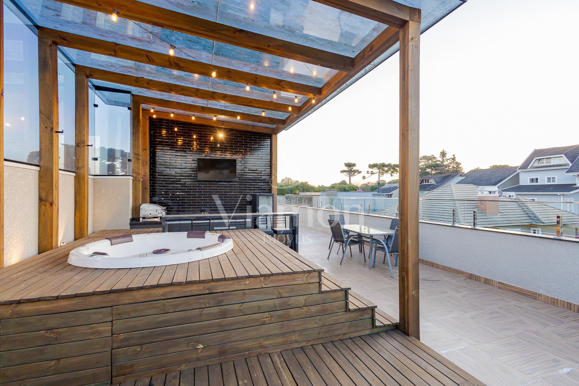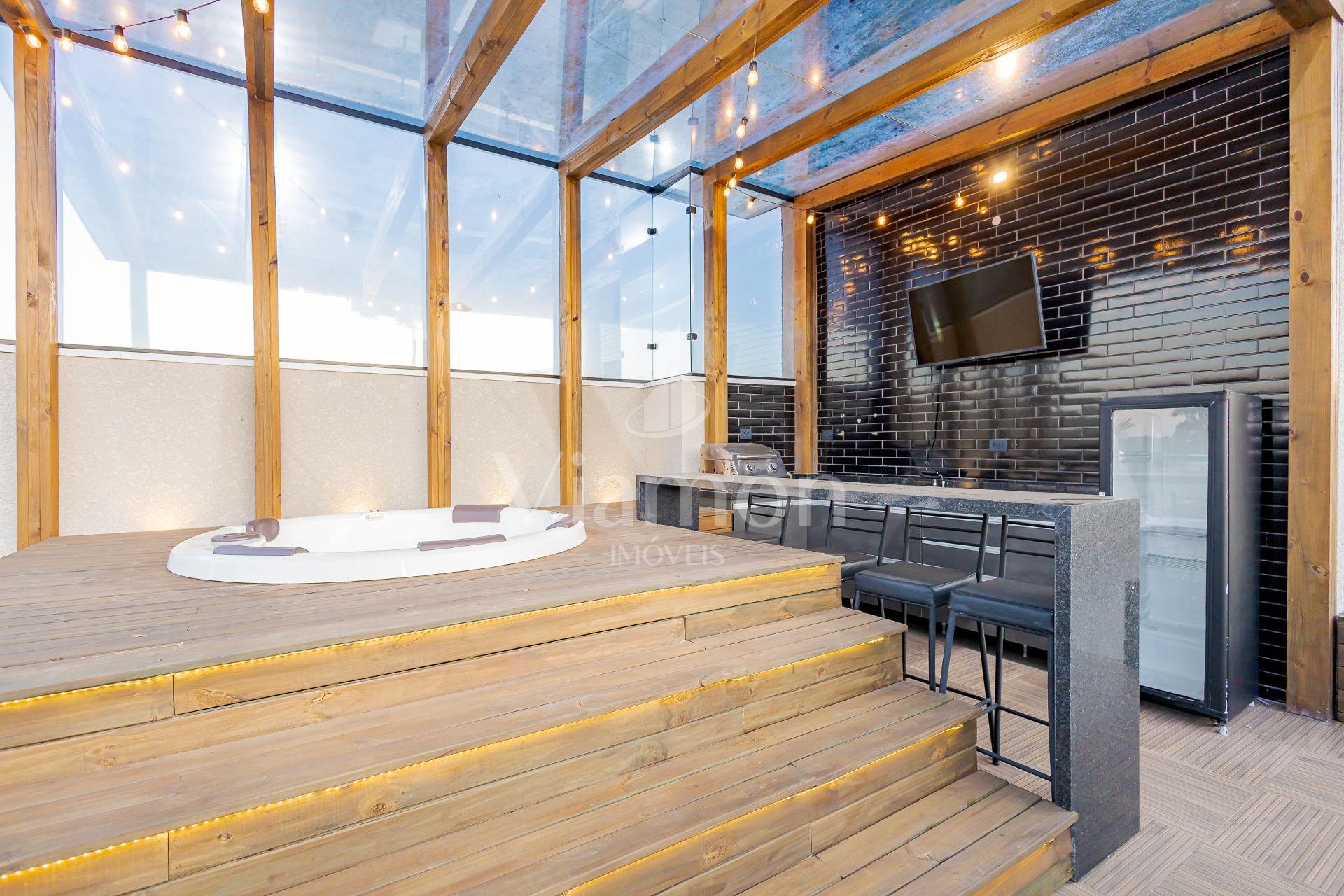 * O terraço é um espetáculo à parte com a JACUZZI em um charmoso deck de madeira ao lado de um espaço gourmet coberto, além de um generoso espaço descoberto
