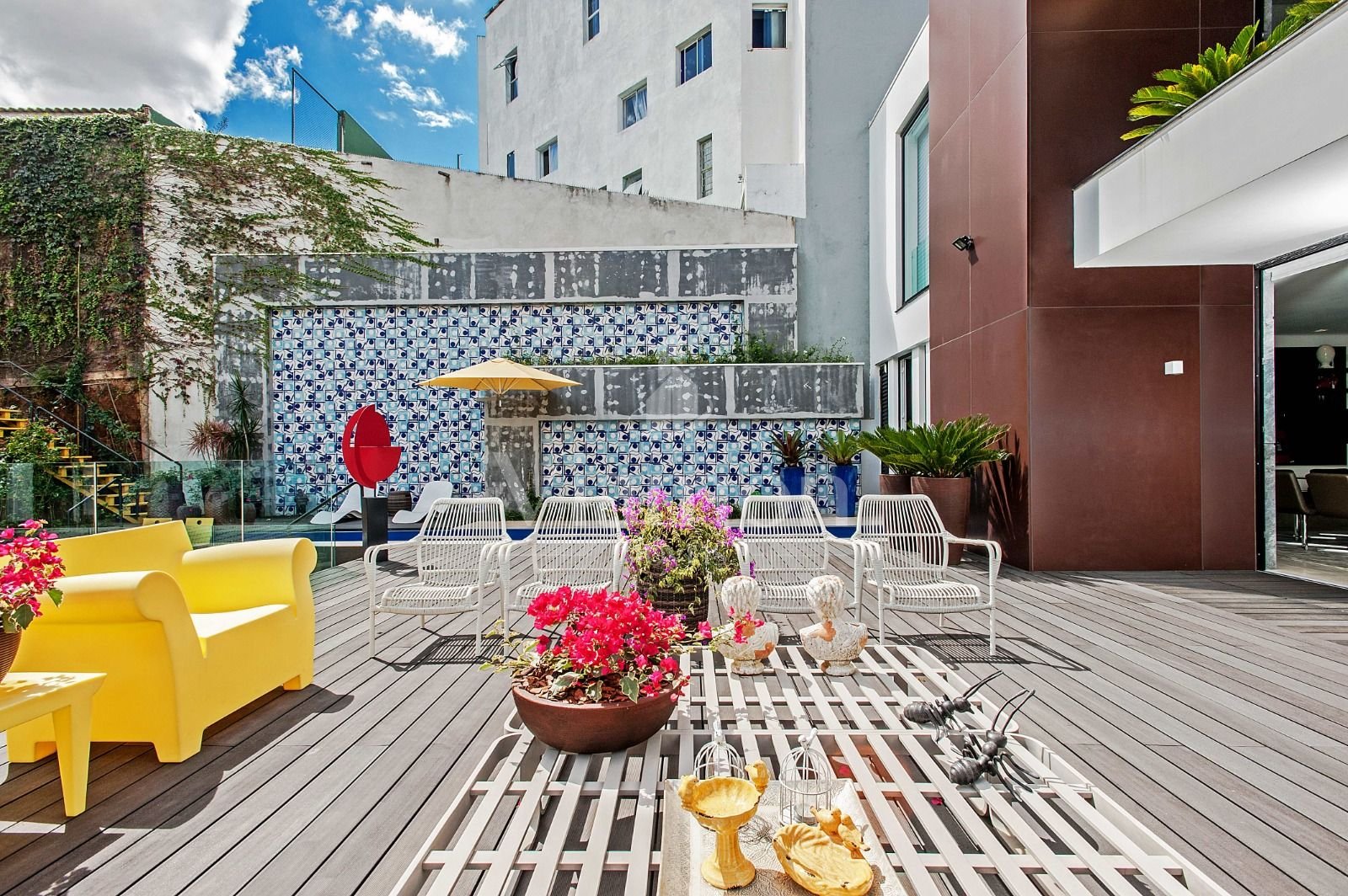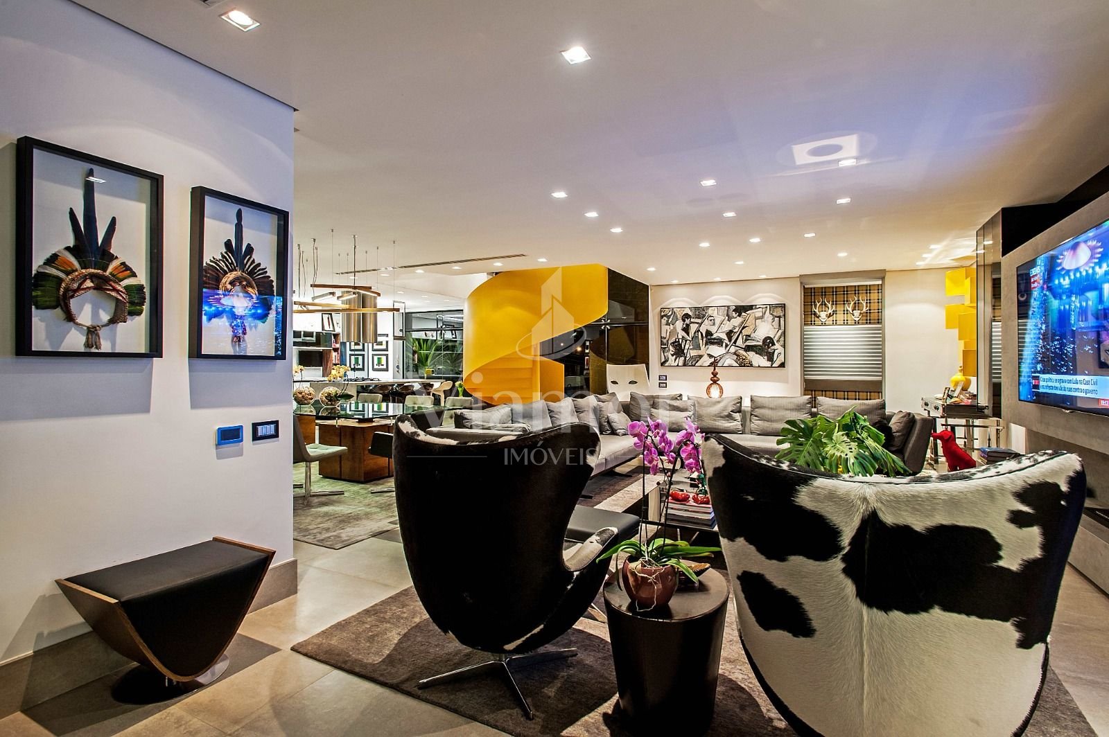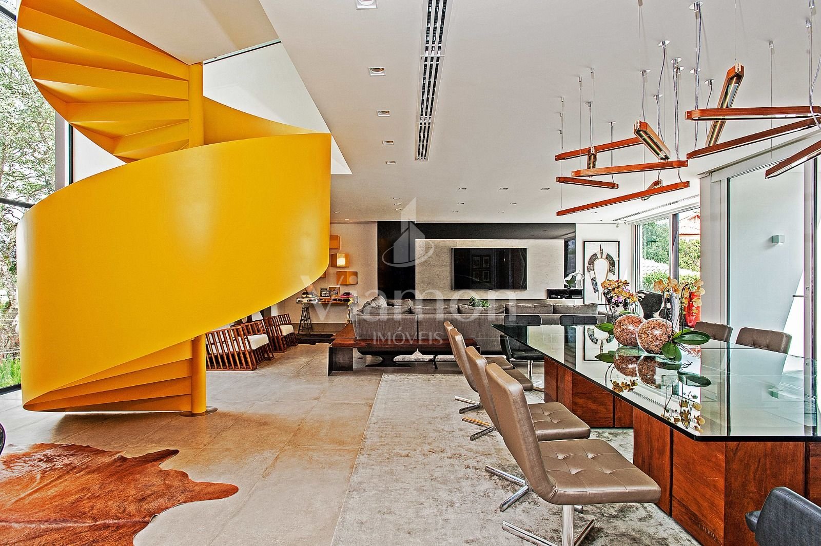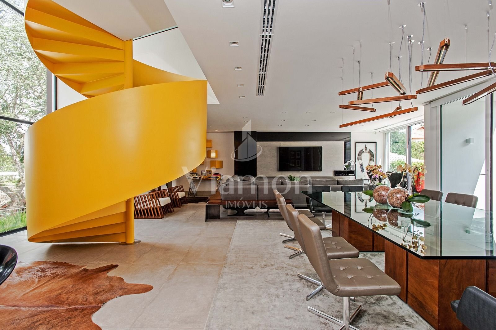 Escada amarela e objetos de design que evidenciam bom gosto e exclusividade.