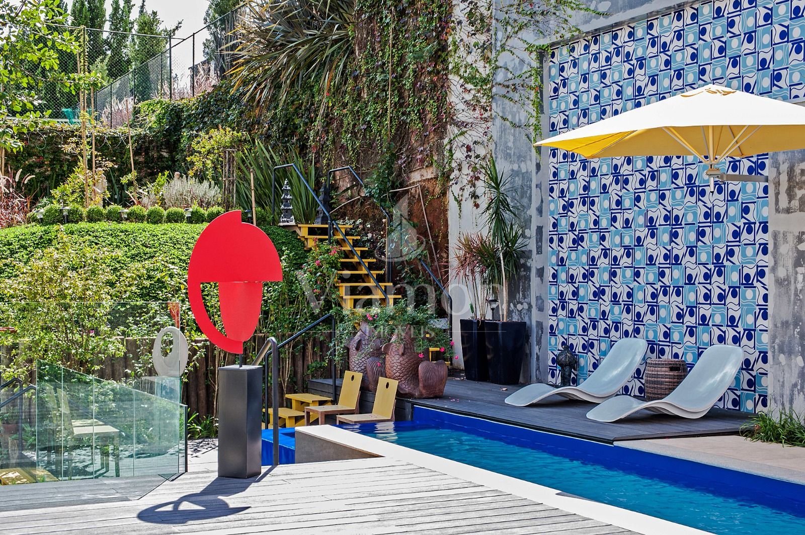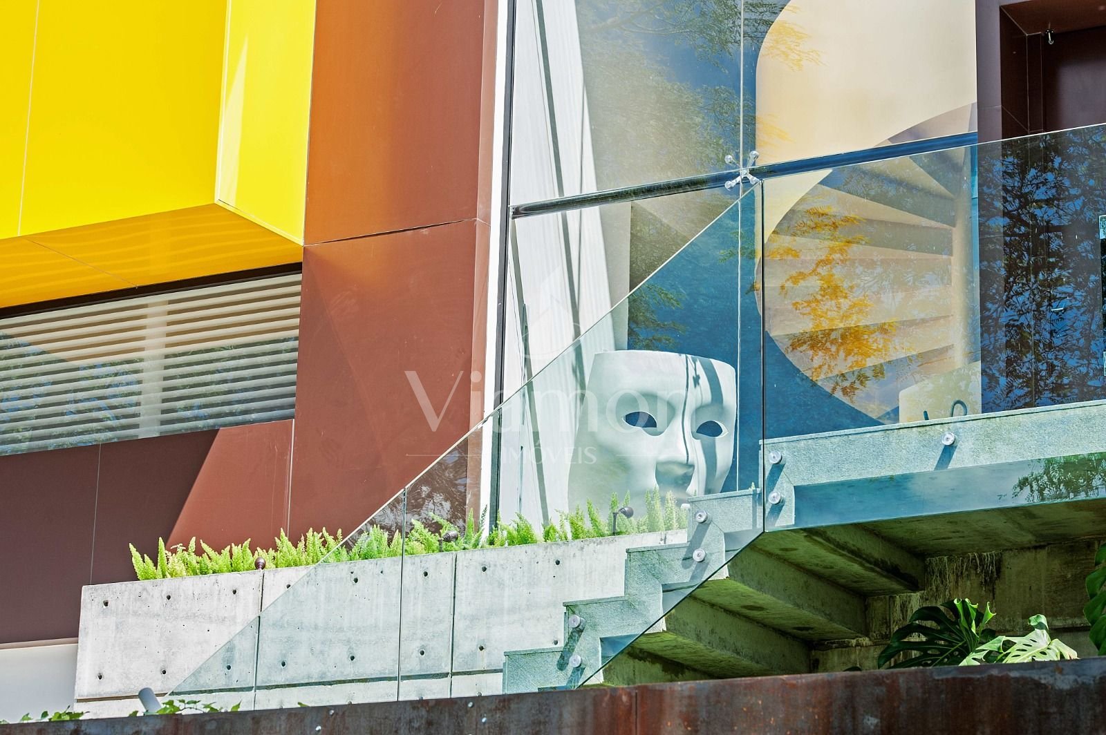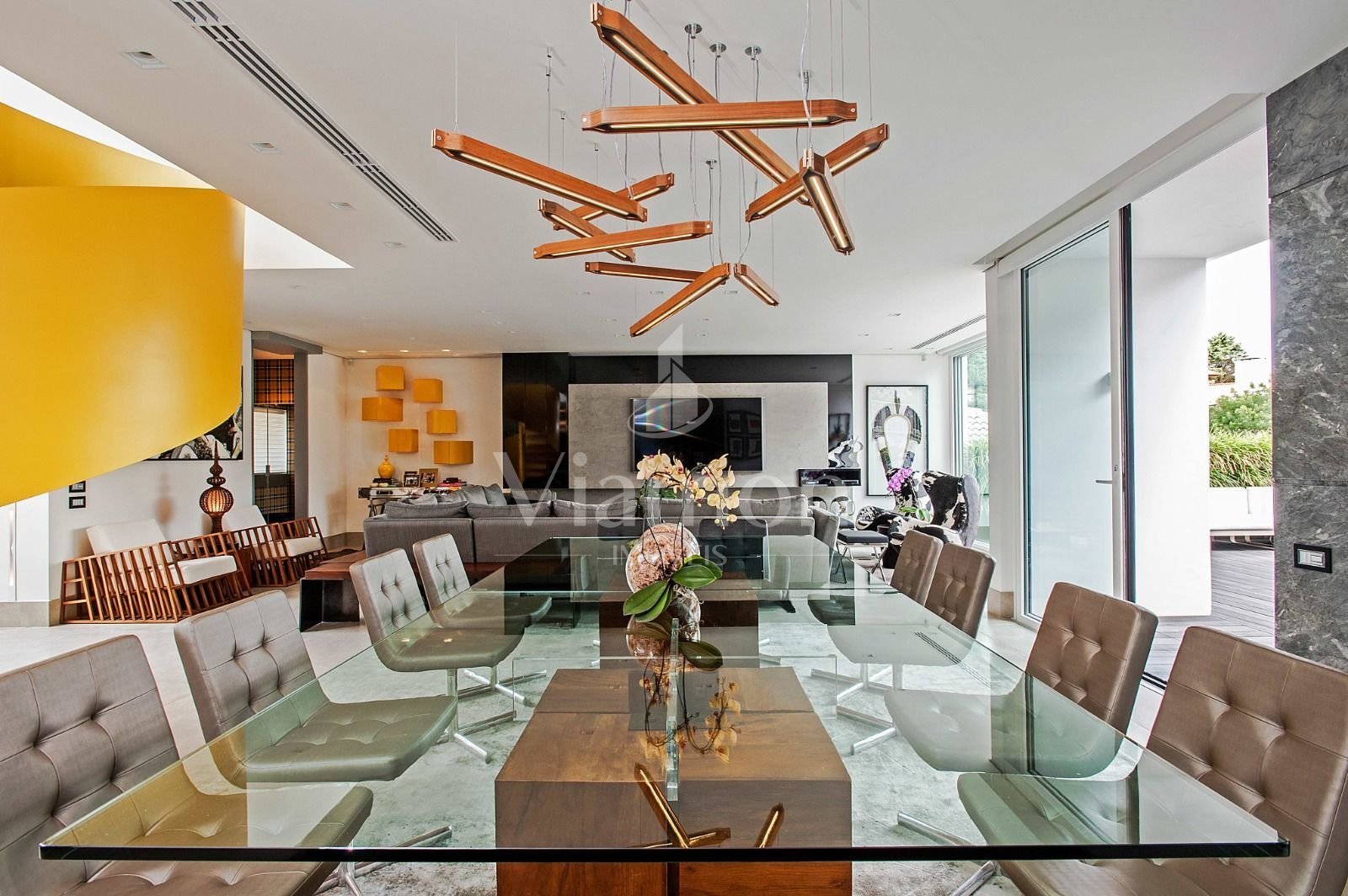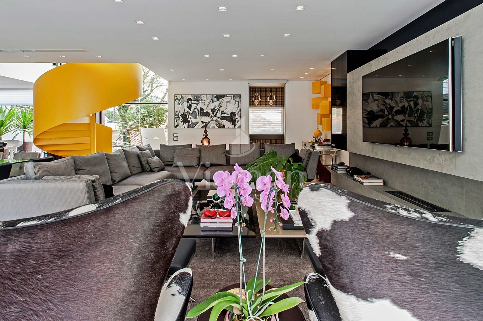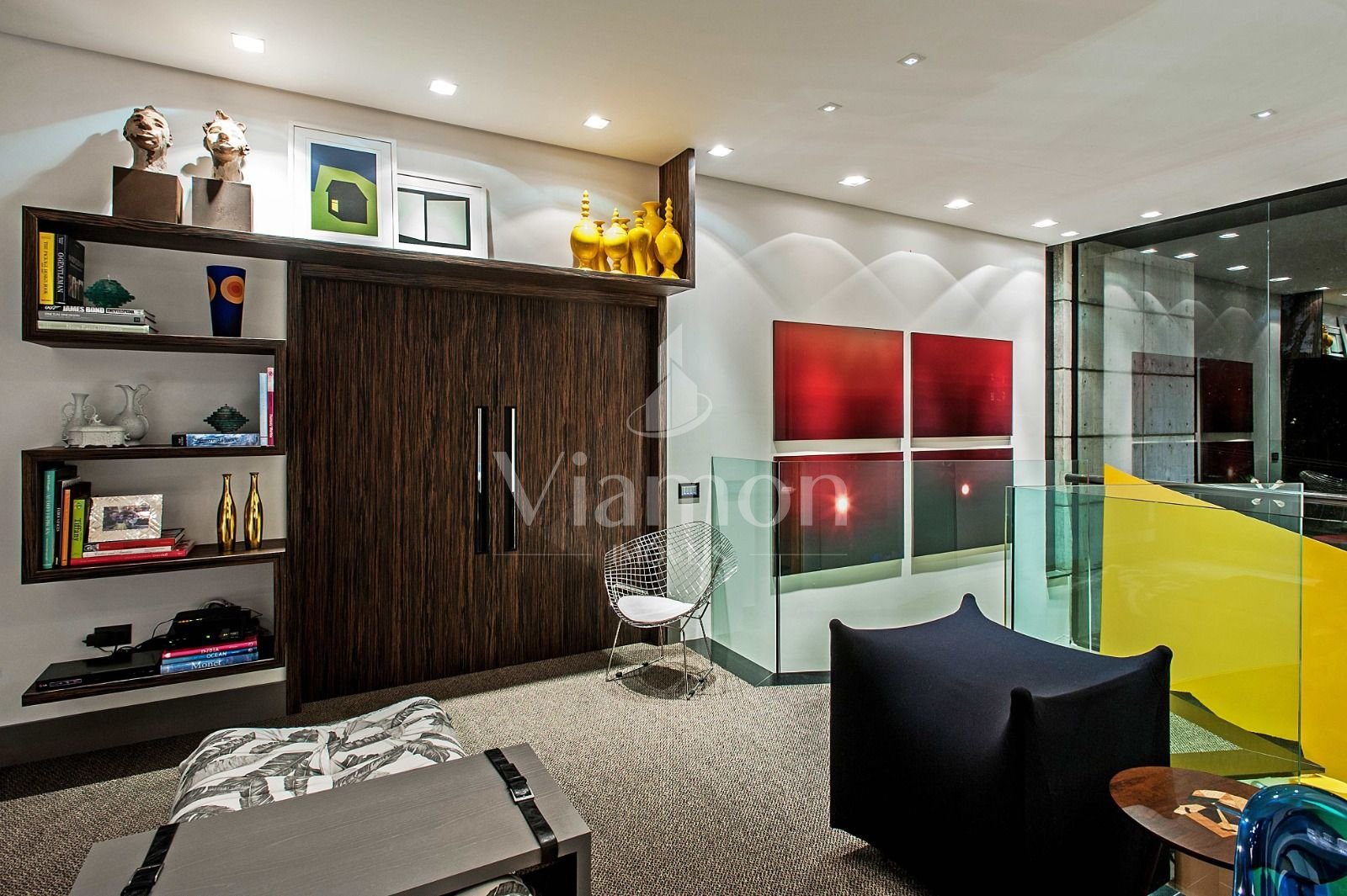 Escada amarela e objetos de design que evidenciam bom gosto e exclusividade.