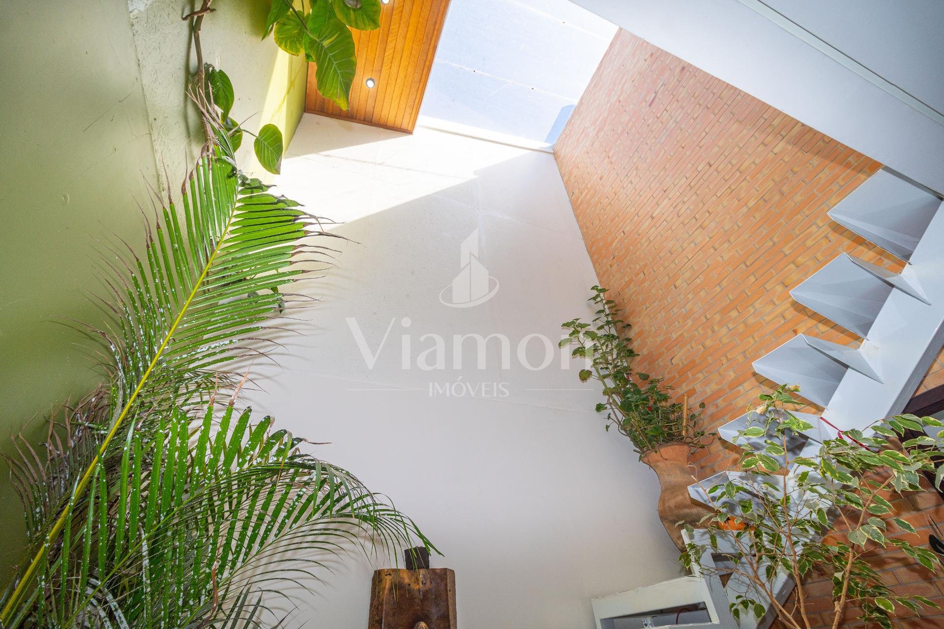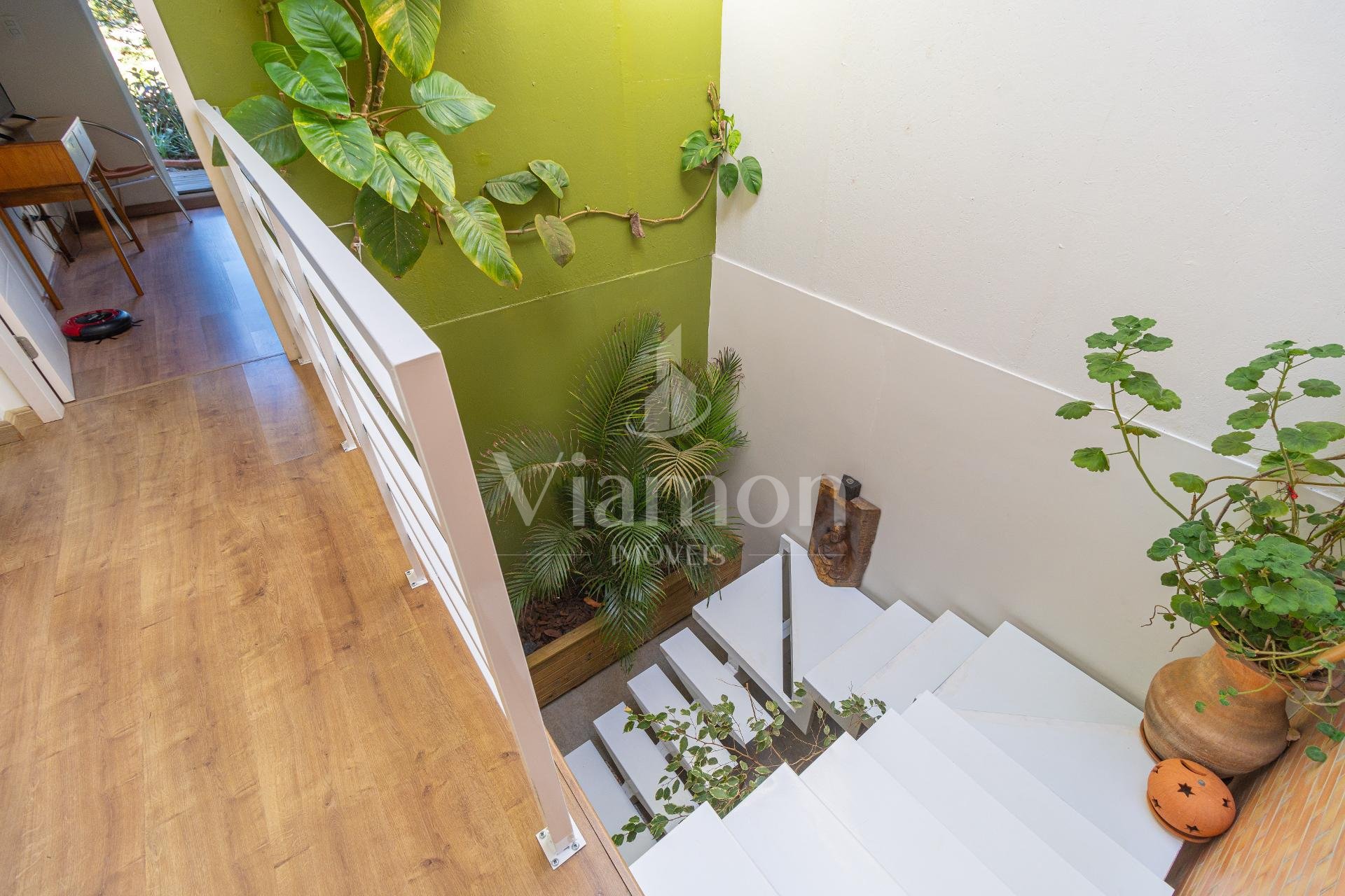 A escada com mezanino e o telhado de vidro valorizam o projeto arquitetônico, ampliando a entrada de luz natural e trazendo leveza aos ambientes. Os amplos terraços com paisagismo reforçam a conexão com o exterior e elevam a sensação de bem-estar.
