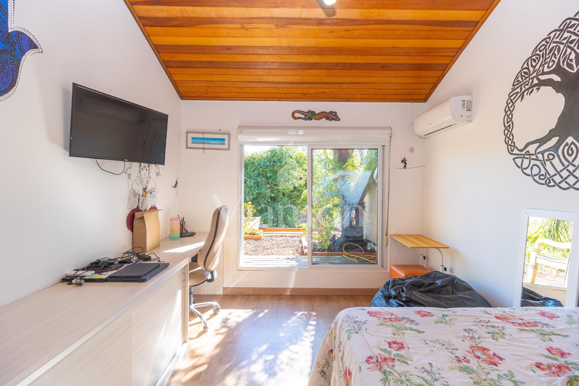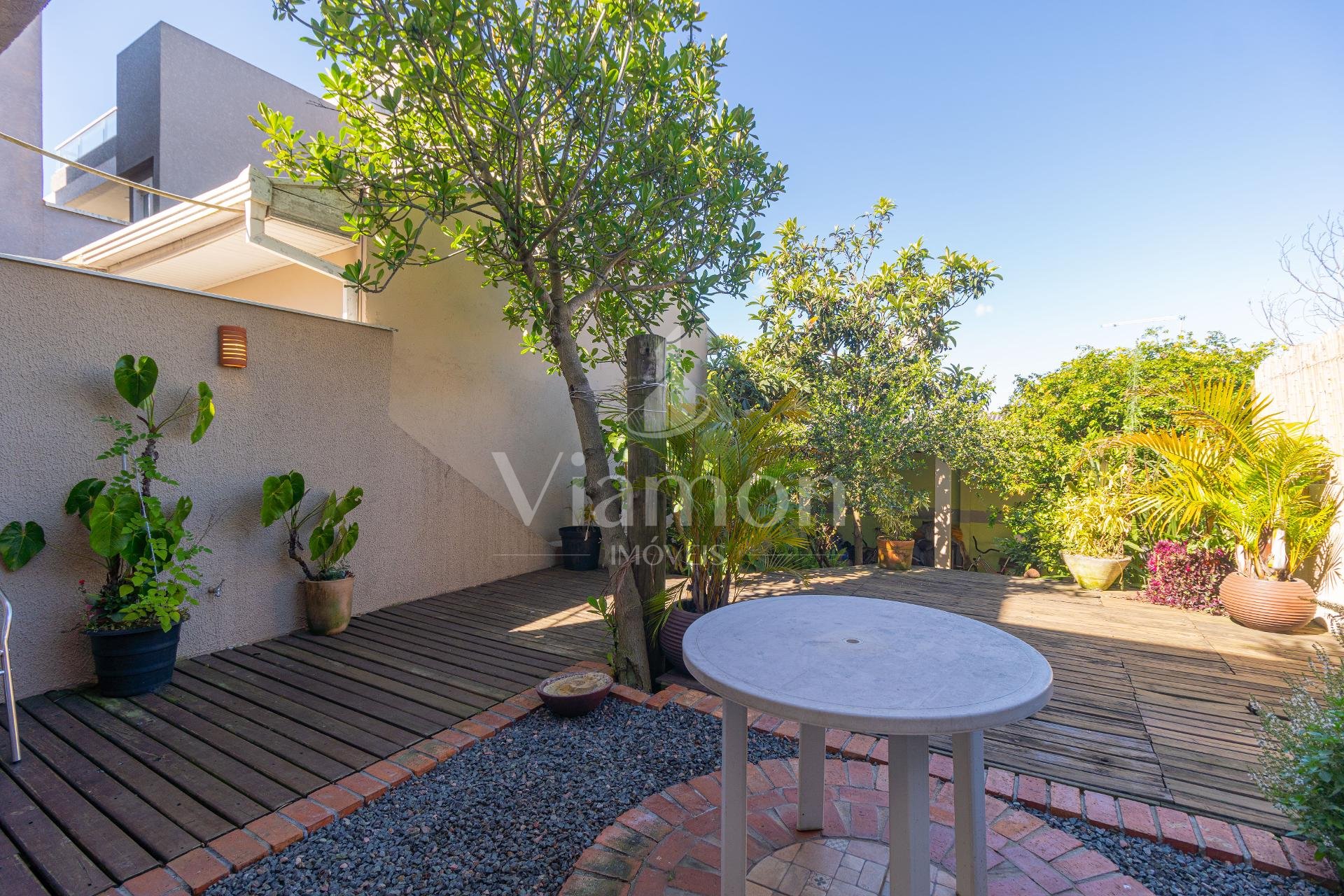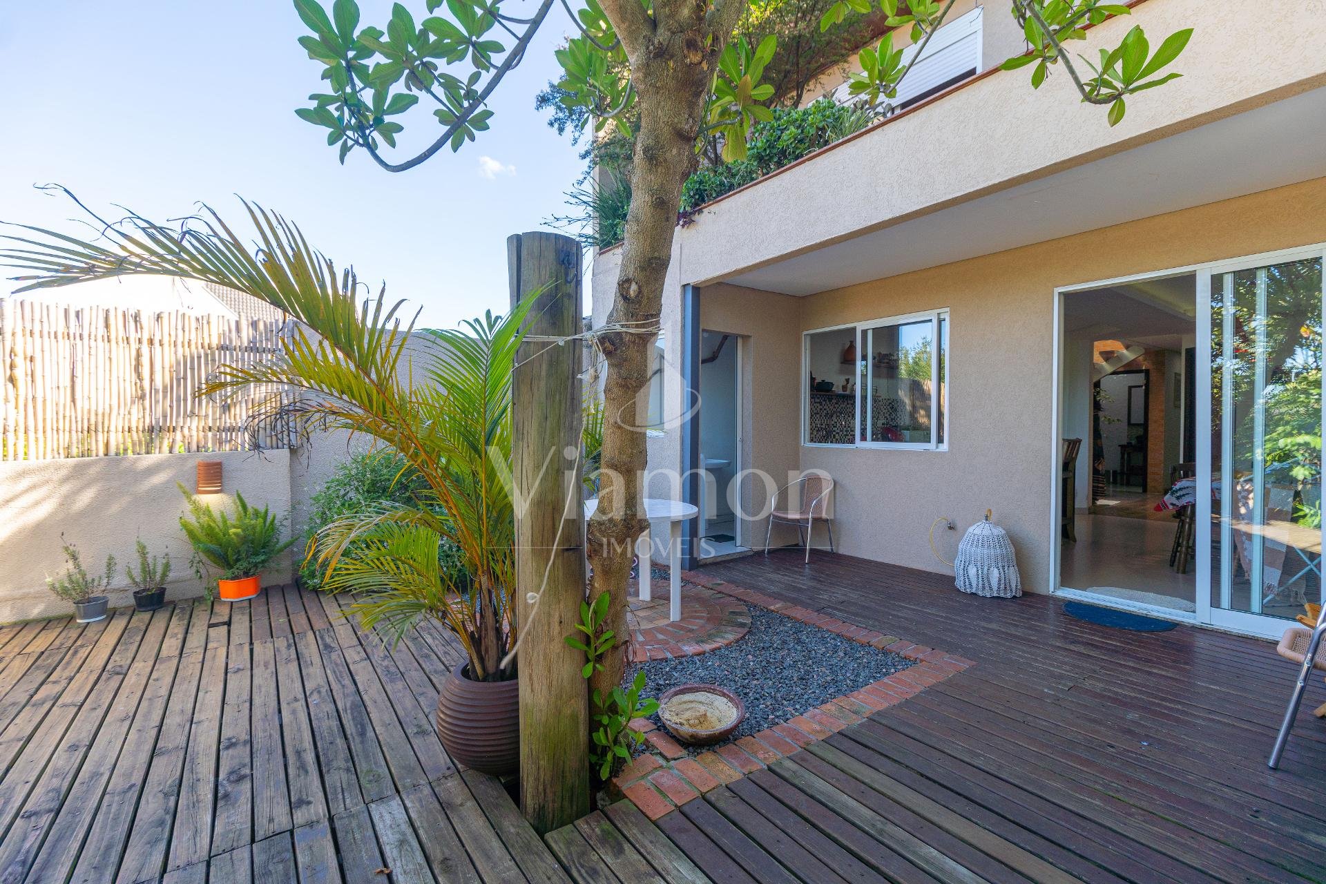 A área externa convida a momentos de lazer e descanso, com deck em madeira, quintal com árvores frutíferas e edícula com churrasqueira, criando um espaço acolhedor para receber amigos e familiares.