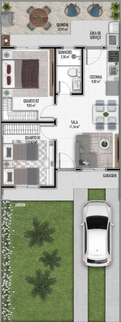 Com 42 m² de área privativa, cada casa oferece um projeto inteligente, que inclui cozinha, sala de estar, quarto de casal, quarto de solteiro, banheiro, quintal e vaga de garagem, garantindo funcionalidade e conforto para o cotidiano.