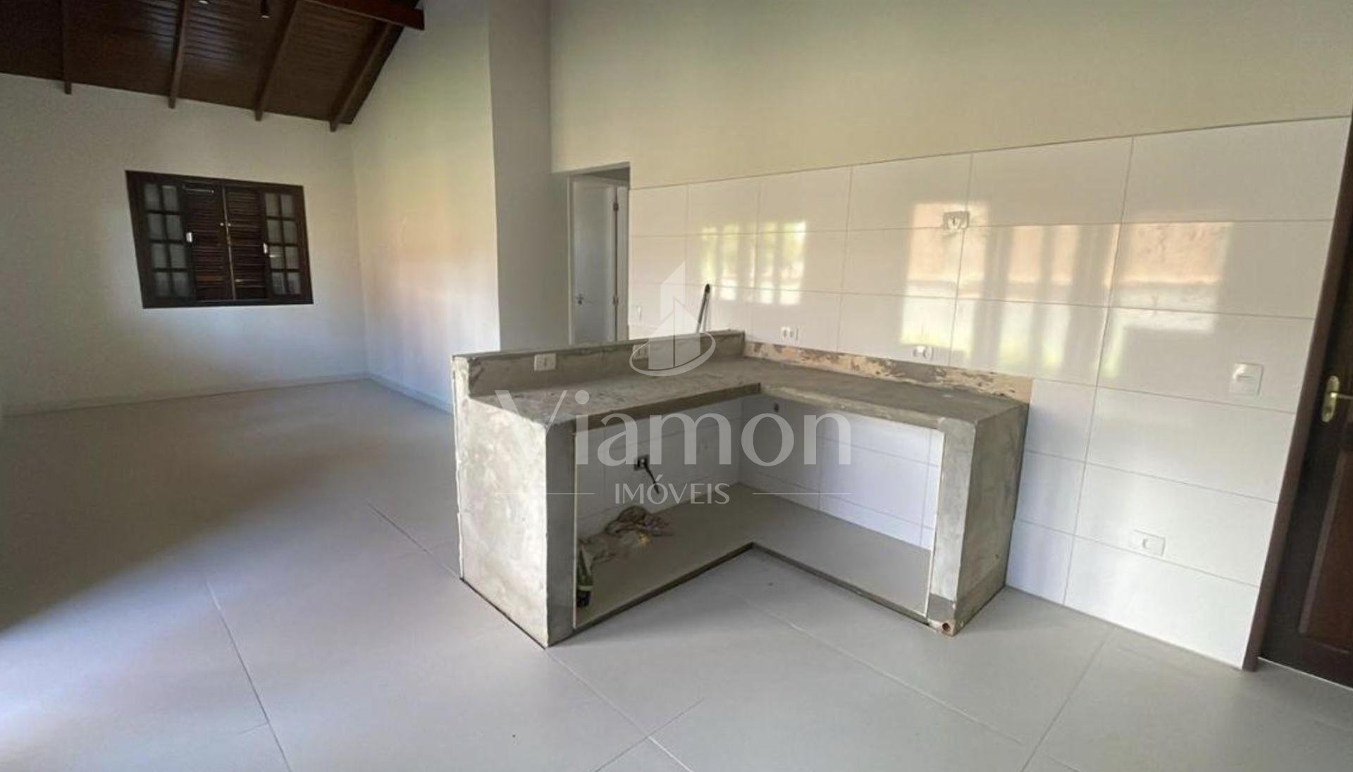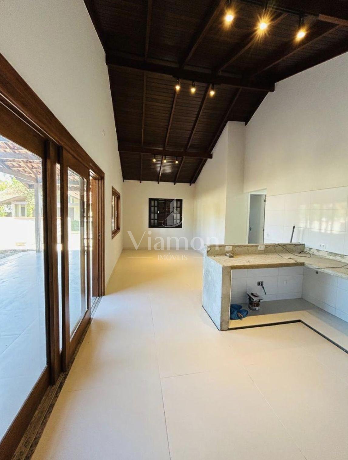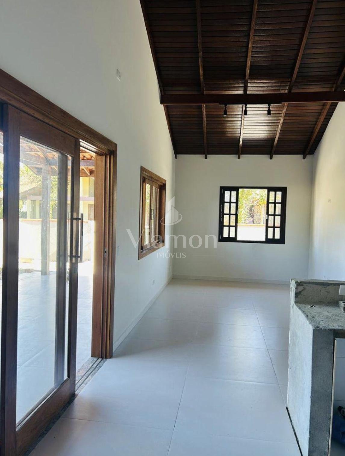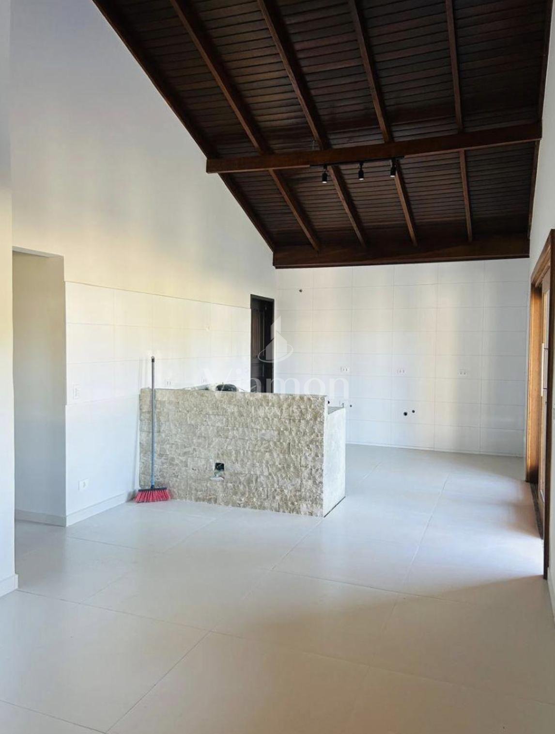 - Pé-direito alto na área social, com forro em madeira aparente;