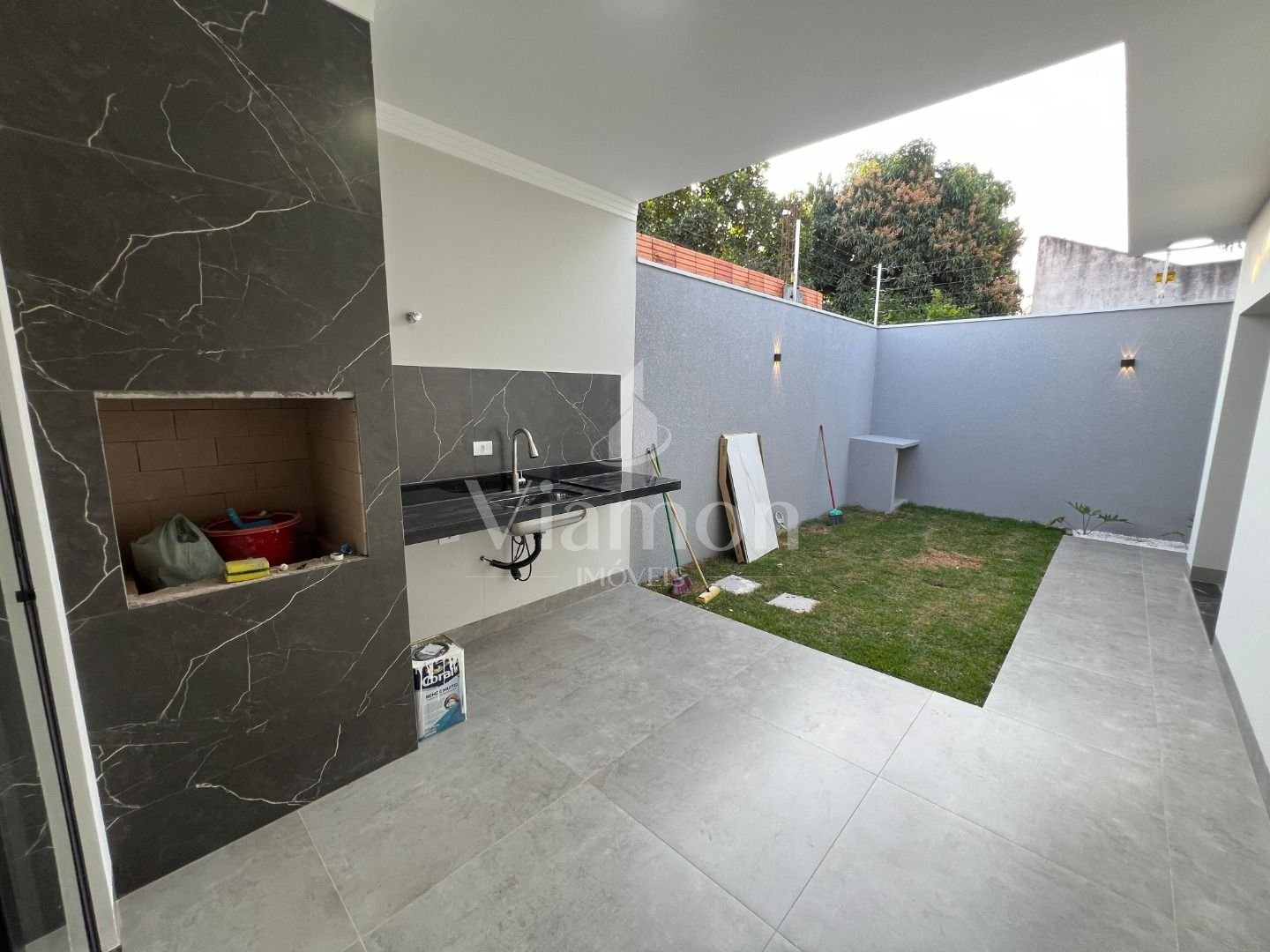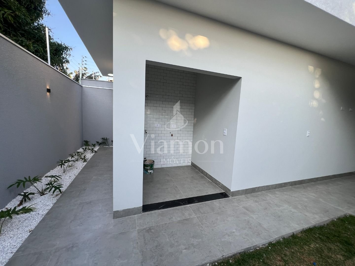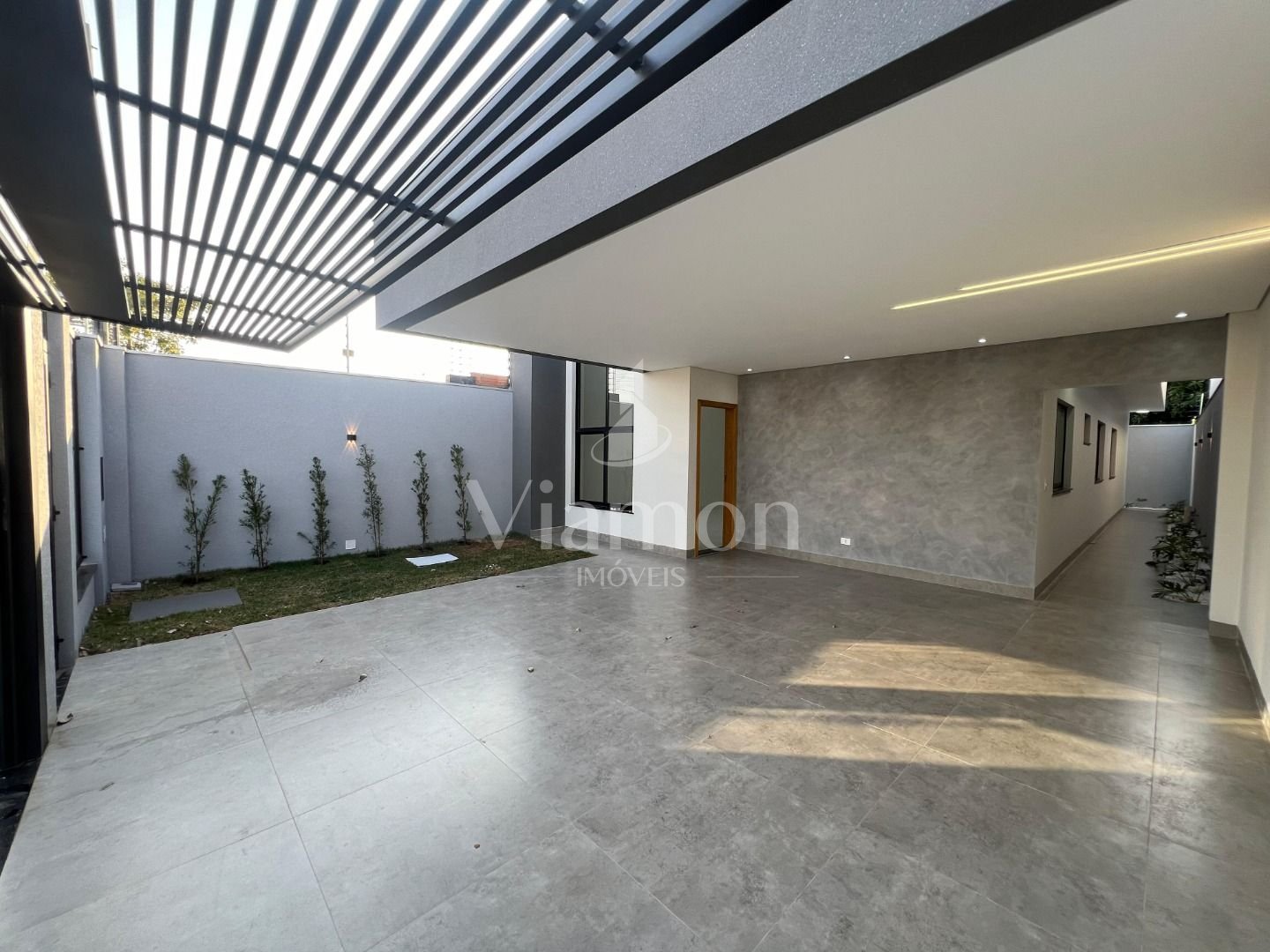 Garagem e área externa: Espaço planejado com iluminação moderna e funcionalidade para veículos e área de lazer.