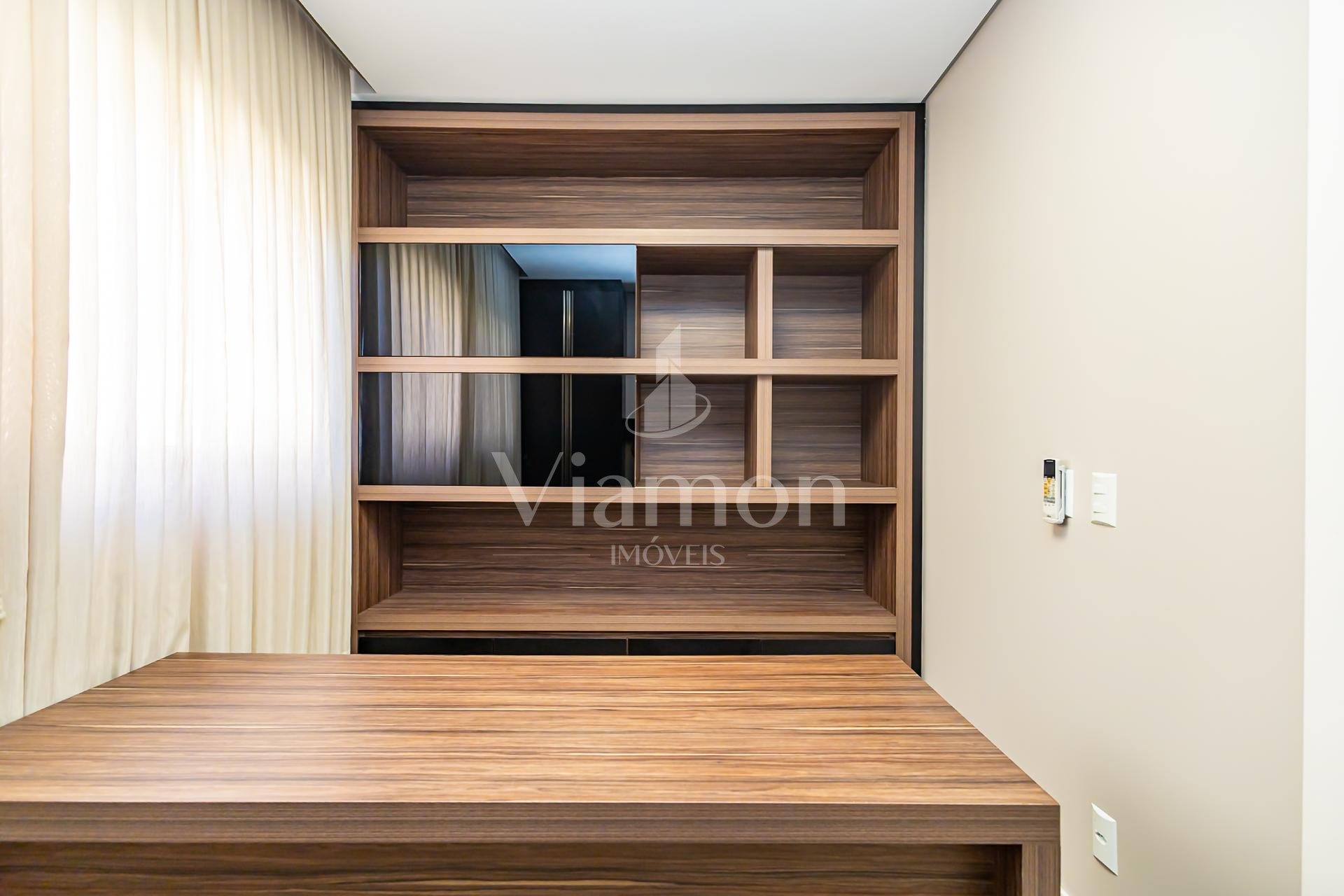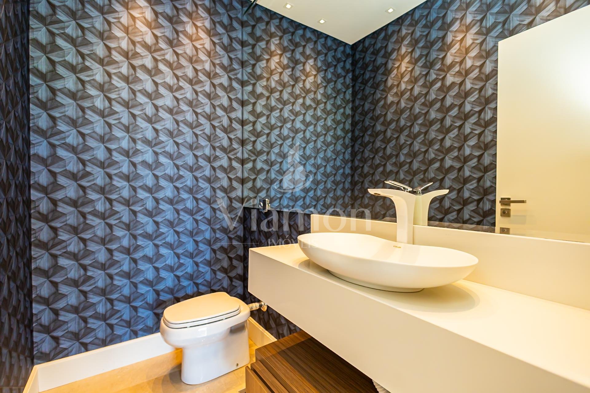 Ainda no térreo, há um lavabo e um dormitório climatizado, versátil para home office ou hóspedes.