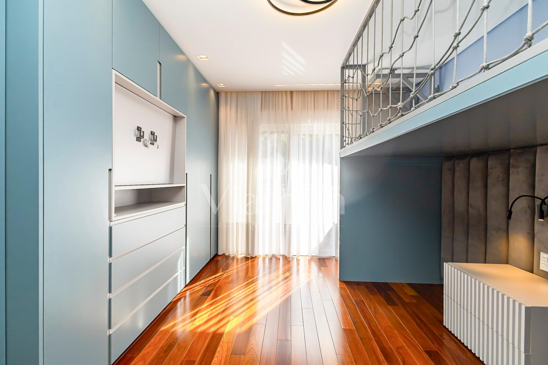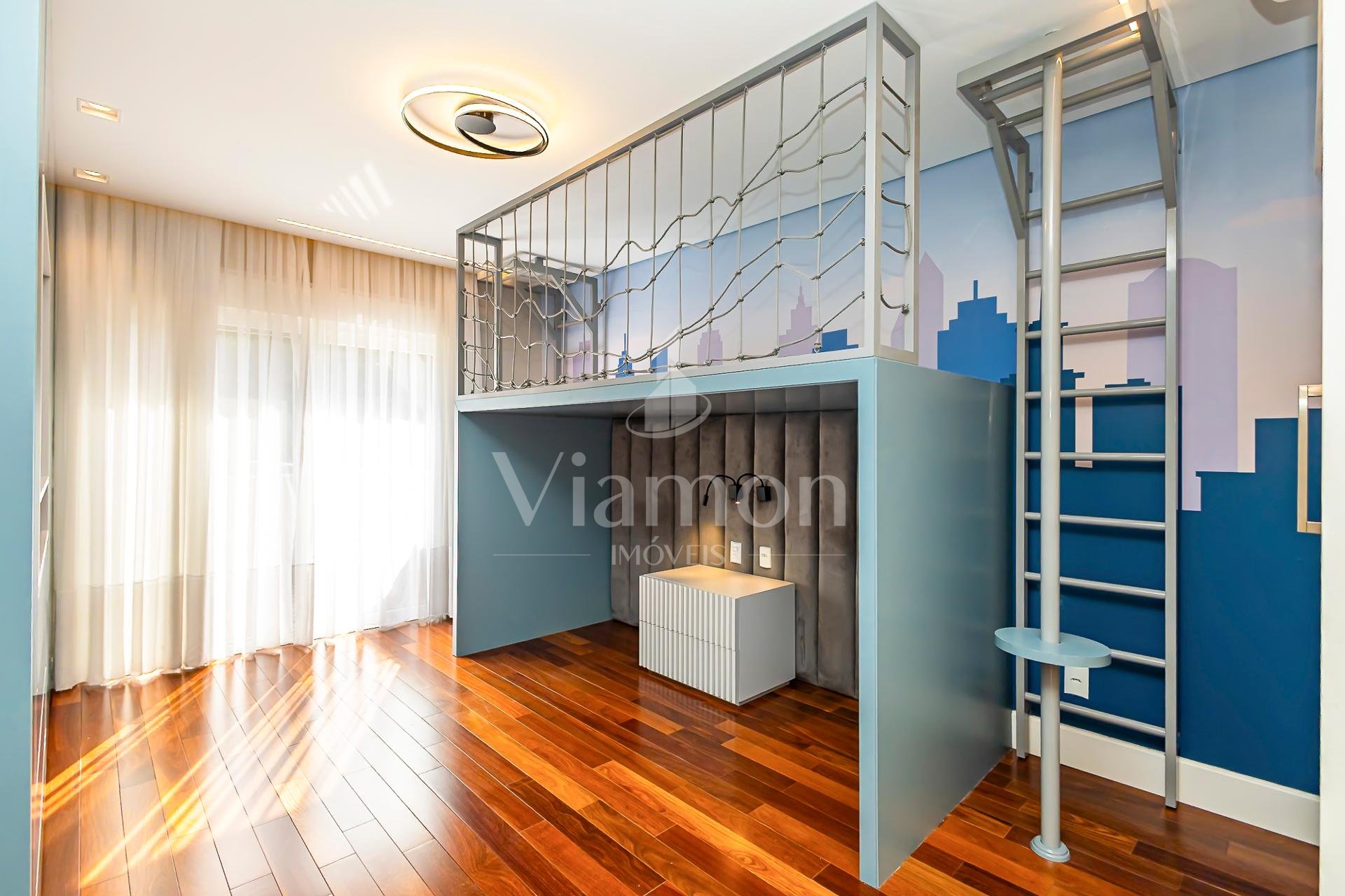 No piso superior, encontram-se 4 amplas suítes, todas climatizadas. A suíte master oferece closet e banheiro com pias e duchas duplas. O mezanino, com sua charmosa lareira, torna-se um ambiente íntimo perfeito para relaxar, com vista para o verde.