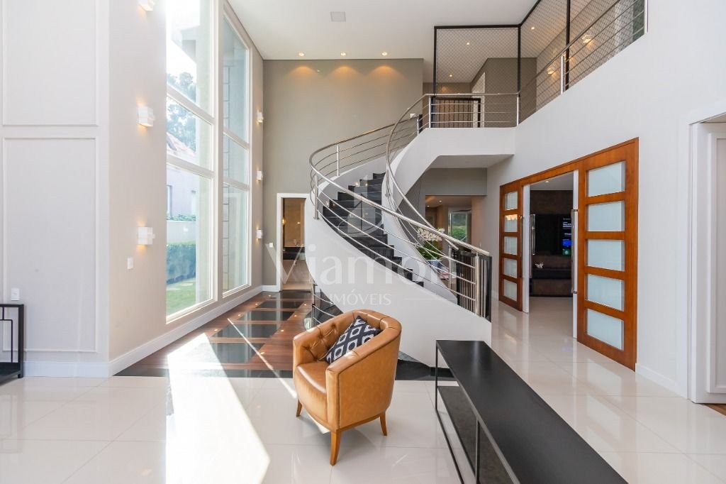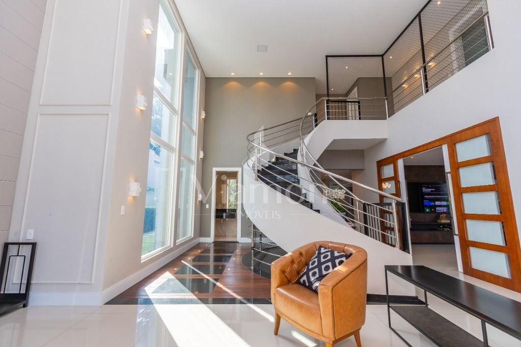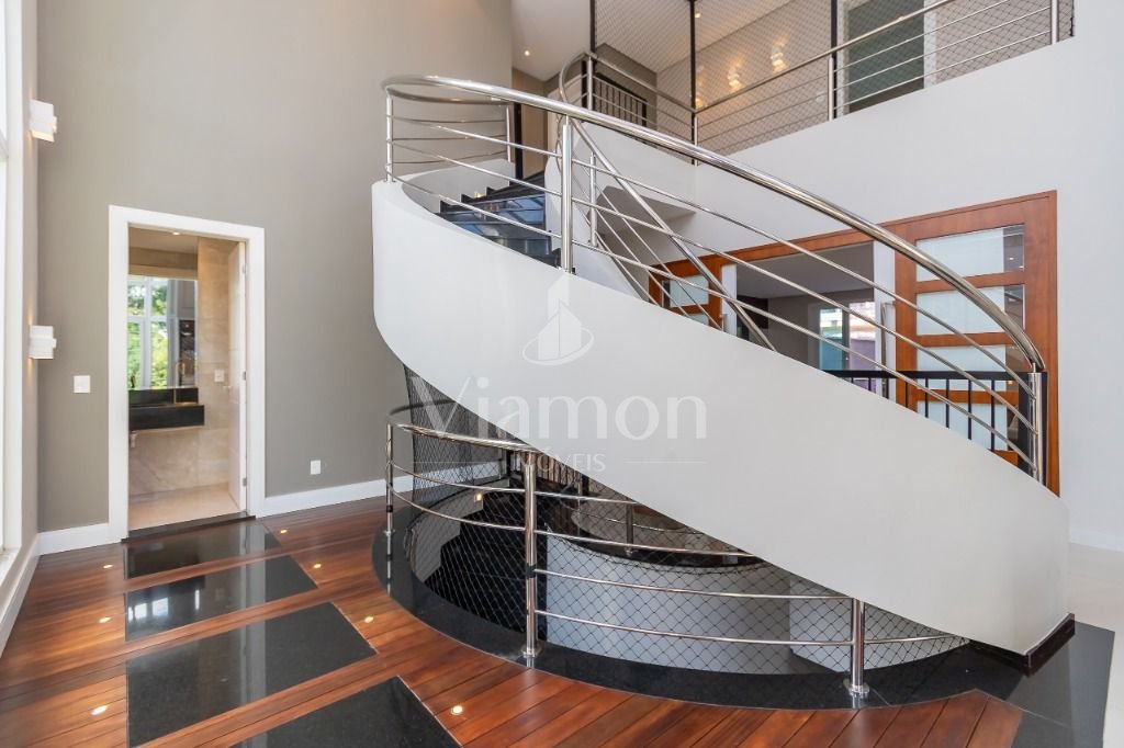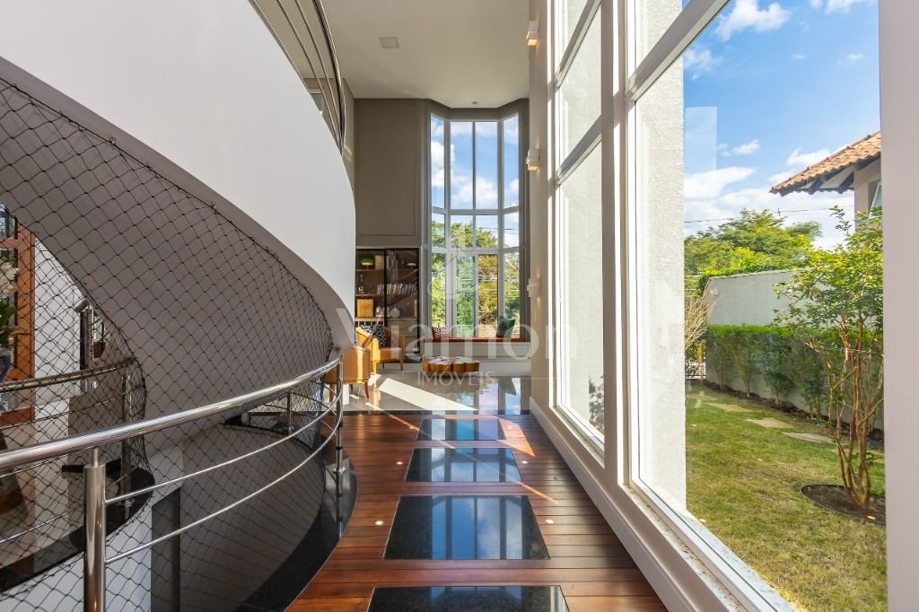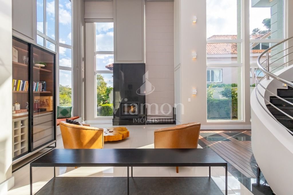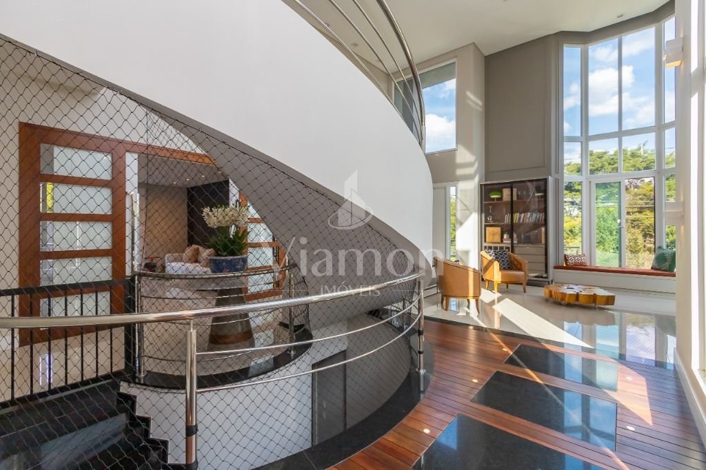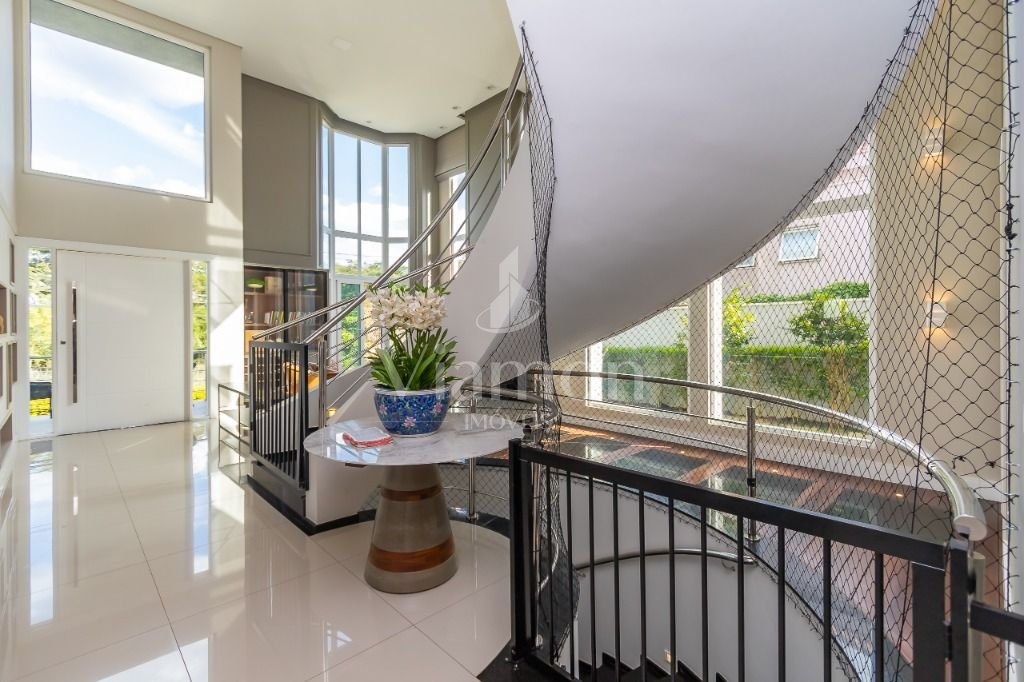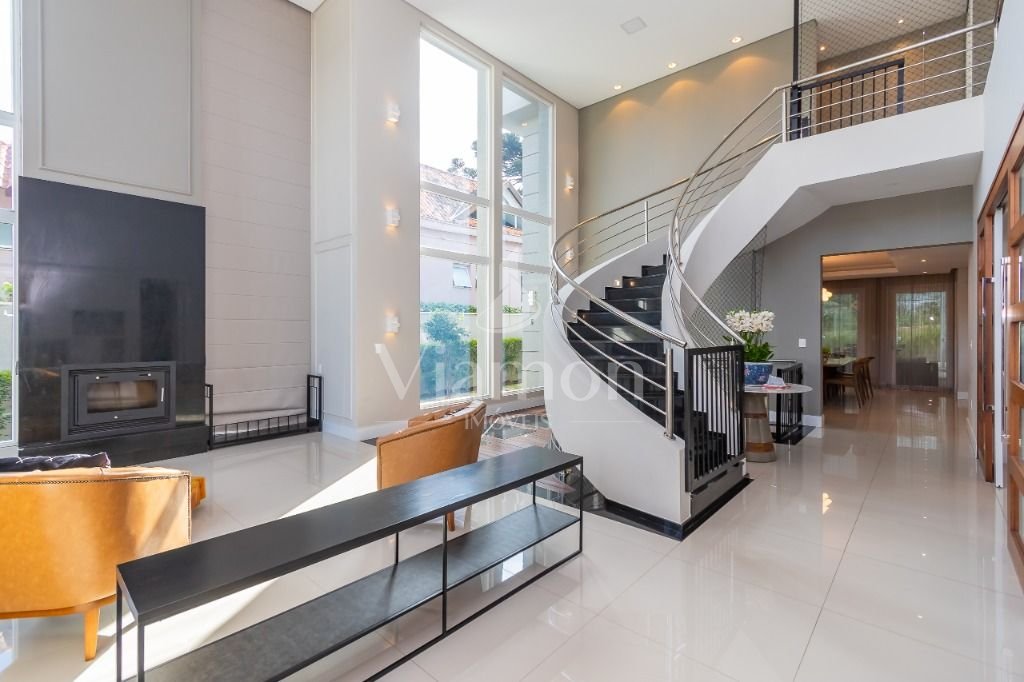 O pé direito da sala é muito elegante e imponente. A escada complementa o ambiente como se fosse uma obra de arte. Nesta casa a piscina Desjoyaux com tratamento sem cloro, é ideal para você!!! A cozinha, o espaço gourmet e a piscina tem uma integração perfeita!Outro diferencial desta casa é que os quartos tem piso aquecido para conforto térmico nos dias frios de Curitiba.