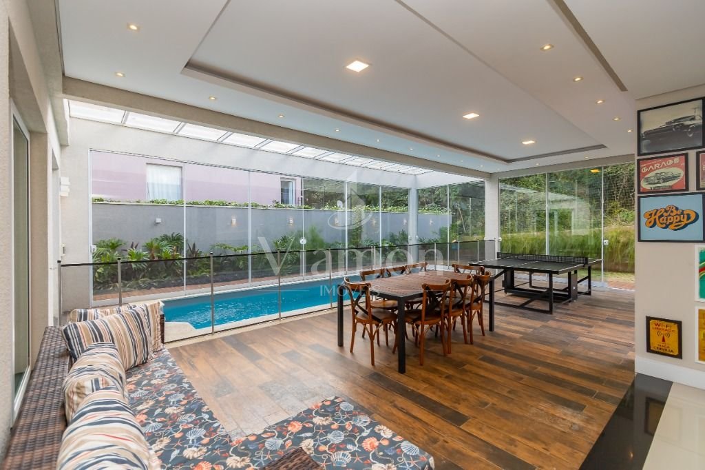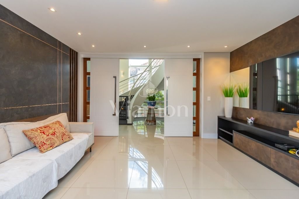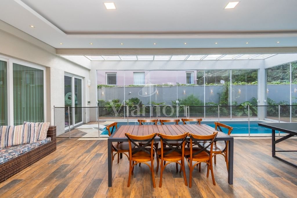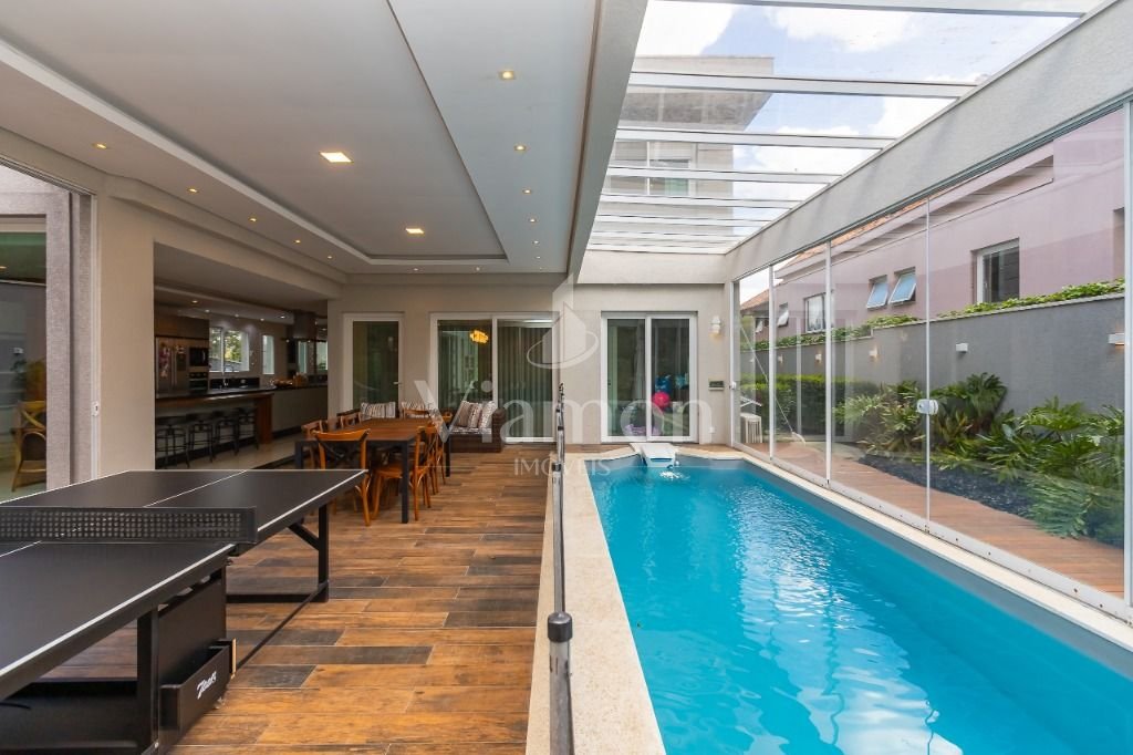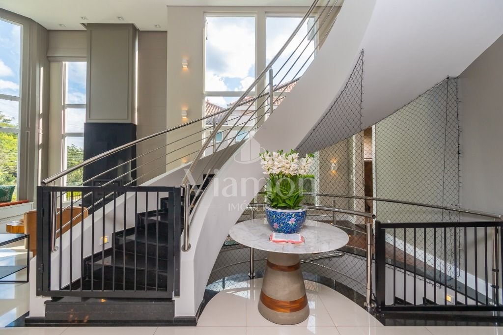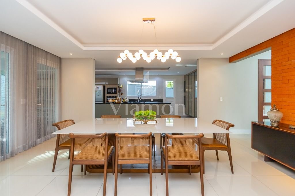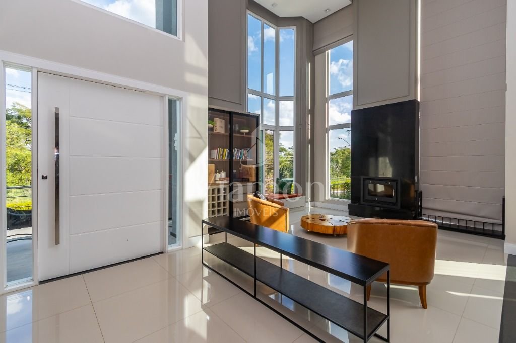 O pé direito da sala é muito elegante e imponente. A escada complementa o ambiente como se fosse uma obra de arte. Nesta casa a piscina Desjoyaux com tratamento sem cloro, é ideal para você!!! A cozinha, o espaço gourmet e a piscina tem uma integração perfeita!Outro diferencial desta casa é que os quartos tem piso aquecido para conforto térmico nos dias frios de Curitiba.