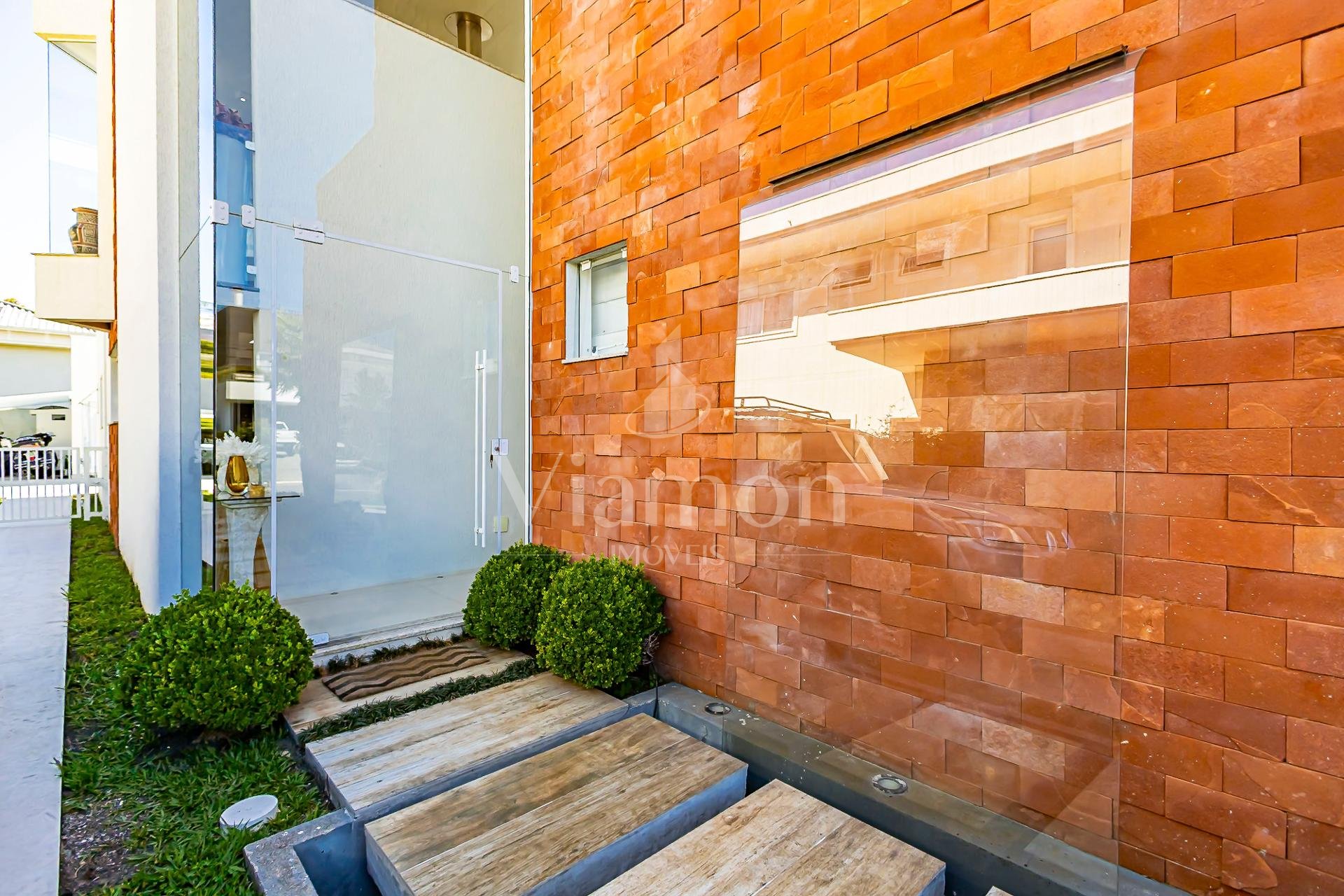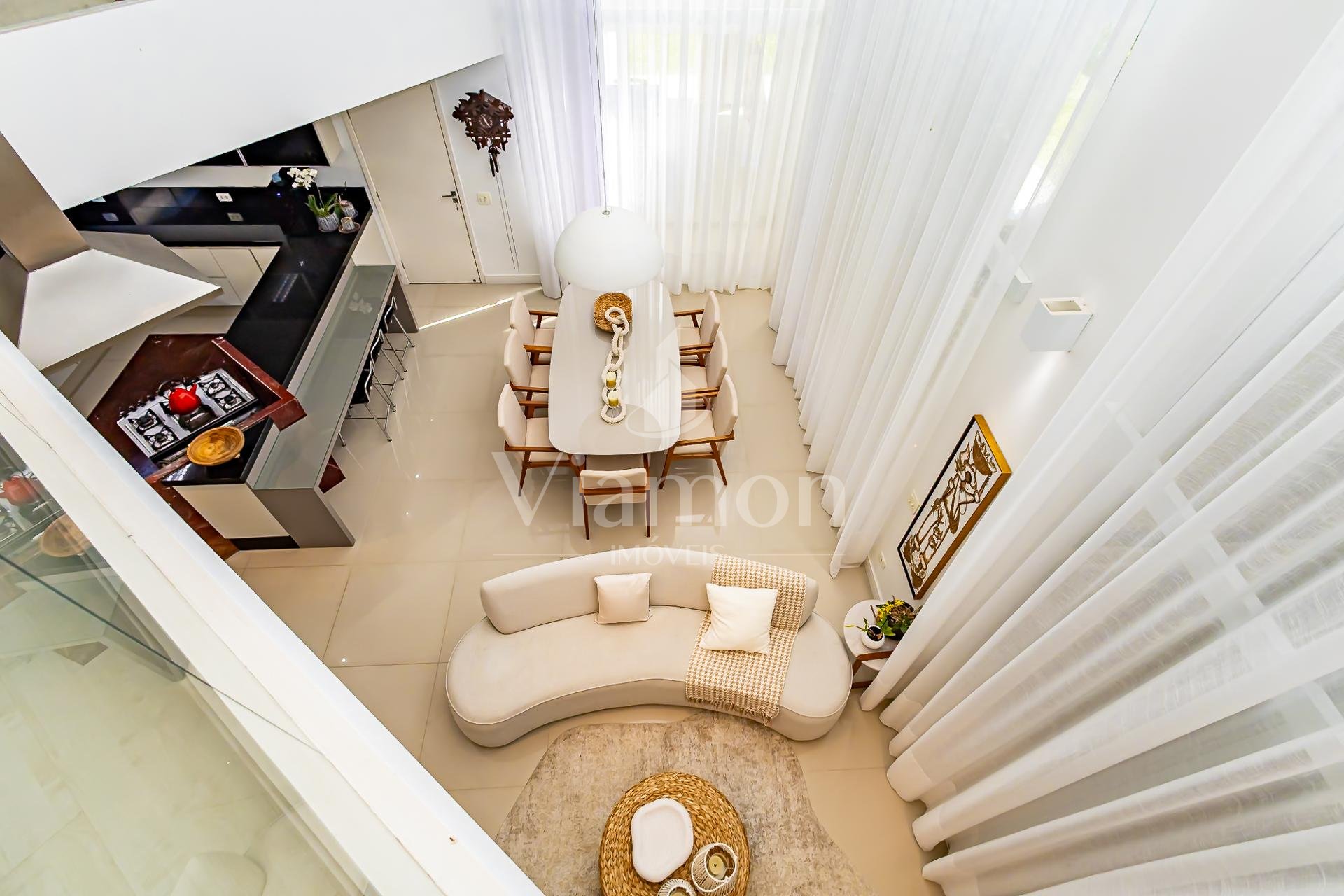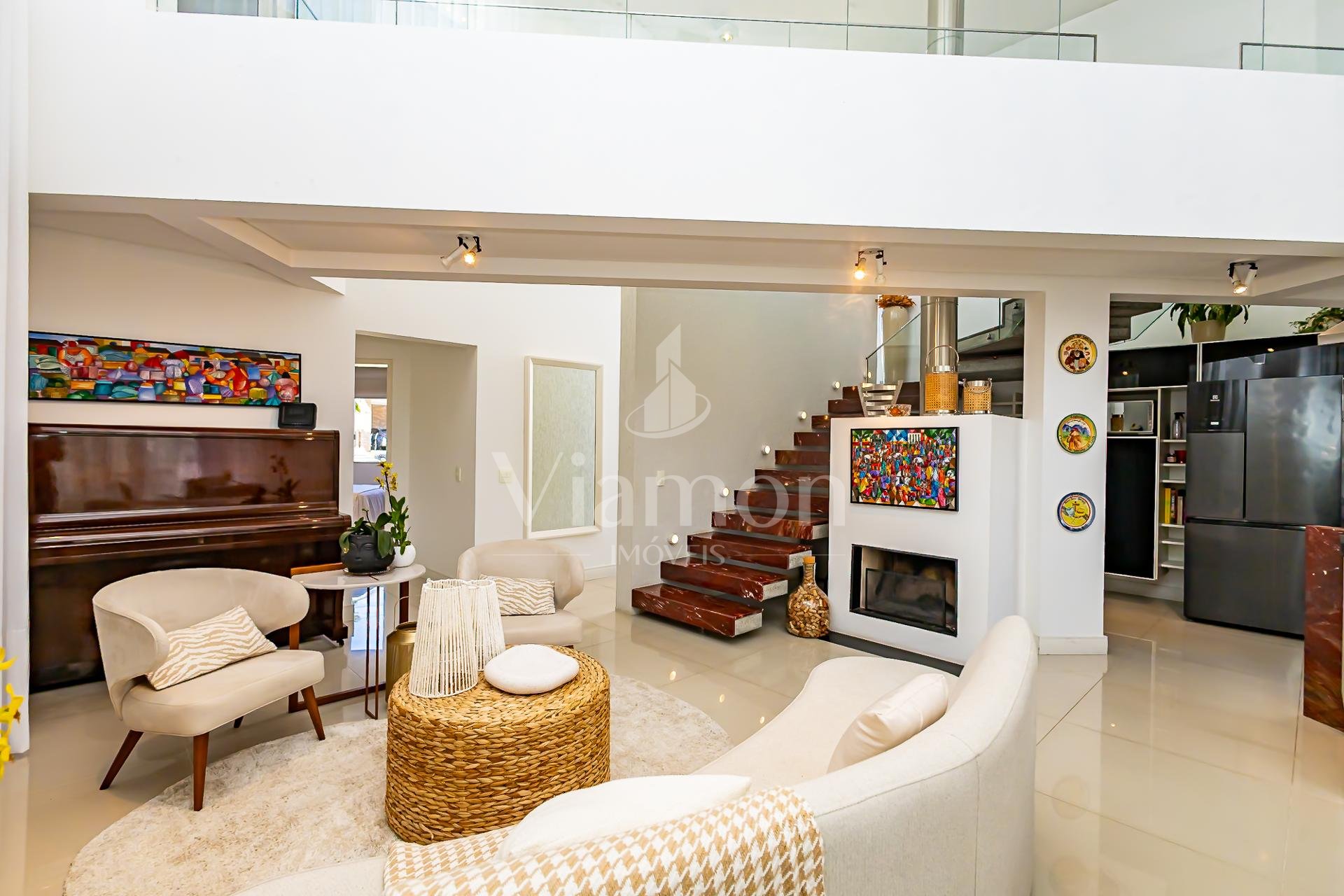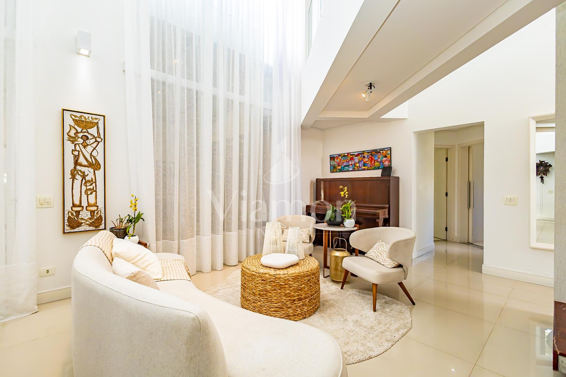 Logo na entrada, a casa recebe com uma charmosa cascata que conduz a uma sala imponente, com pé-direito duplo e abundância de luz natural.