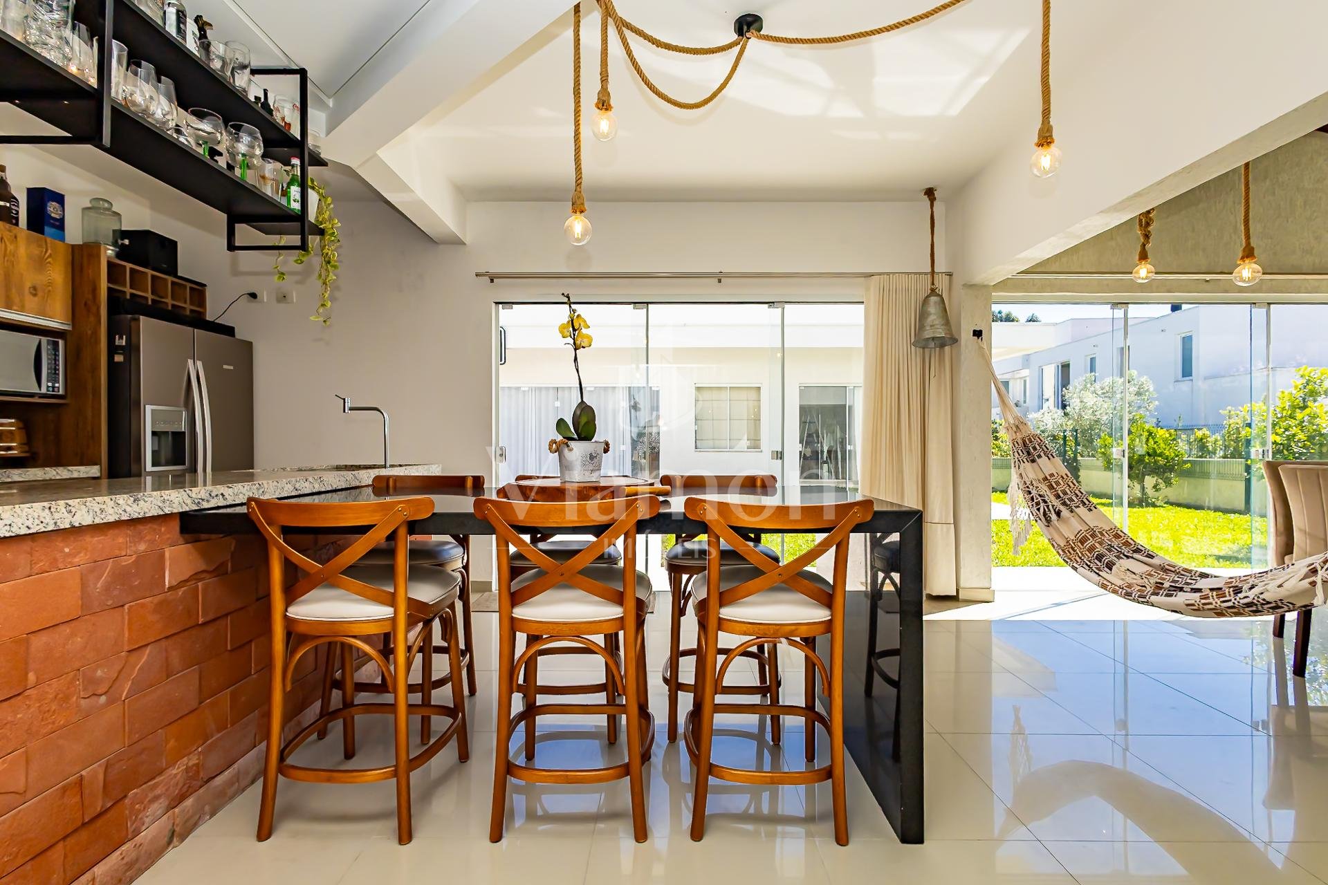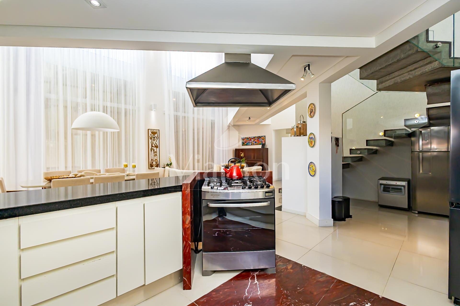A cozinha, totalmente planejada e integrada, se conecta de forma harmoniosa à sala de jantar e à área gourmet com churrasqueira a carvão, um espaço que se integra de maneira independente tanto à sala quanto ao quintal, criando diferentes possibilidades de convívio.
