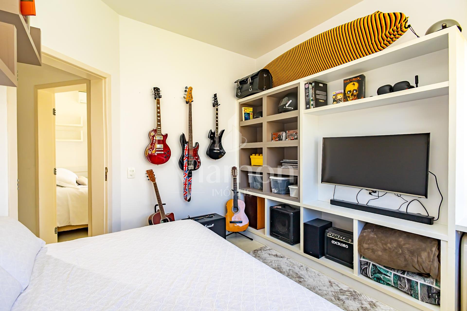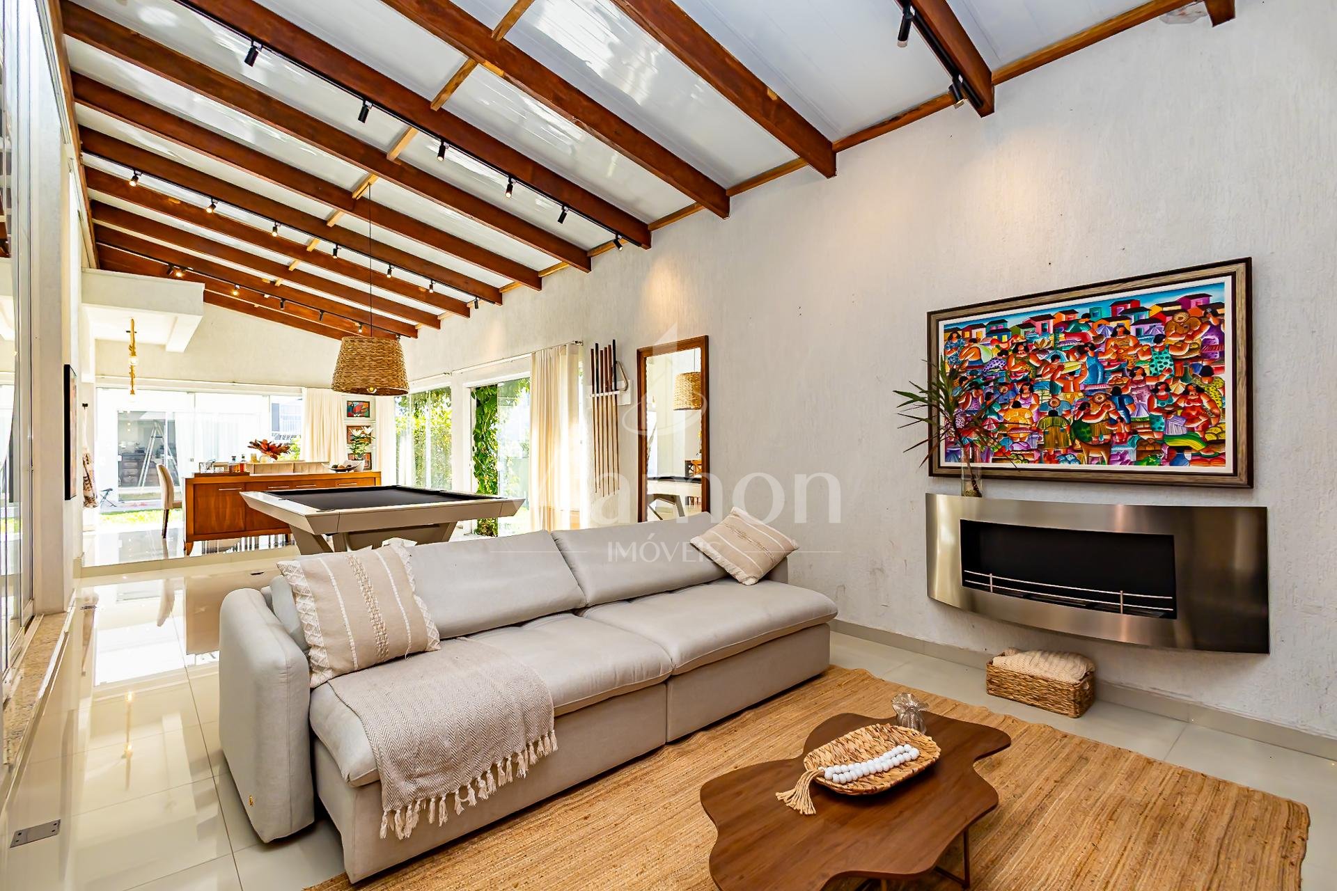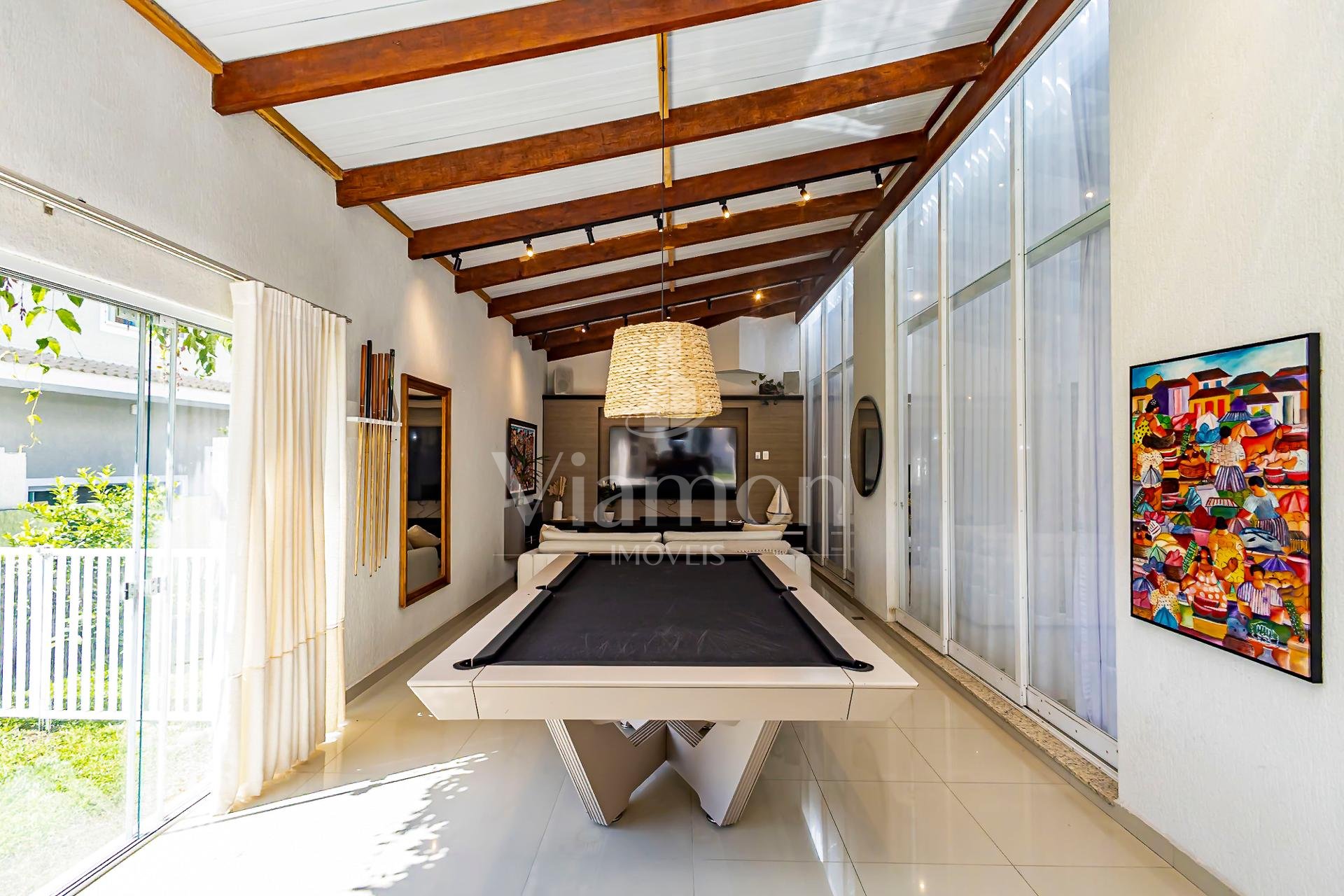 Na lateral, um ambiente especial reúne uma mesa profissional de sinuca e uma área de home para assistir televisão e relaxar, complementando a atmosfera de lazer que permeia toda a casa.