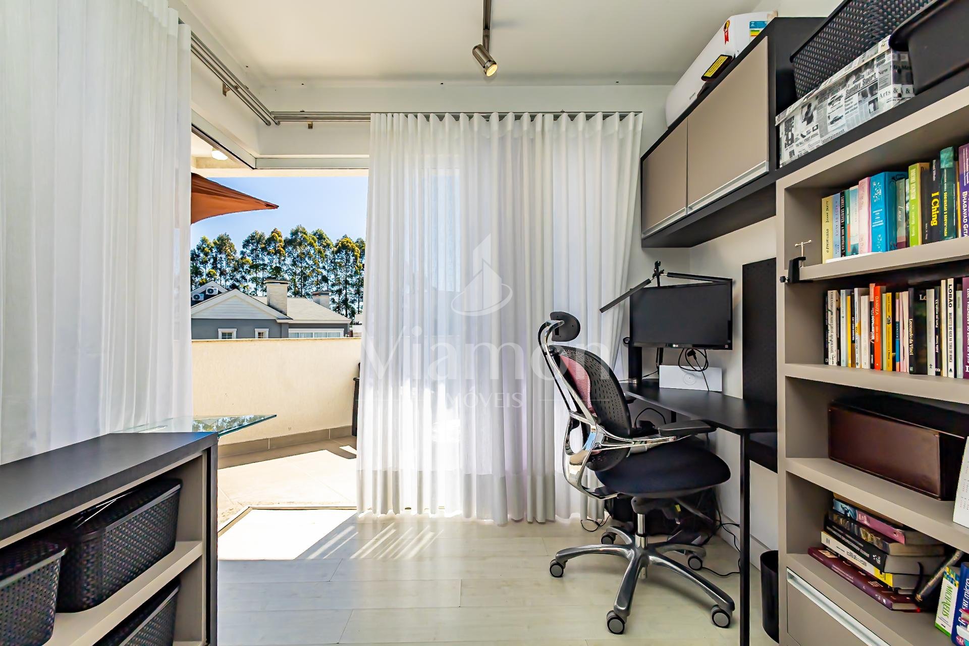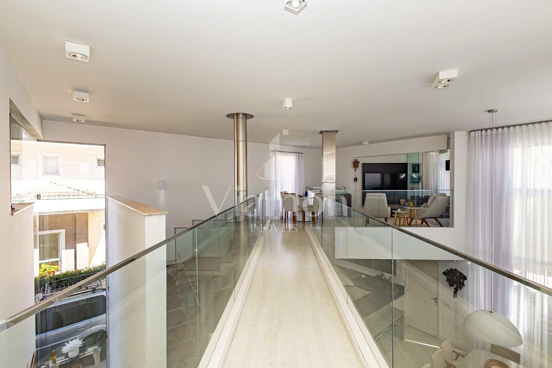 Subindo as escadas, surge um ambiente de convivência perfeito para reunir a família, equipado com televisão, área para jogos e um escritório com uma bela sacada, onde móveis externos convidam a aproveitar os dias de sol.