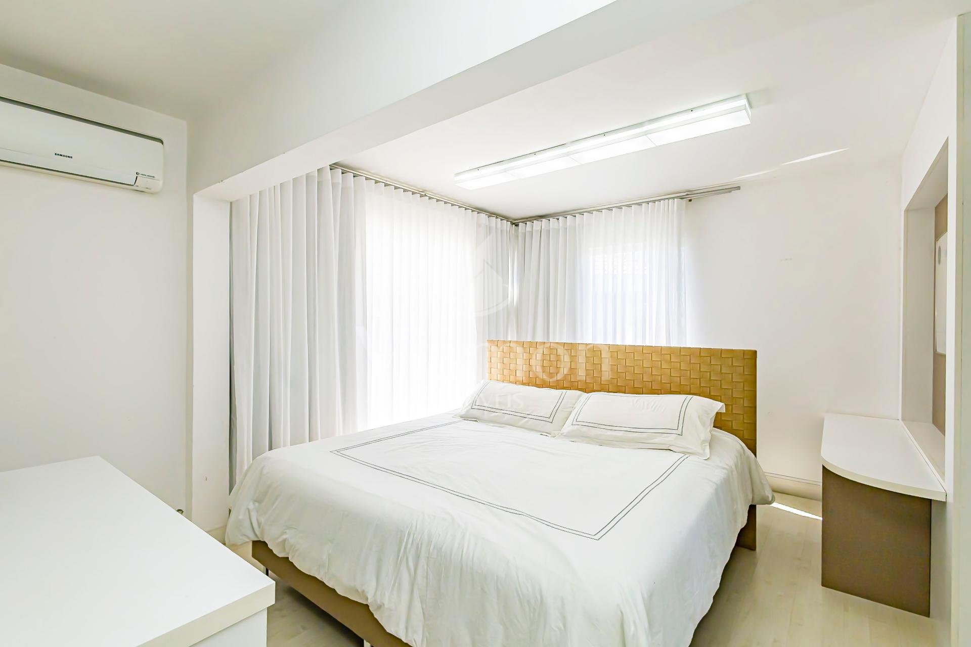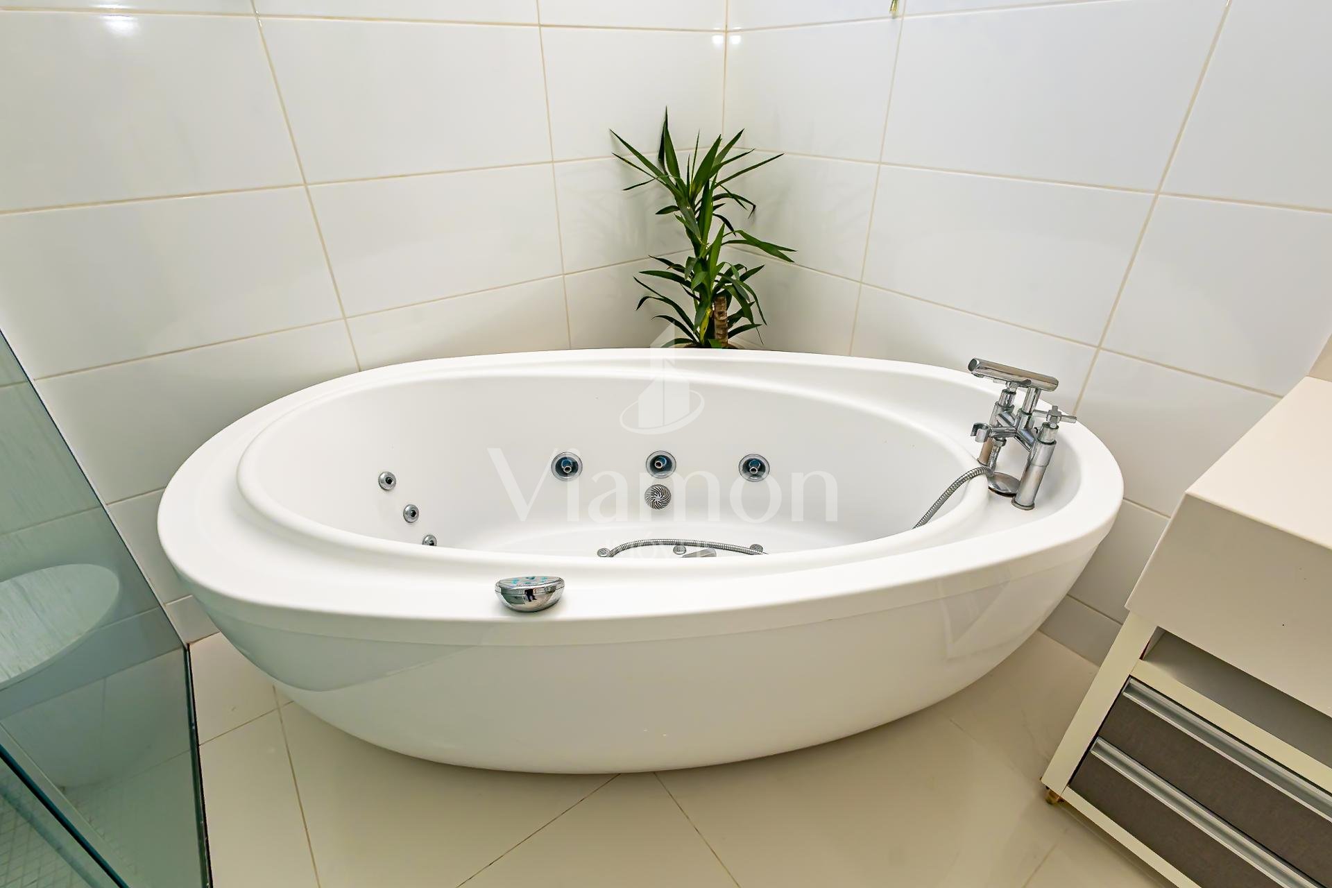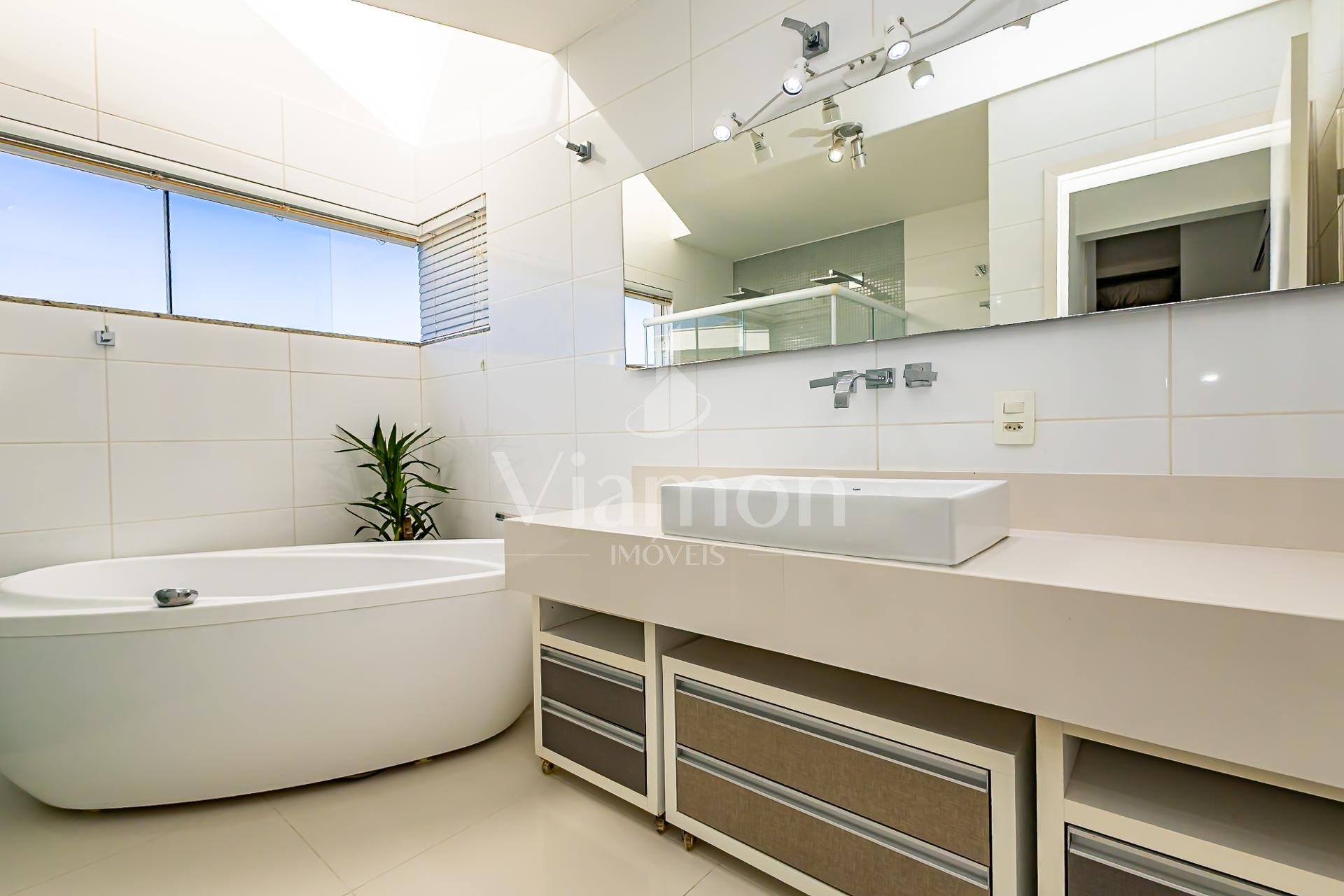 No pavimento superior também está a suíte master, que se destaca pelos dois closets independentes senhor e senhora e por um banheiro amplo, muito bem iluminado, com uma elegante banheira de imersão.