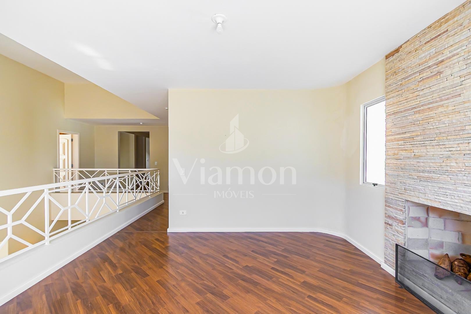 Sala principal com pé-direito duplo e lareira a lenha