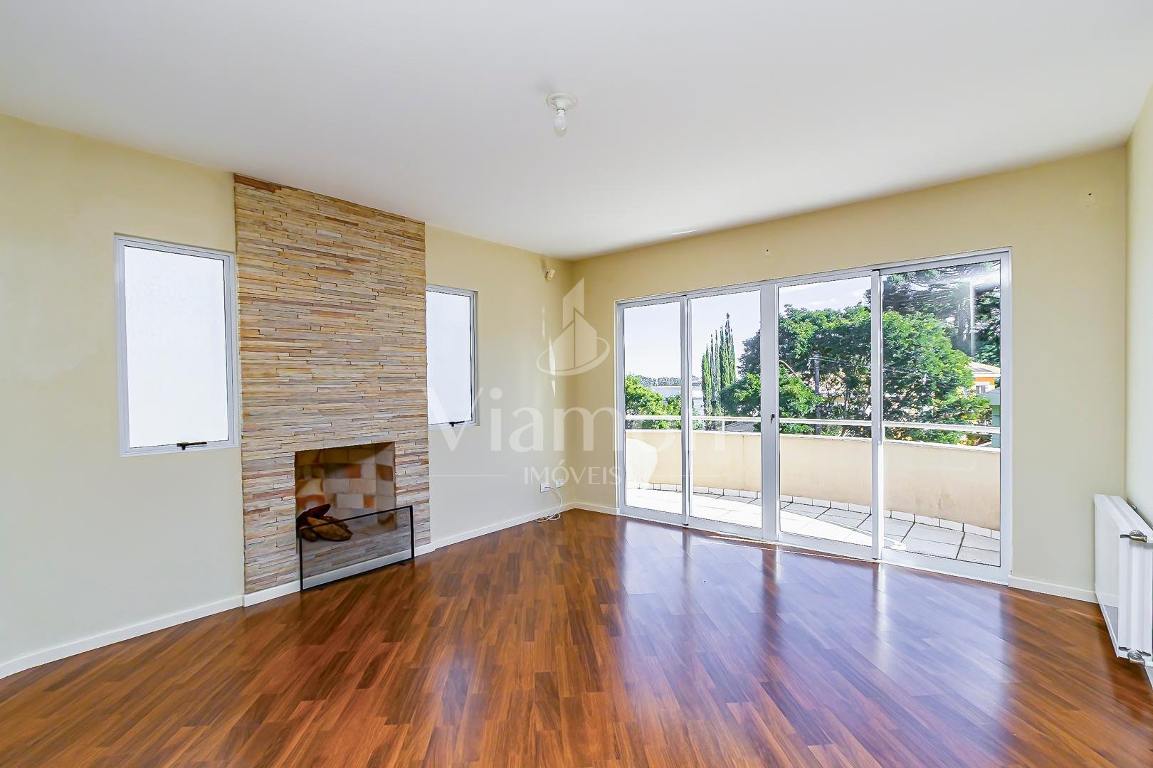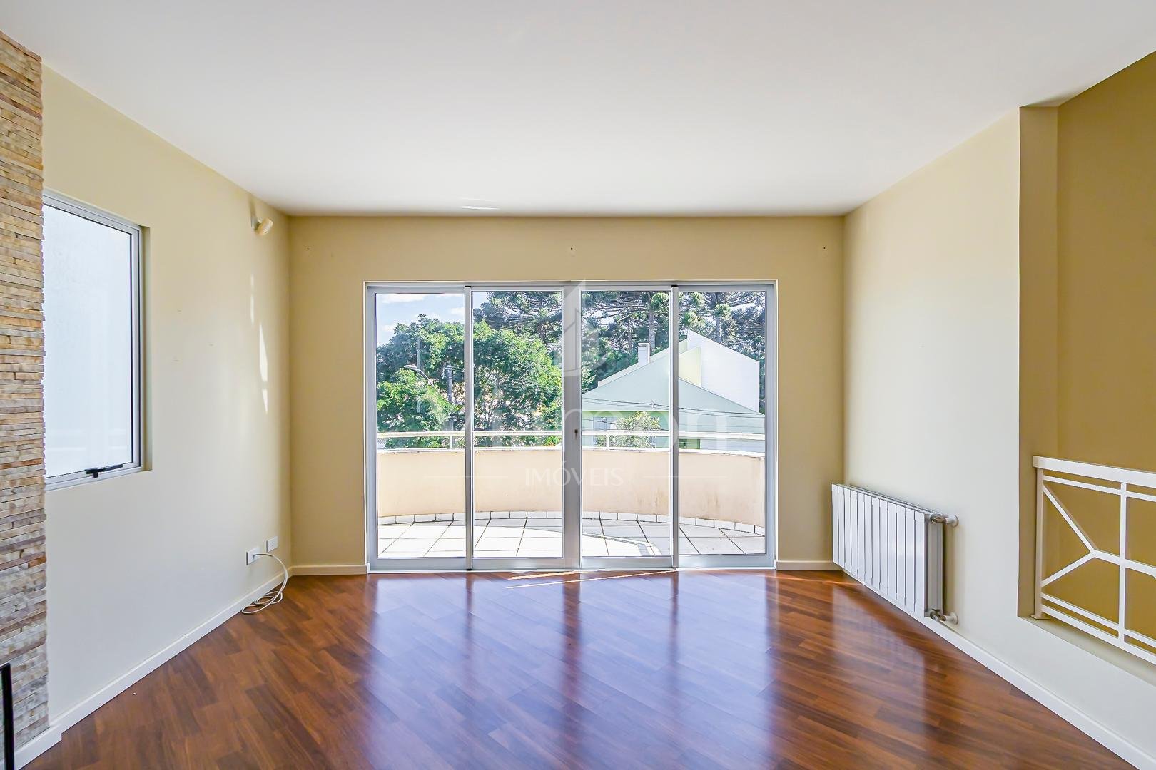 Área íntima ampla com lareira a lenha e sacada com vista ampla