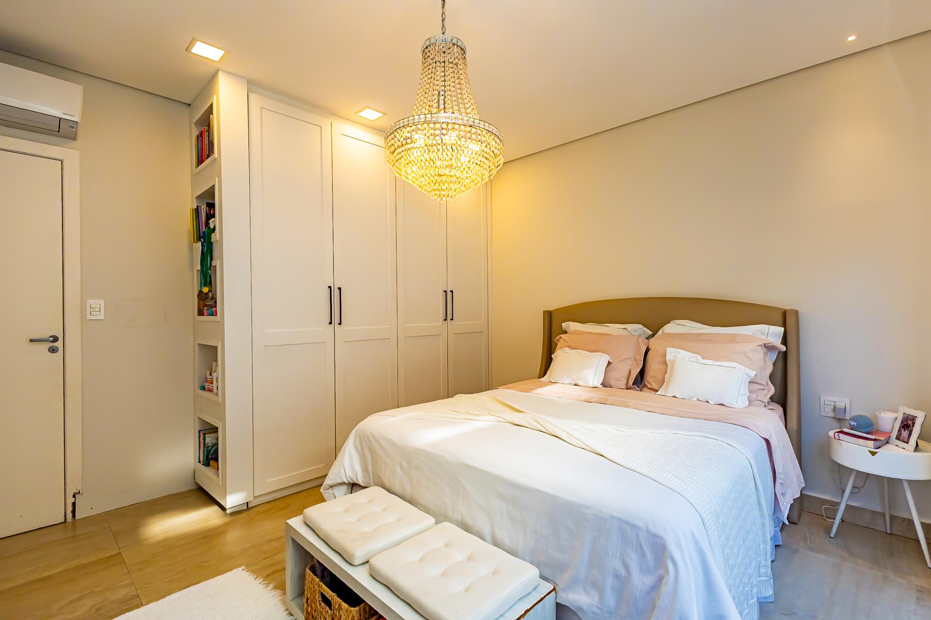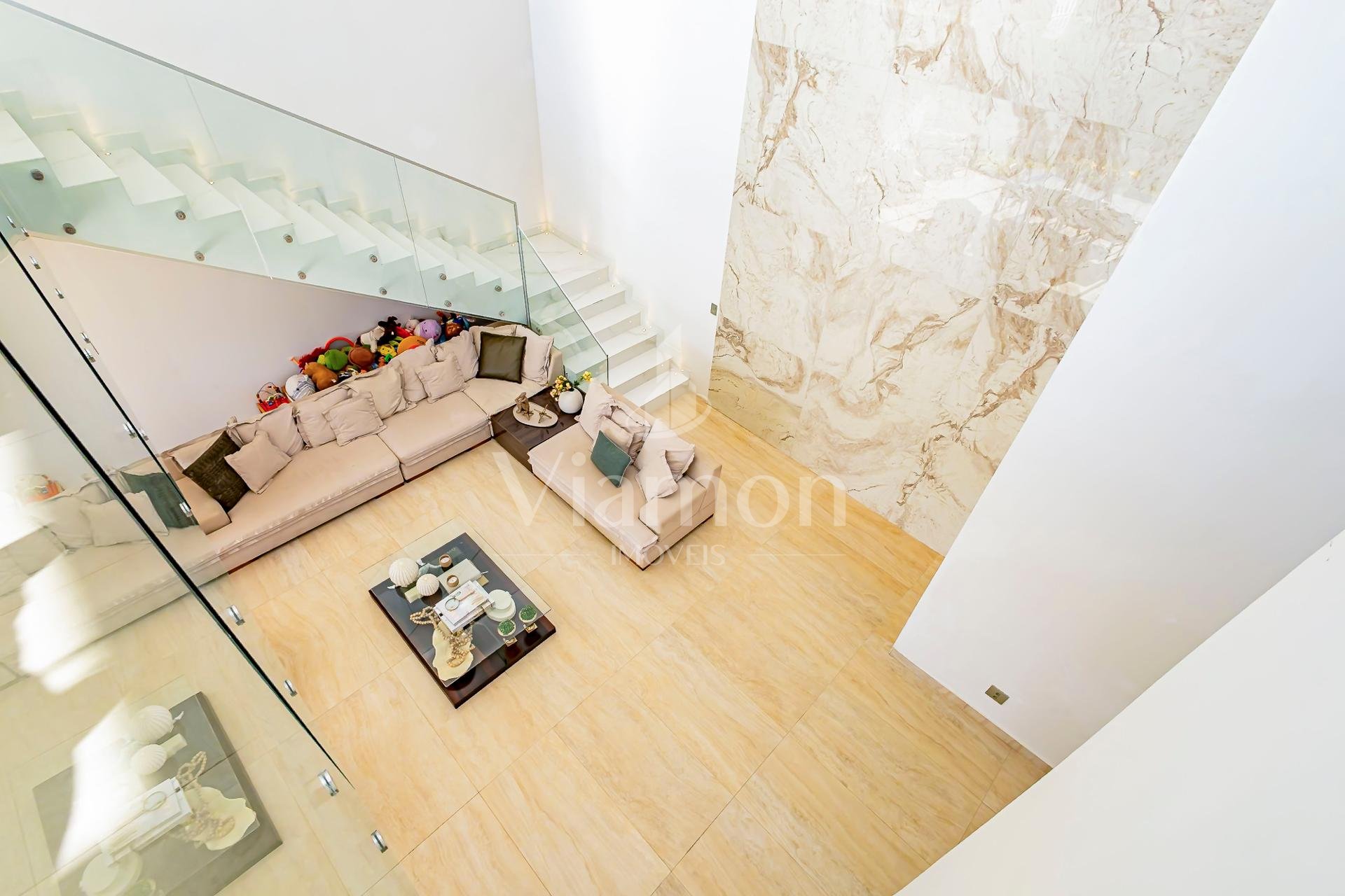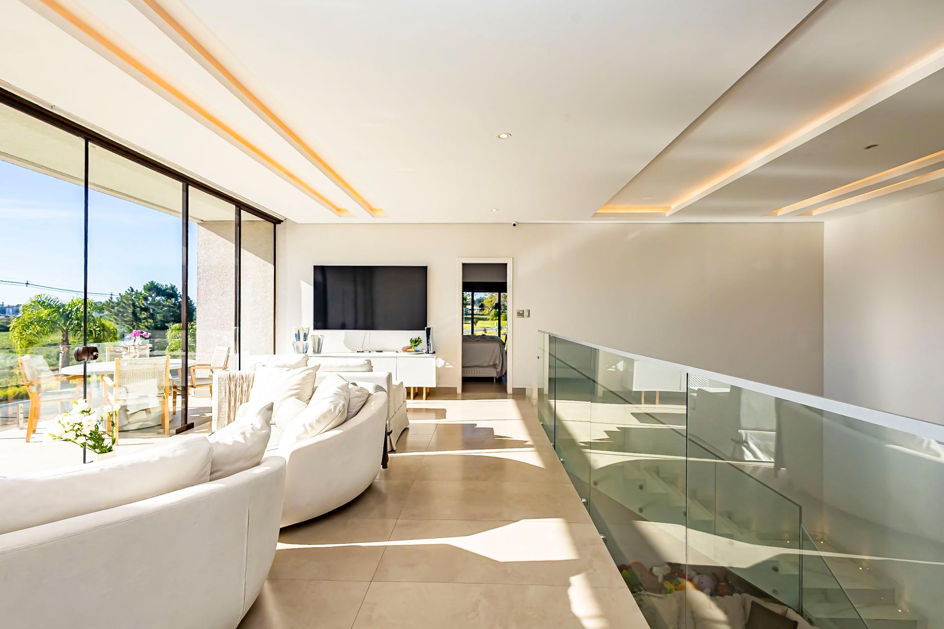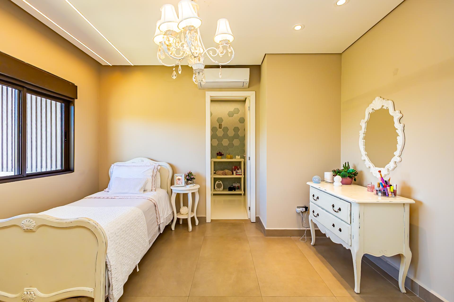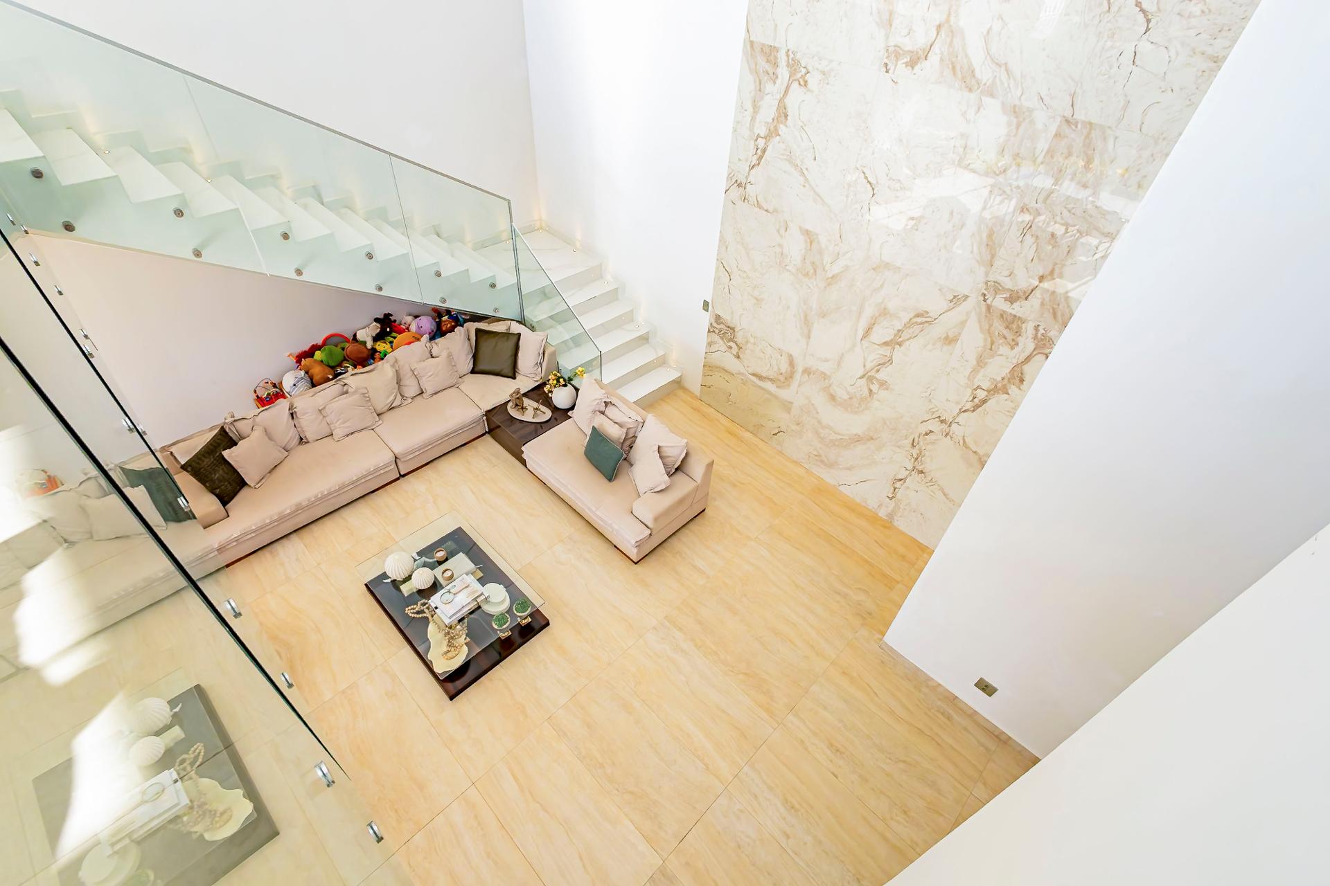 No piso superior, três suítes garantem o conforto da família. A suíte master oferece closet espaçoso, bancada com duas cubas e chuveiros duplos, compondo um refúgio de relaxamento e praticidade. Um mezanino, atualmente usado como sala íntima de TV, proporciona um espaço acolhedor e com vista aberta para o ambiente social.