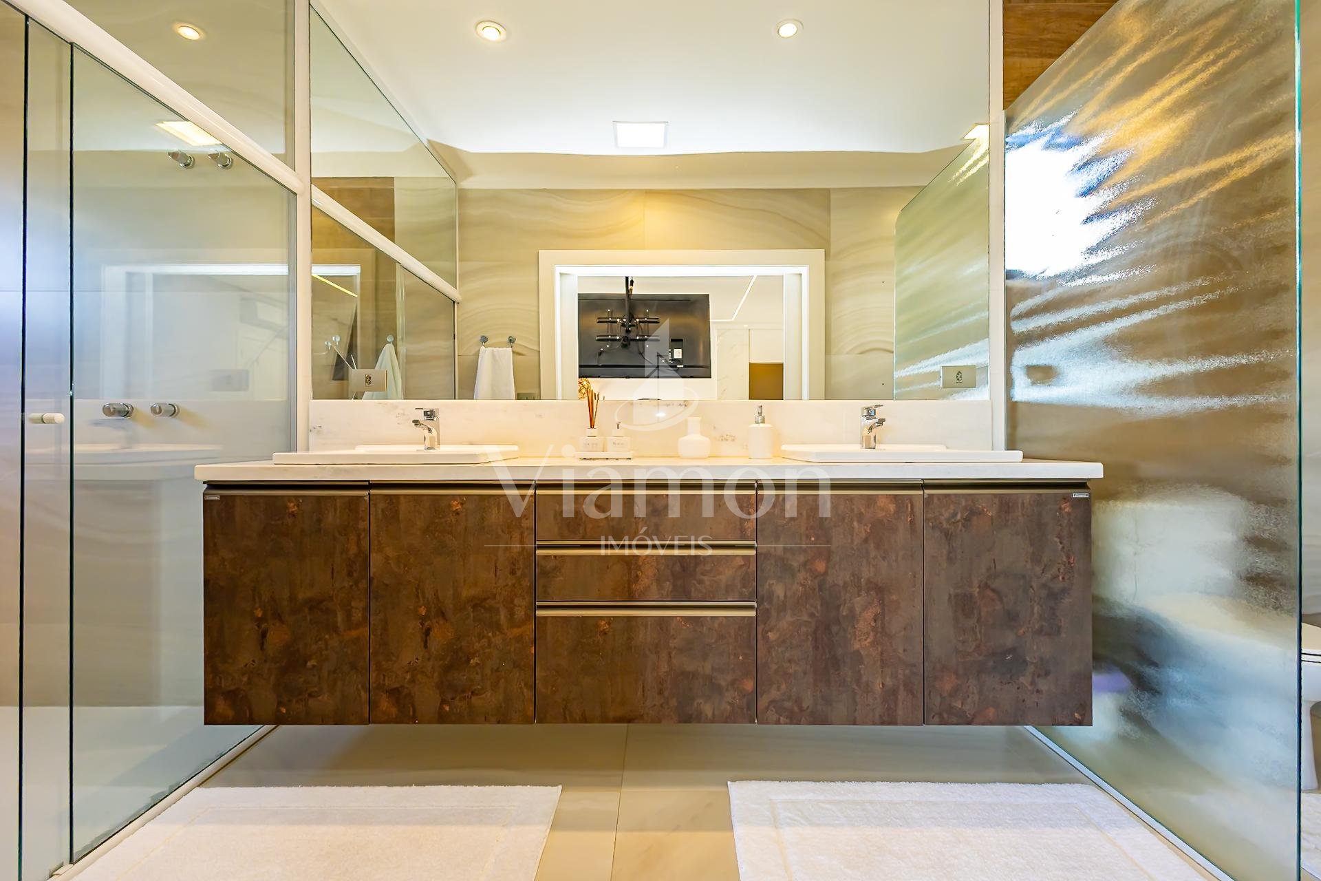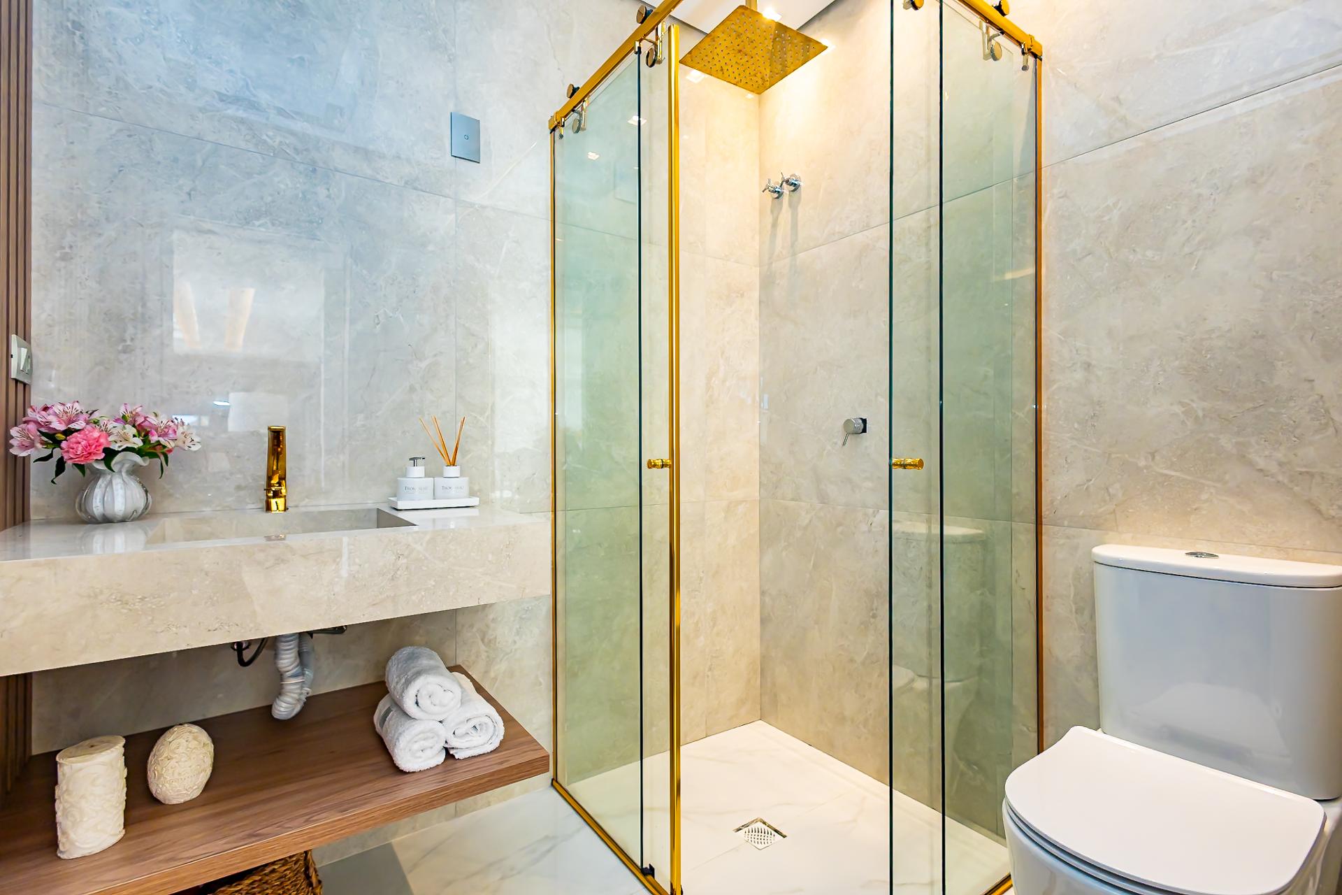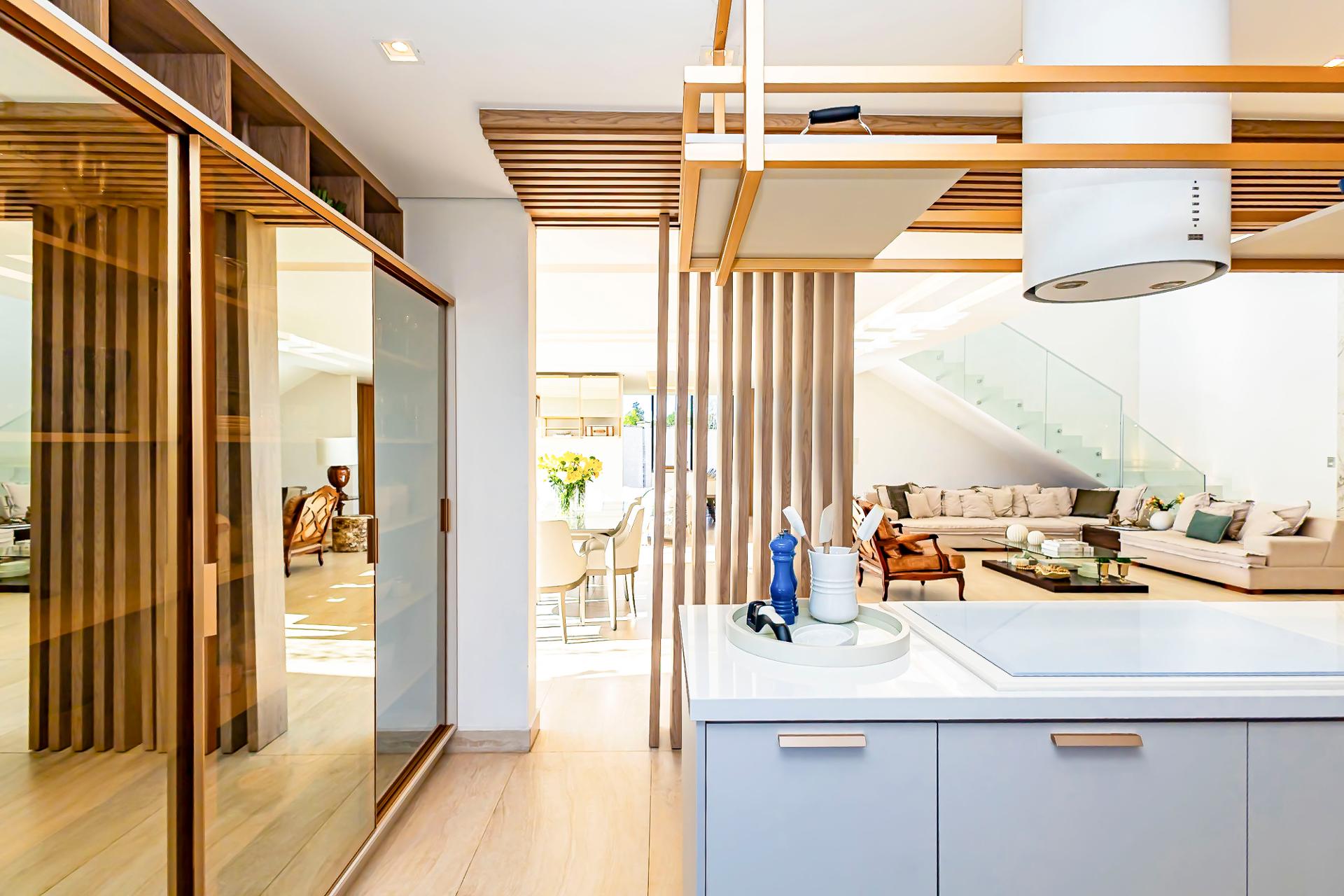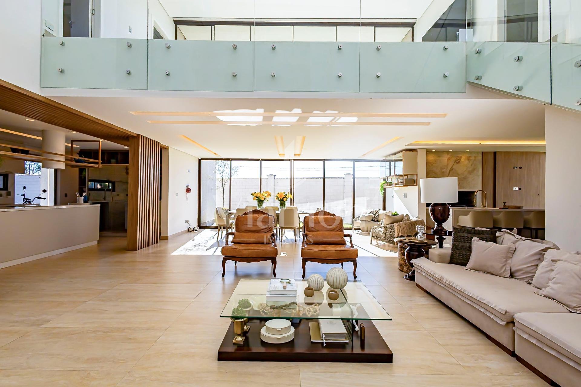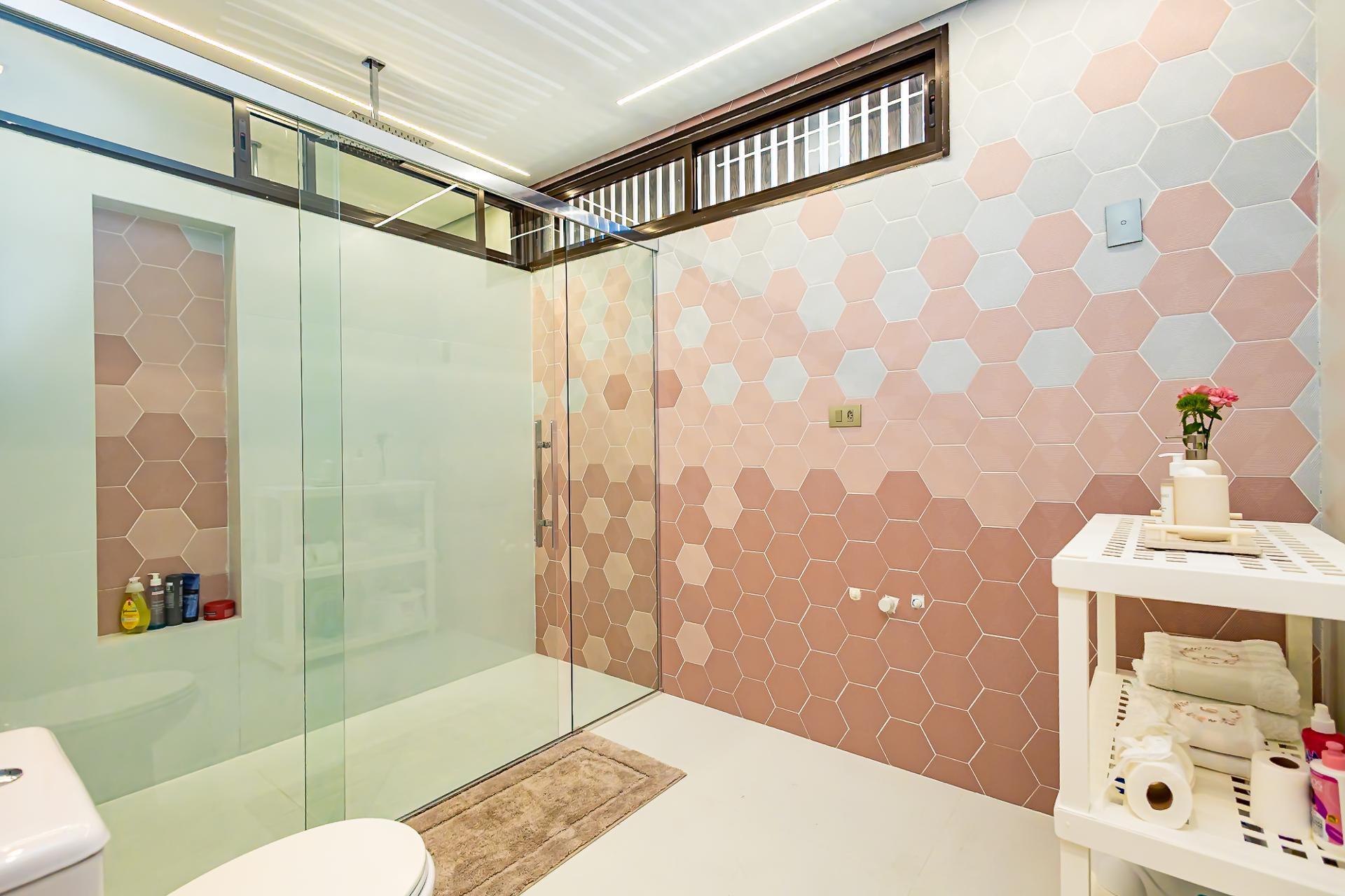 No piso superior, três suítes garantem o conforto da família. A suíte master oferece closet espaçoso, bancada com duas cubas e chuveiros duplos, compondo um refúgio de relaxamento e praticidade. Um mezanino, atualmente usado como sala íntima de TV, proporciona um espaço acolhedor e com vista aberta para o ambiente social.
