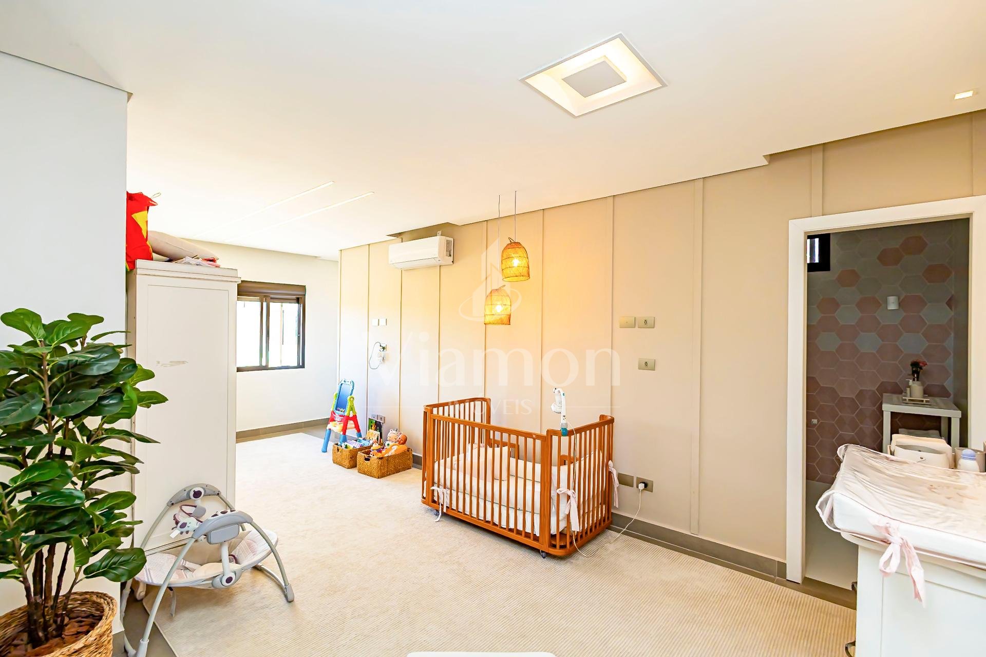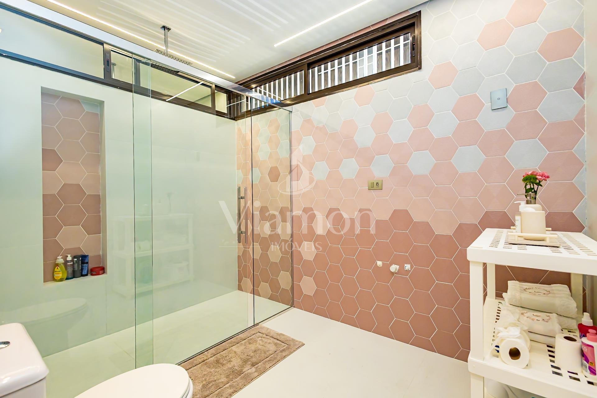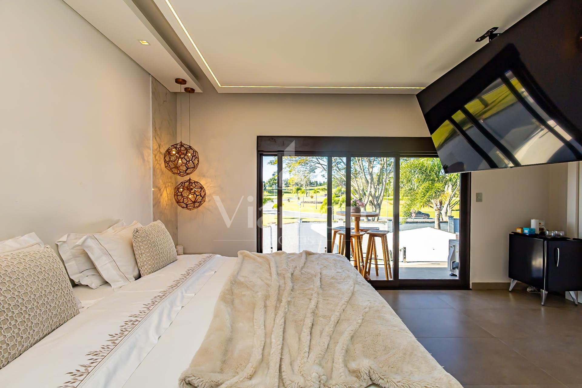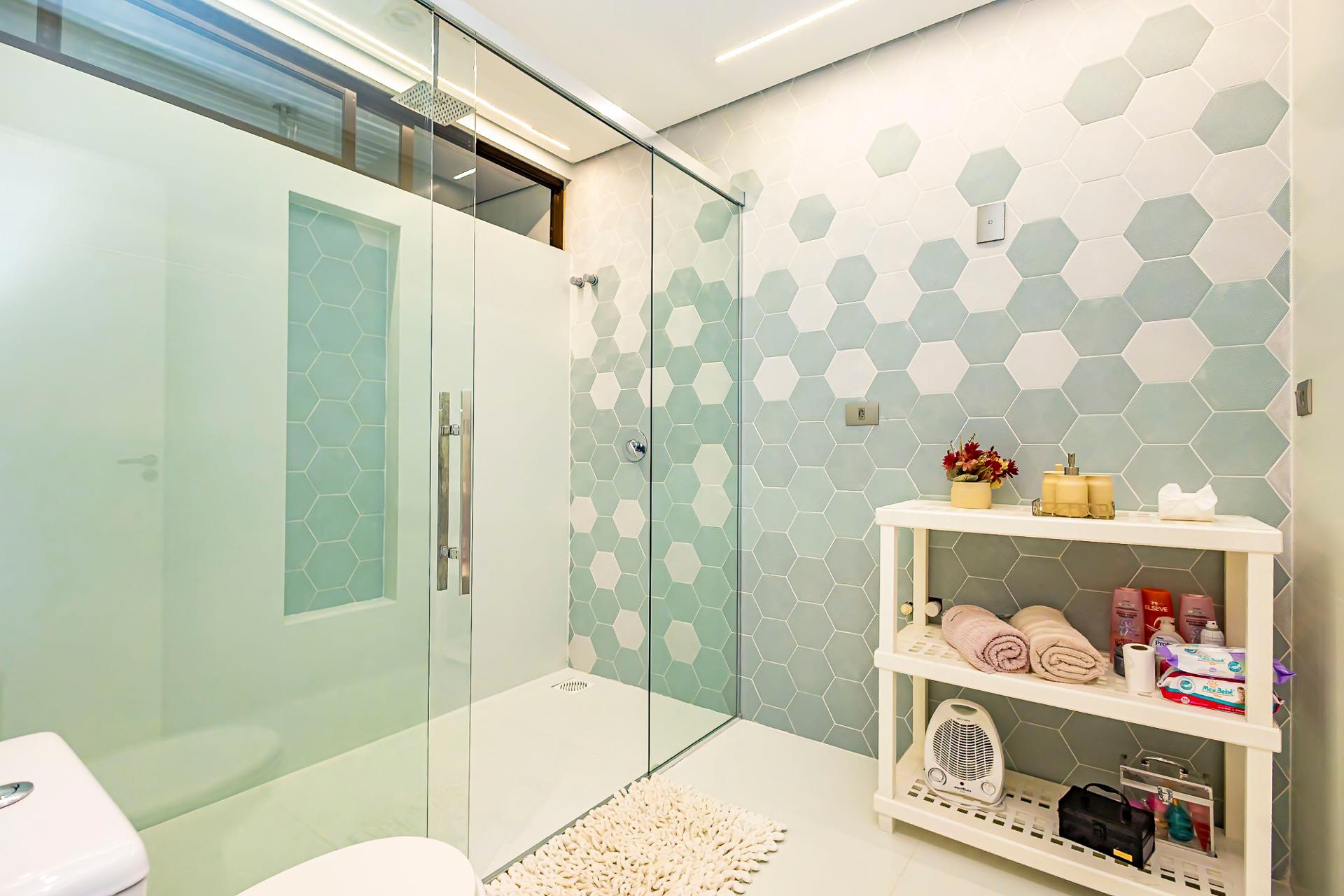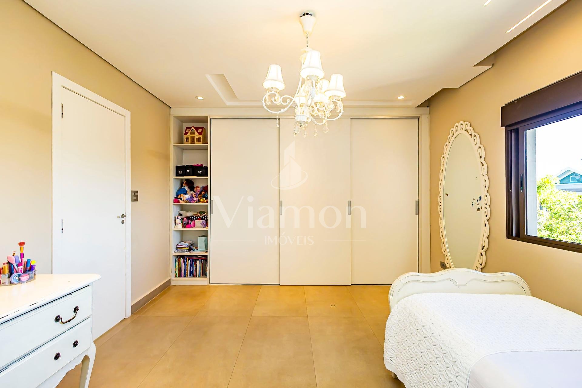 No piso superior, três suítes garantem o conforto da família. A suíte master oferece closet espaçoso, bancada com duas cubas e chuveiros duplos, compondo um refúgio de relaxamento e praticidade. Um mezanino, atualmente usado como sala íntima de TV, proporciona um espaço acolhedor e com vista aberta para o ambiente social.