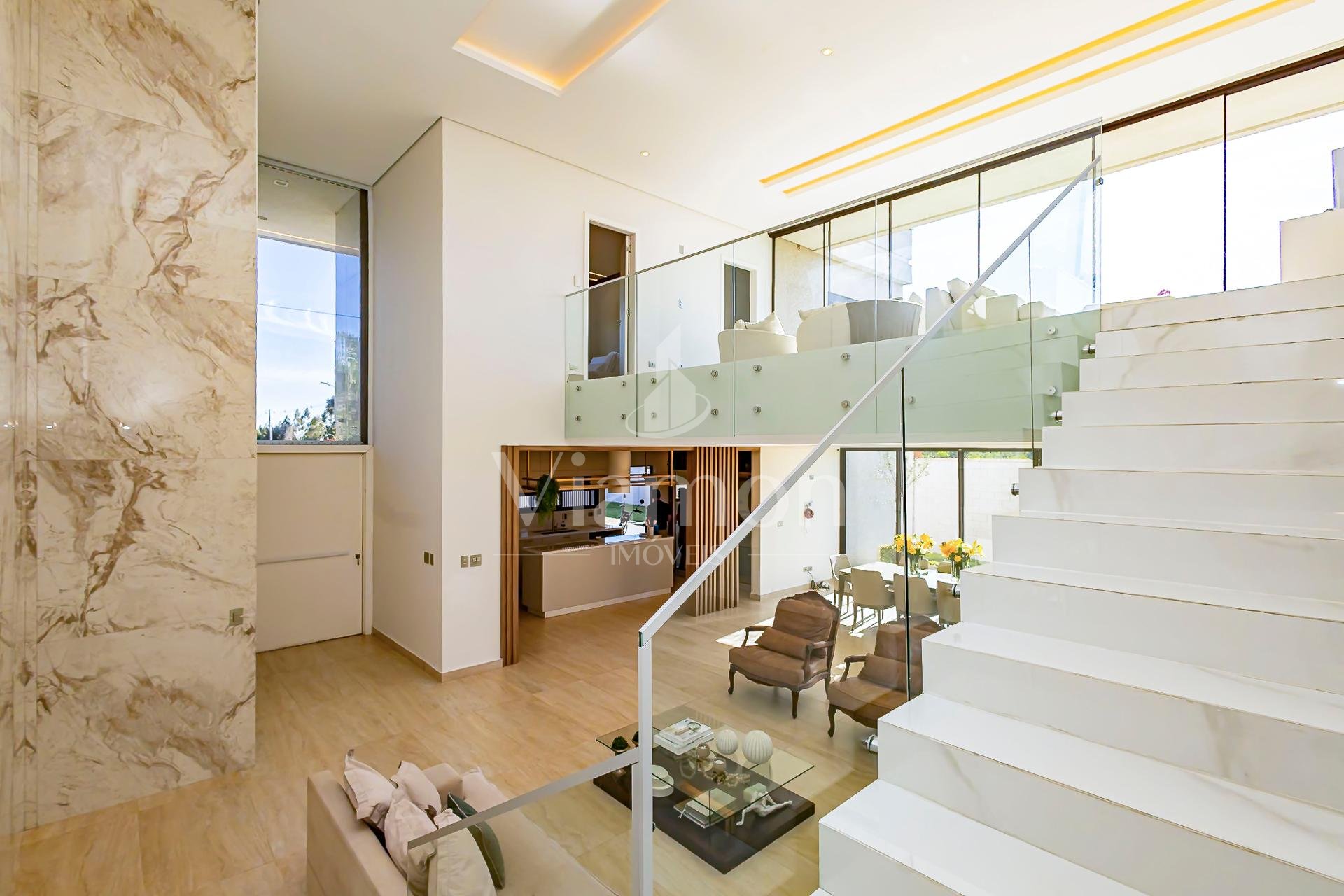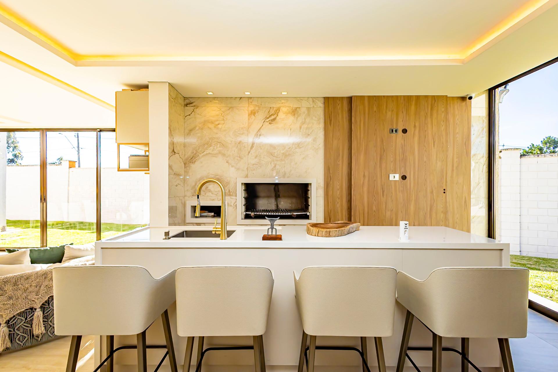 No pavimento térreo, o hall de entrada revela uma sala de estar imponente, com pé-direito duplo e grandes aberturas que ampliam a sensação de espaço e luminosidade. A cozinha mobiliada integra-se à sala de jantar, criando um ambiente funcional e convidativo. Já a área gourmet com churrasqueira a carvão conecta-se à sala e ao quintal, ideal para receber amigos e familiares com total conforto. Esse andar conta ainda com lavabo e um dormitório climatizado perfeito para hóspedes ou para ser utilizado como escritório.