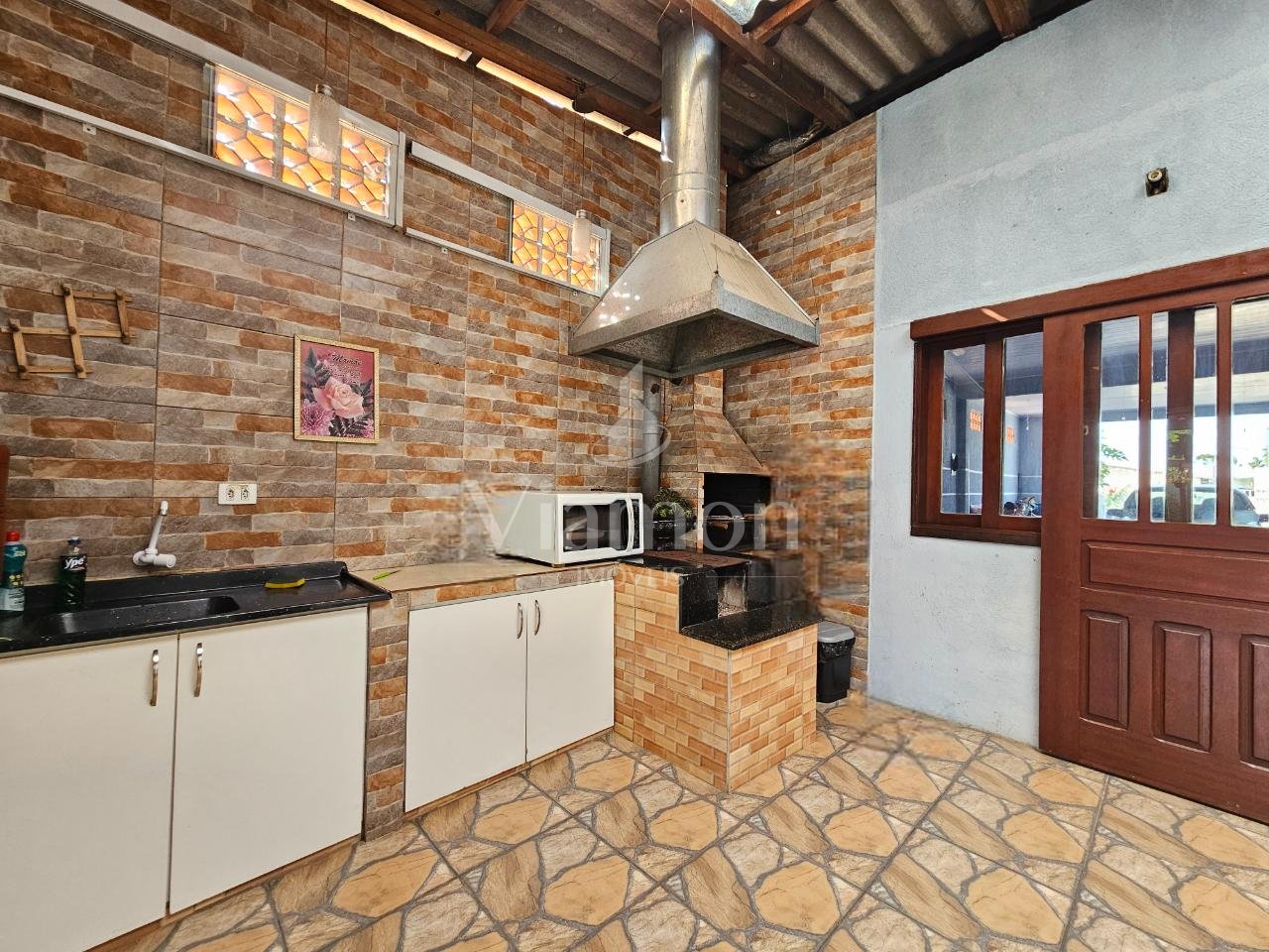 Espaço gourmet completo, com churrasqueira, fogão a lenha e bancada em granito com pia