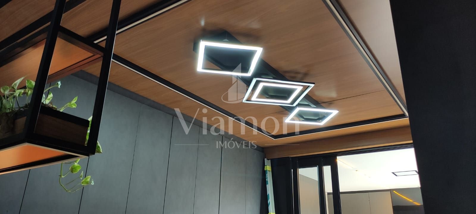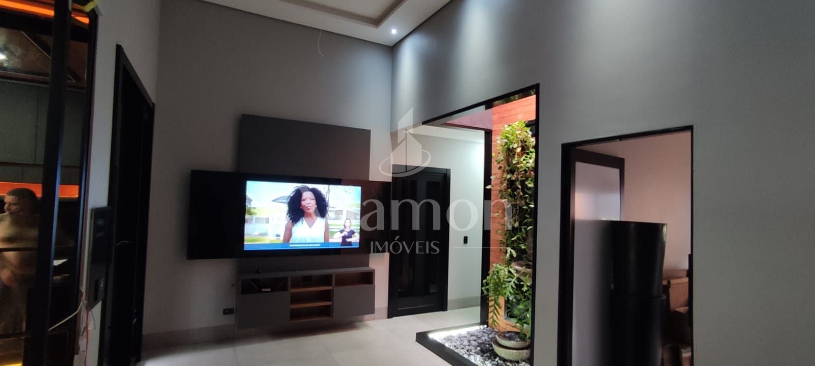 Sala espaçosa com pé-direito duplo, trazendo amplitude e iluminação natural;