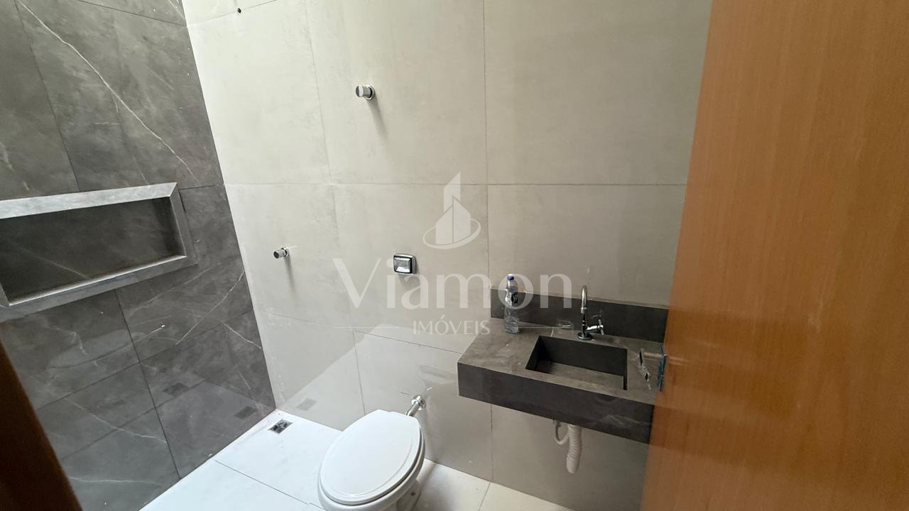 Banheiro social moderno, com acabamento de qualidade;