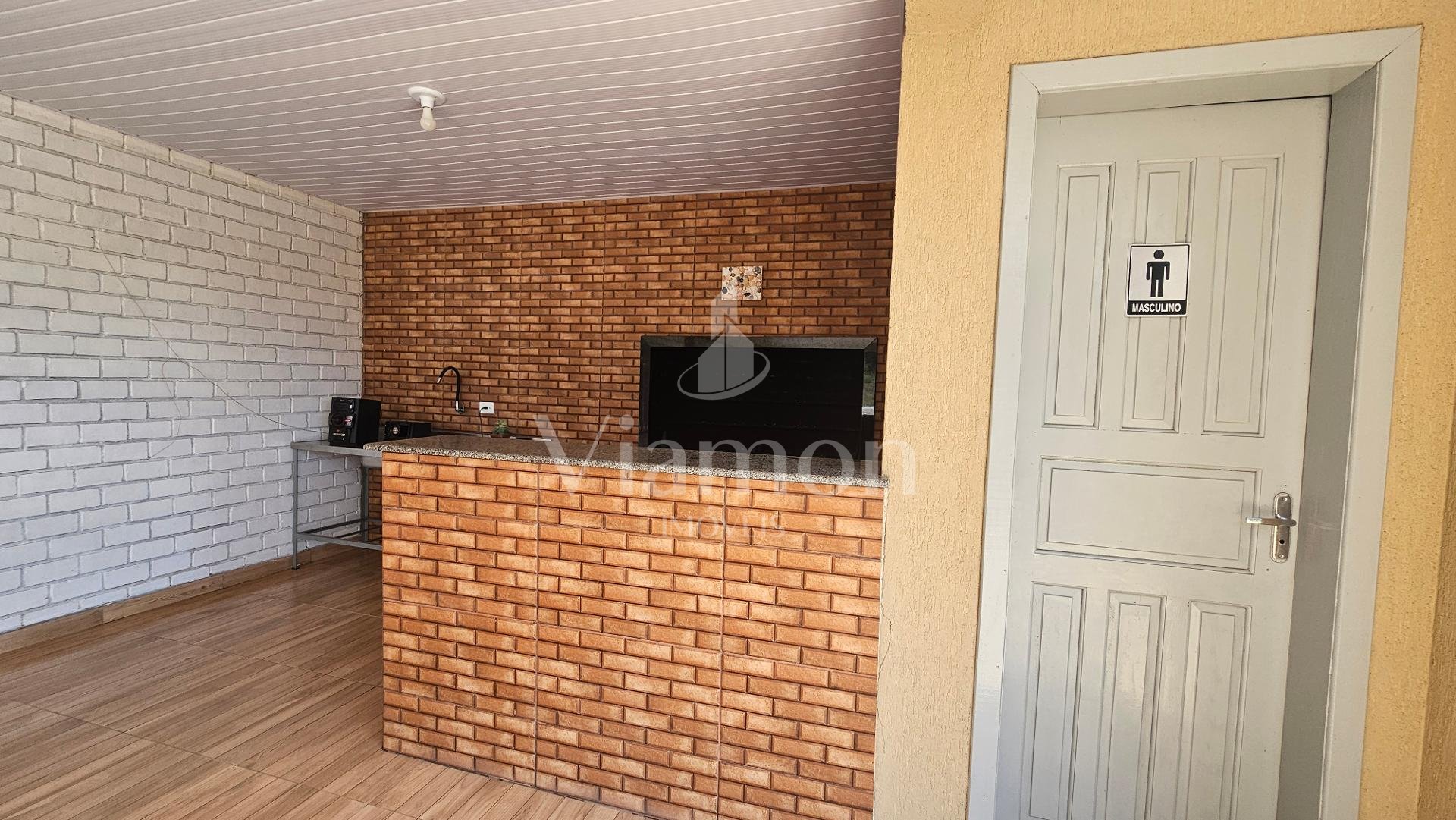 Espaço gourmet completo, com churrasqueira, pia de apoio e lavabo