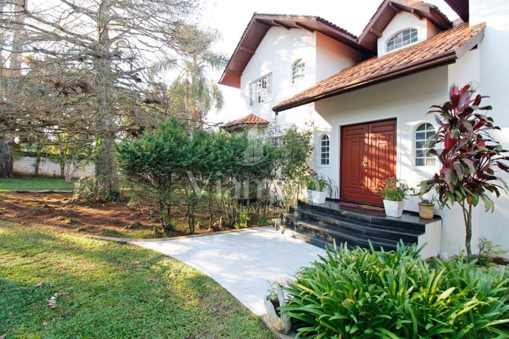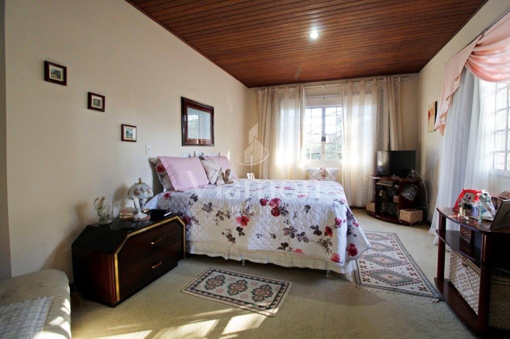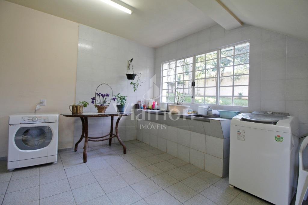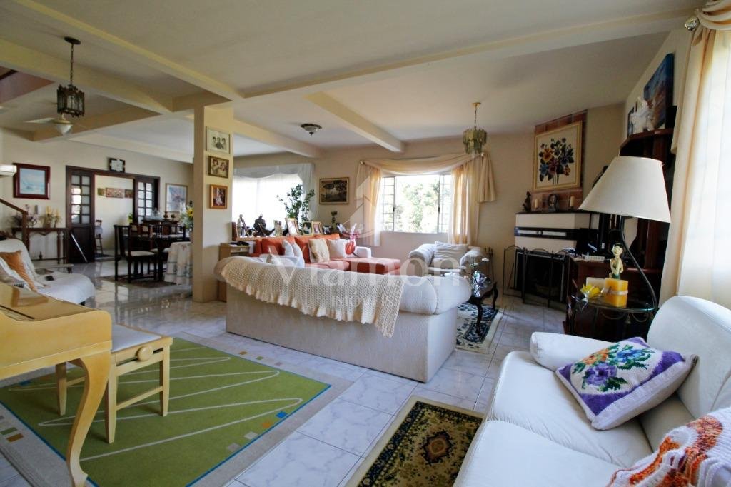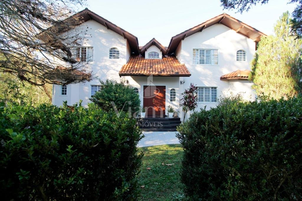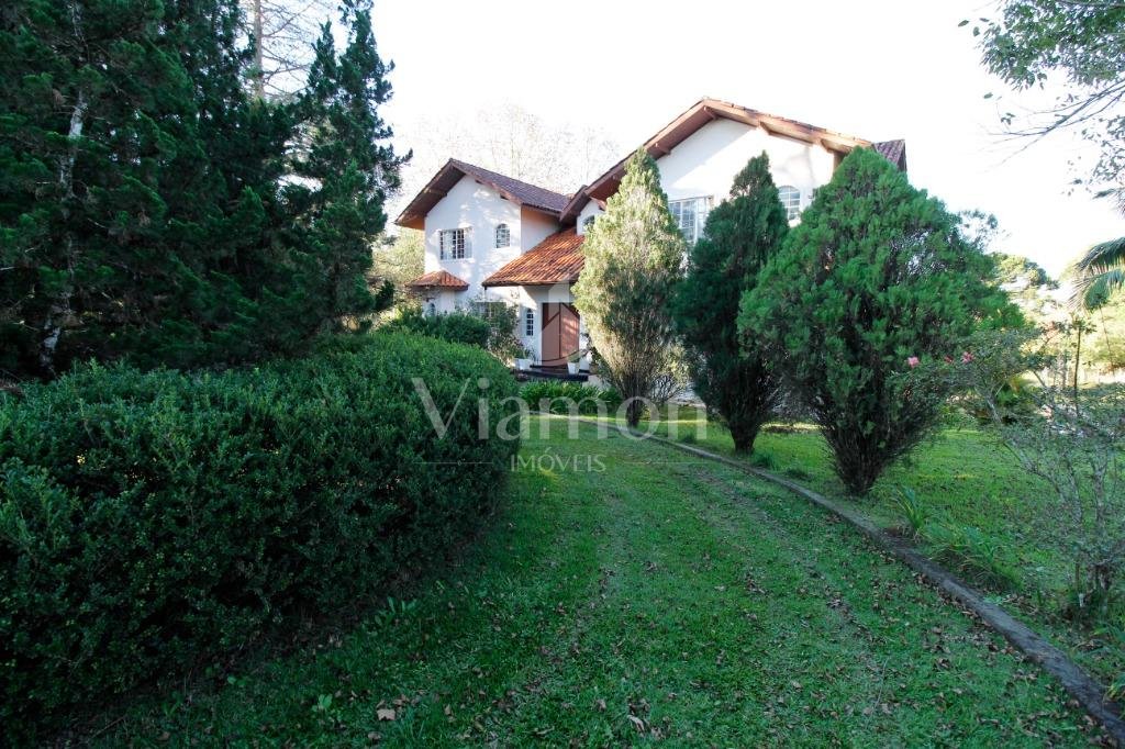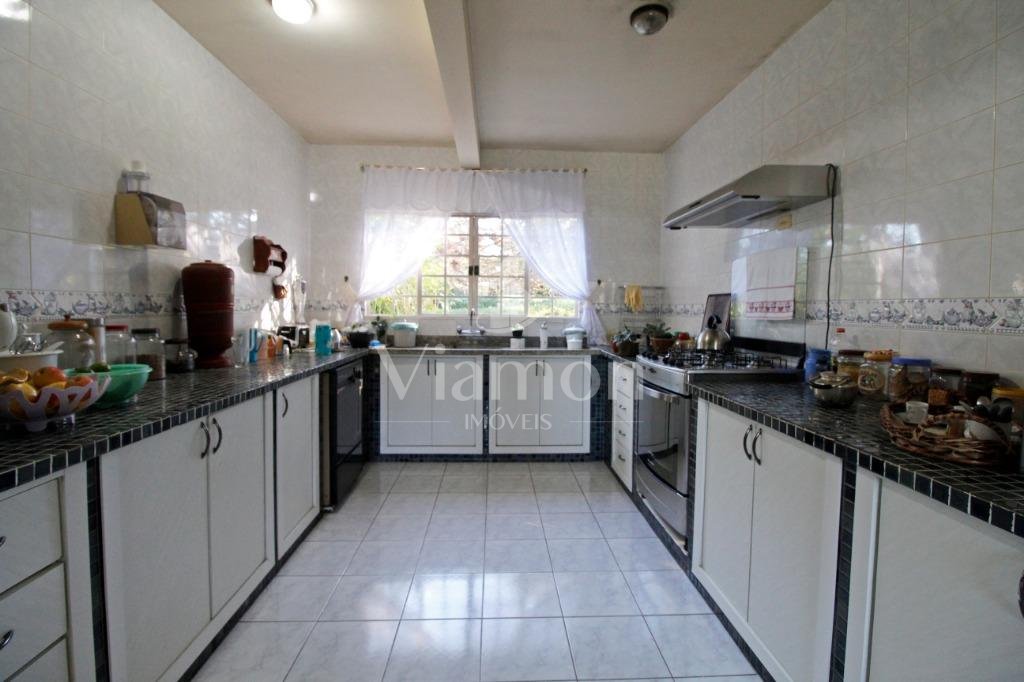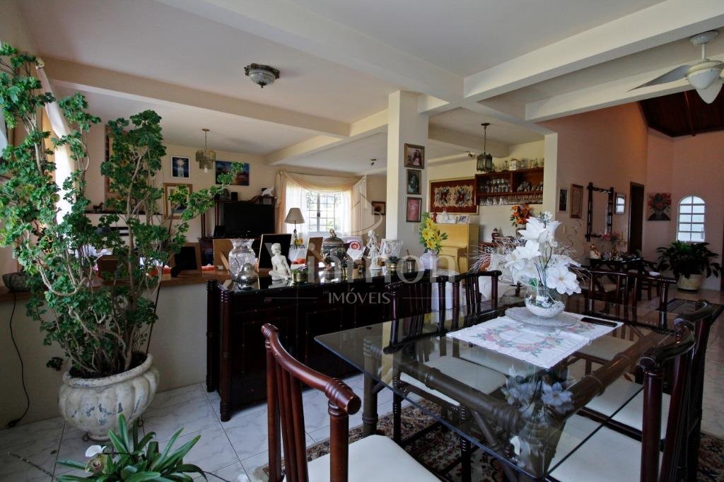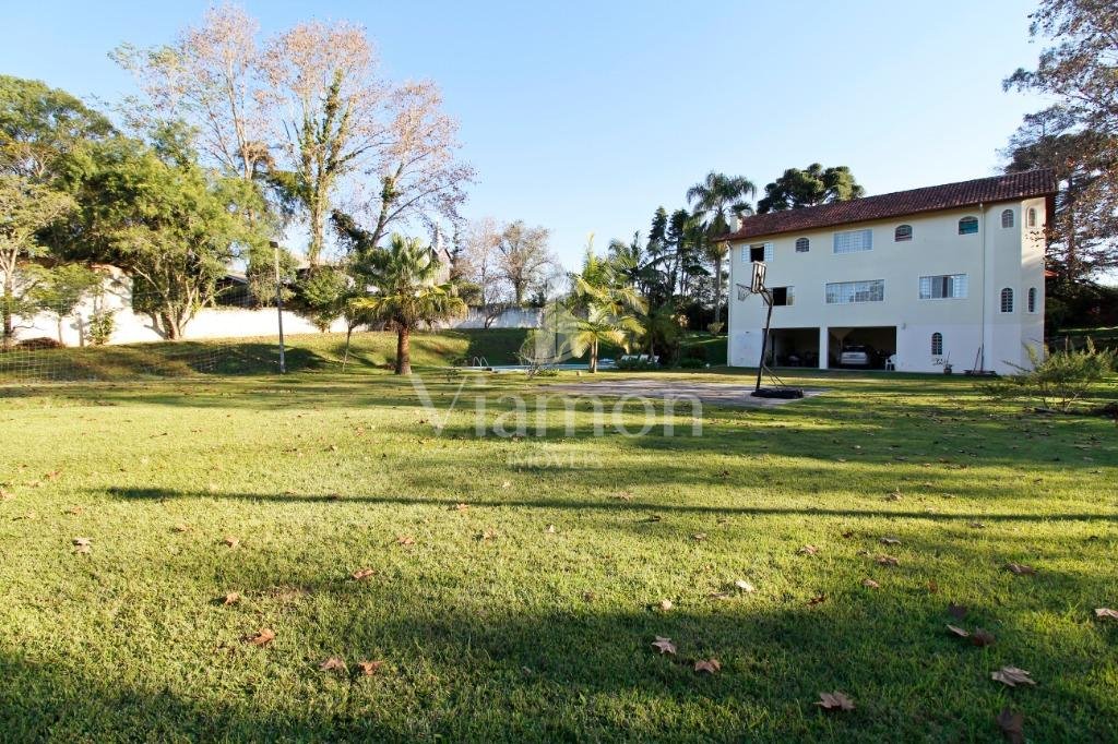 A casa tem aproximadamente 400 m2 e a construção tem 15 anos, sendo distribuída conforme segue.Piso térreo:- 1 Sala de jantar- 1 Sala de estar com lareira em granito- 1 sala de música- Hall de entrada- Escritório- Copa- Cozinha com armários embutidos- Despensa com armários- Lavabo com pia de granitoPiso superior:- 1 Suíte master com closet com armários embutidos,banheiro com box blindex,gabinete e banheira de hidromassagem - 1 Suíte com banheiro com box blindex e gabinete - 2 Quartos com closet com armários embutidos- Corredor com armário embutido- Banheiro social com gabinete e box blindexPiso inferior:- Lavanderia com aquecimento central a gás - Garagem- Quarto de emprega- Banheiro de empregadaTerreno:- 6000m2 todo murado, com portão de entrada eletrônico e interfone- Campo de futebol com iluminação- Mini quadra de basquete- Piscina 11X 4 X 1,5m , com iluminação interna e externaCanil- Bosque com árvores frutíferas e nativas de aprox.2000m2- Belo jardim frontal de aprox.1000m2- Poço com eletrificação para a casa- Porão para utensílios de jardim