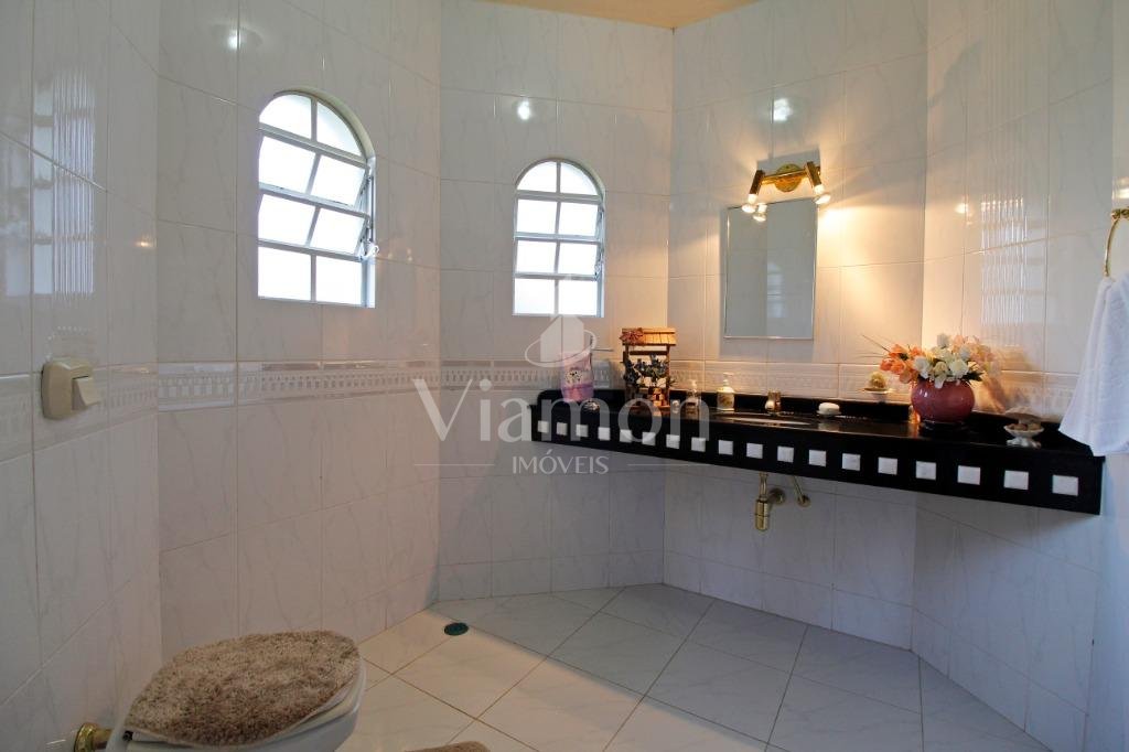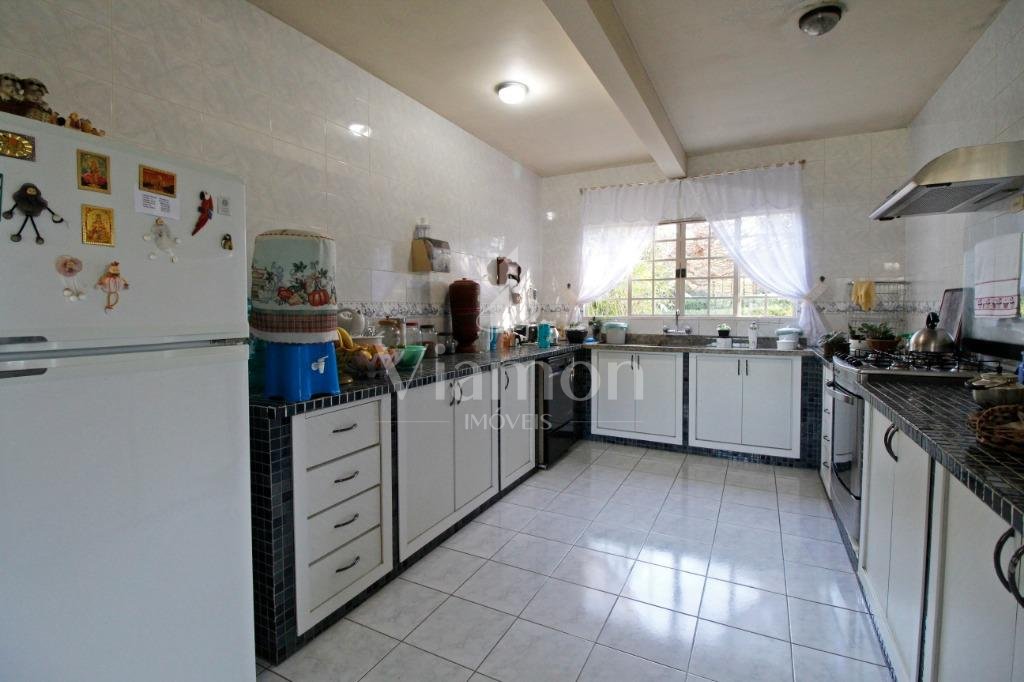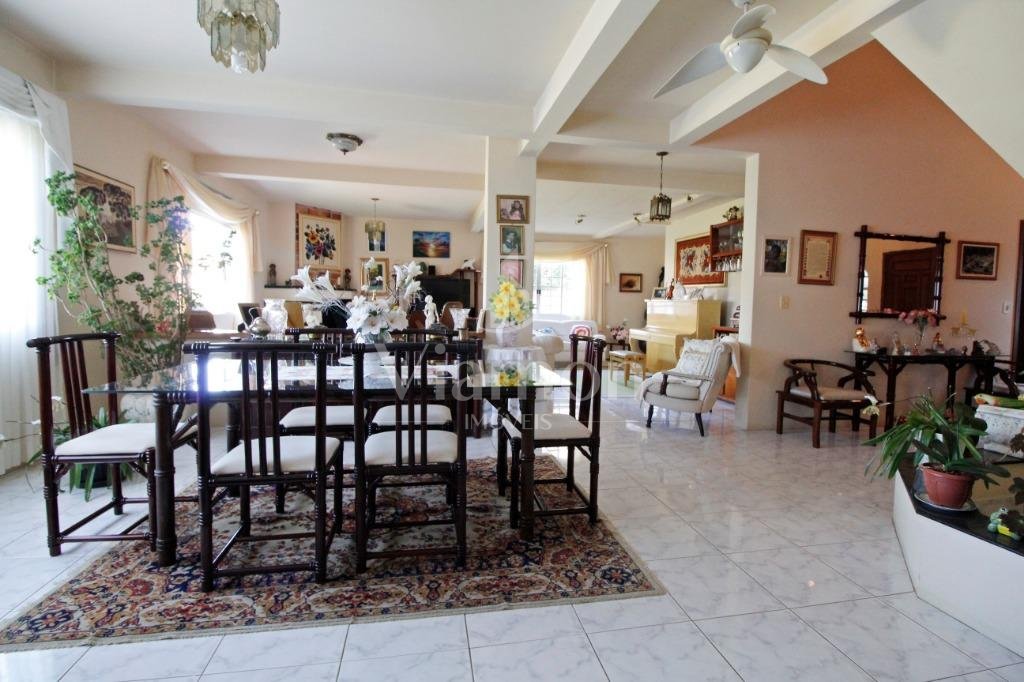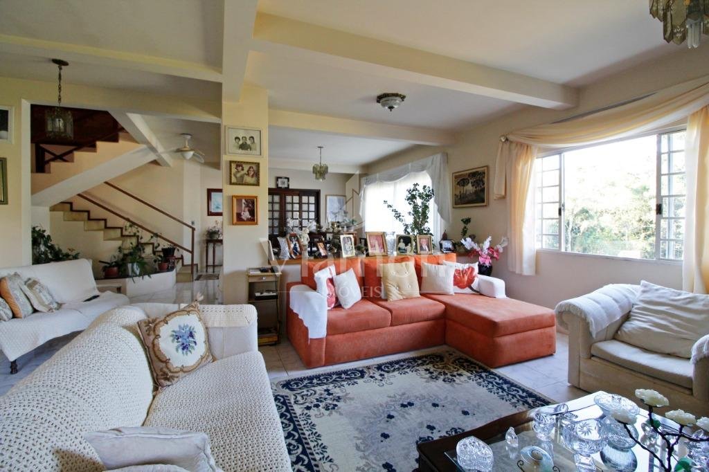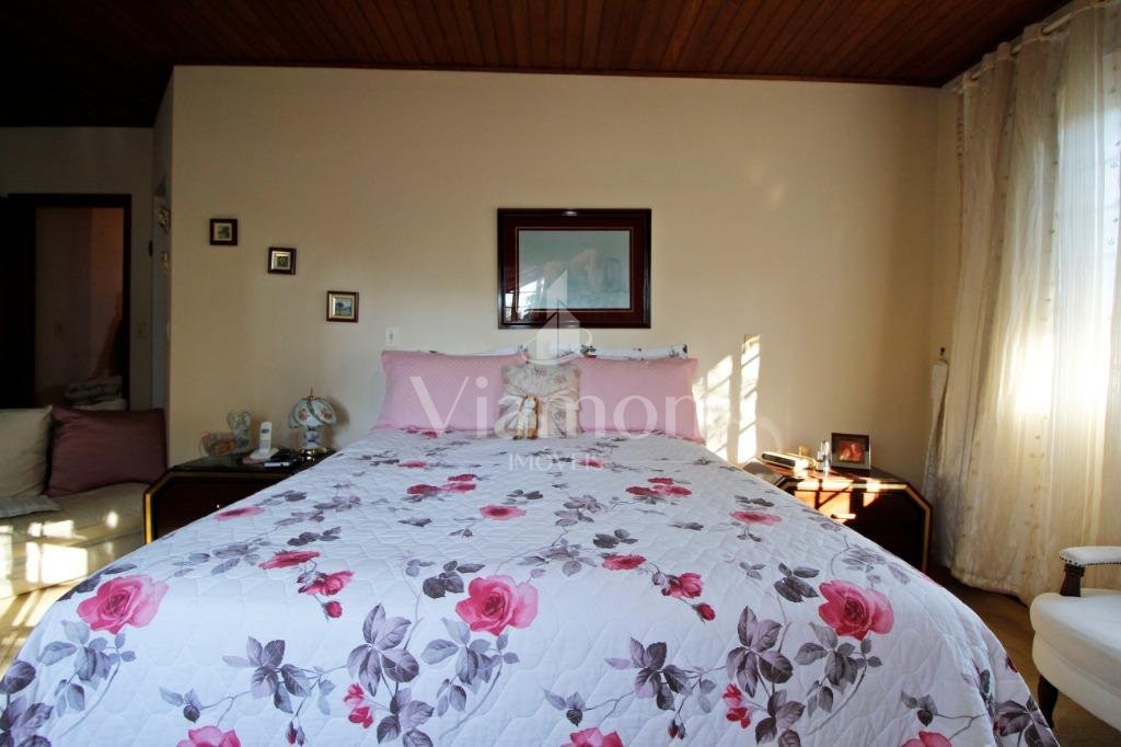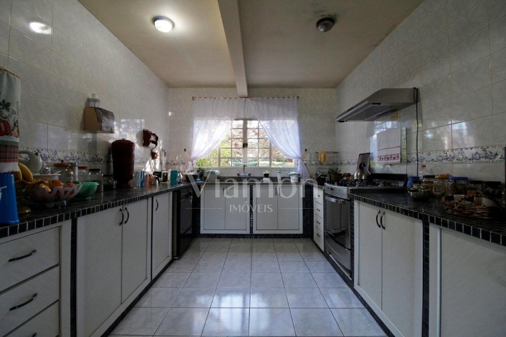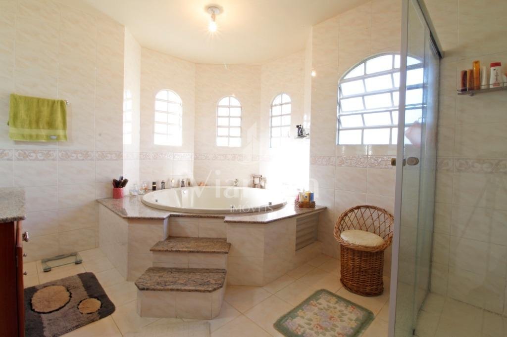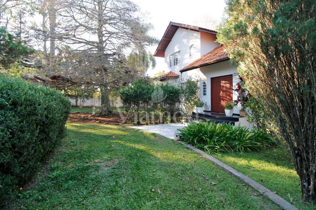 A casa tem aproximadamente 400 m2 e a construção tem 15 anos, sendo distribuída conforme segue.Piso térreo:- 1 Sala de jantar- 1 Sala de estar com lareira em granito- 1 sala de música- Hall de entrada- Escritório- Copa- Cozinha com armários embutidos- Despensa com armários- Lavabo com pia de granitoPiso superior:- 1 Suíte master com closet com armários embutidos,banheiro com box blindex,gabinete e banheira de hidromassagem - 1 Suíte com banheiro com box blindex e gabinete - 2 Quartos com closet com armários embutidos- Corredor com armário embutido- Banheiro social com gabinete e box blindexPiso inferior:- Lavanderia com aquecimento central a gás - Garagem- Quarto de emprega- Banheiro de empregadaTerreno:- 6000m2 todo murado, com portão de entrada eletrônico e interfone- Campo de futebol com iluminação- Mini quadra de basquete- Piscina 11X 4 X 1,5m , com iluminação interna e externaCanil- Bosque com árvores frutíferas e nativas de aprox.2000m2- Belo jardim frontal de aprox.1000m2- Poço com eletrificação para a casa- Porão para utensílios de jardim