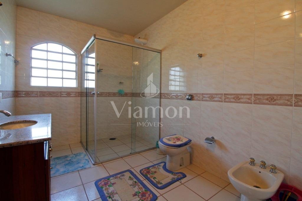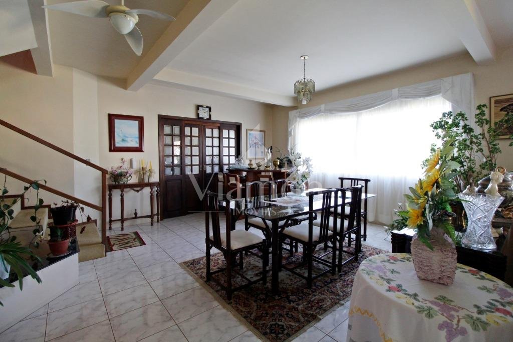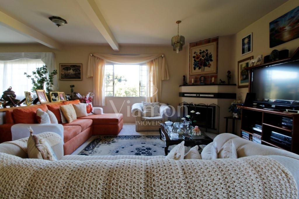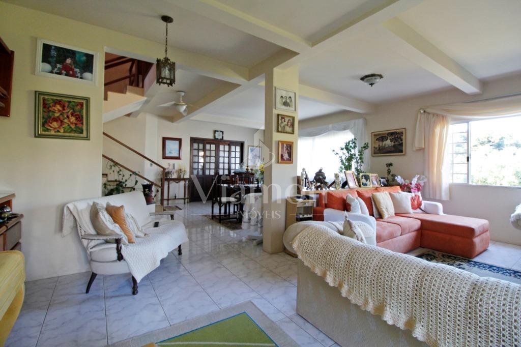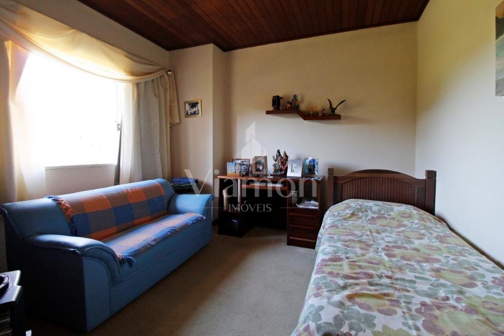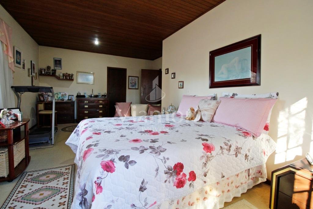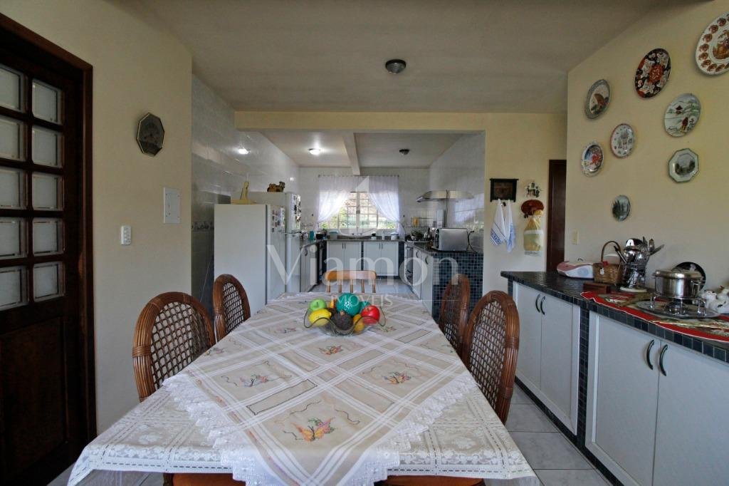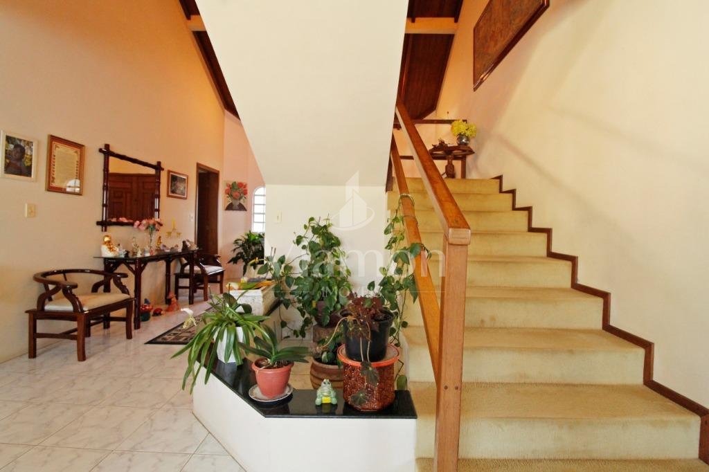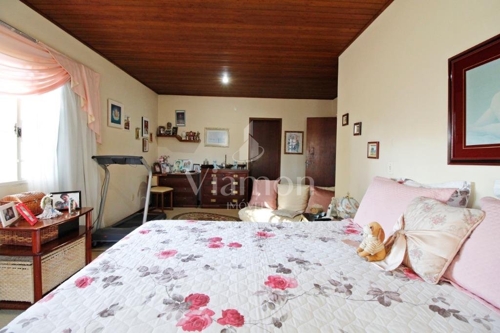 A casa tem aproximadamente 400 m2 e a construção tem 15 anos, sendo distribuída conforme segue.Piso térreo:- 1 Sala de jantar- 1 Sala de estar com lareira em granito- 1 sala de música- Hall de entrada- Escritório- Copa- Cozinha com armários embutidos- Despensa com armários- Lavabo com pia de granitoPiso superior:- 1 Suíte master com closet com armários embutidos,banheiro com box blindex,gabinete e banheira de hidromassagem - 1 Suíte com banheiro com box blindex e gabinete - 2 Quartos com closet com armários embutidos- Corredor com armário embutido- Banheiro social com gabinete e box blindexPiso inferior:- Lavanderia com aquecimento central a gás - Garagem- Quarto de emprega- Banheiro de empregadaTerreno:- 6000m2 todo murado, com portão de entrada eletrônico e interfone- Campo de futebol com iluminação- Mini quadra de basquete- Piscina 11X 4 X 1,5m , com iluminação interna e externaCanil- Bosque com árvores frutíferas e nativas de aprox.2000m2- Belo jardim frontal de aprox.1000m2- Poço com eletrificação para a casa- Porão para utensílios de jardim