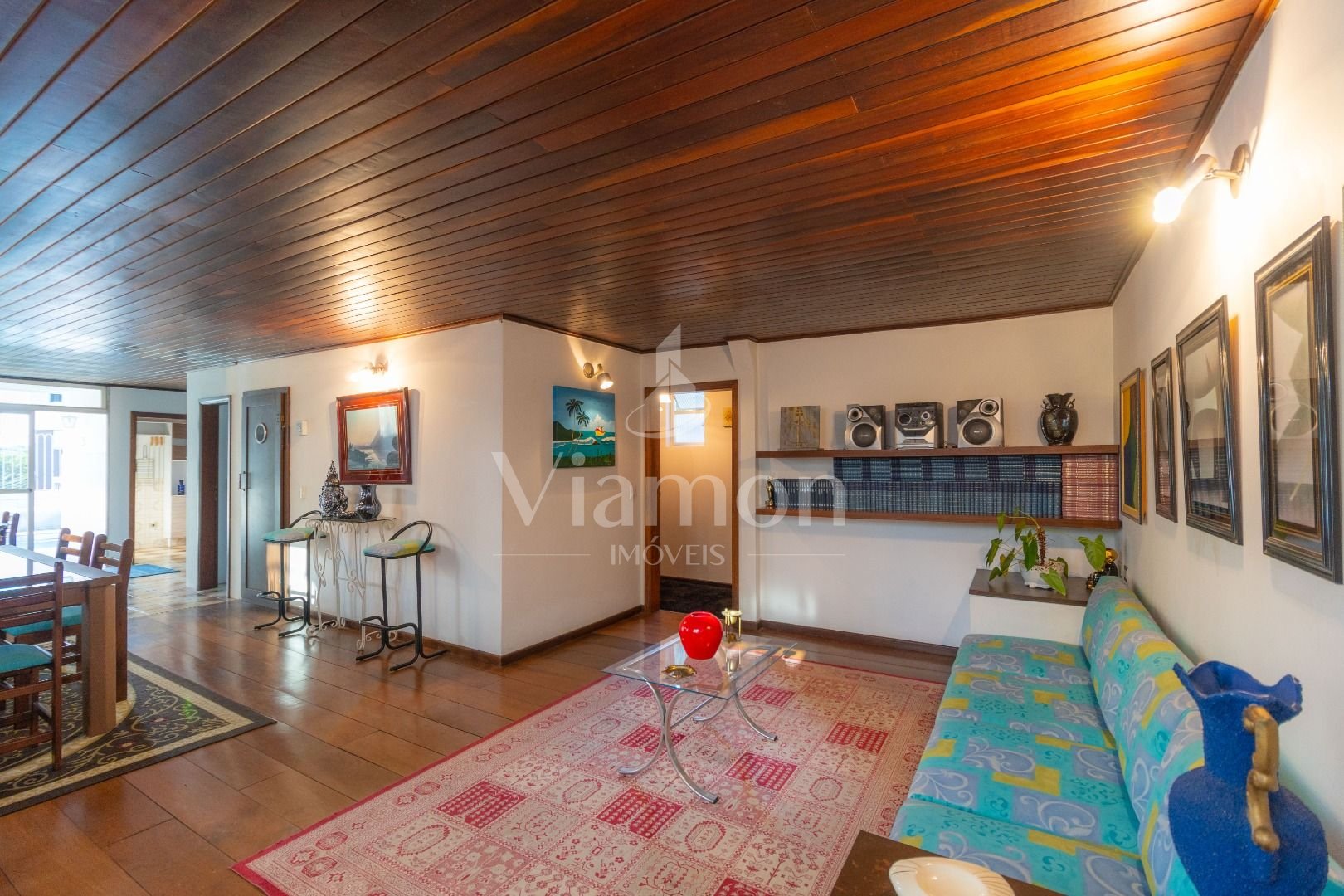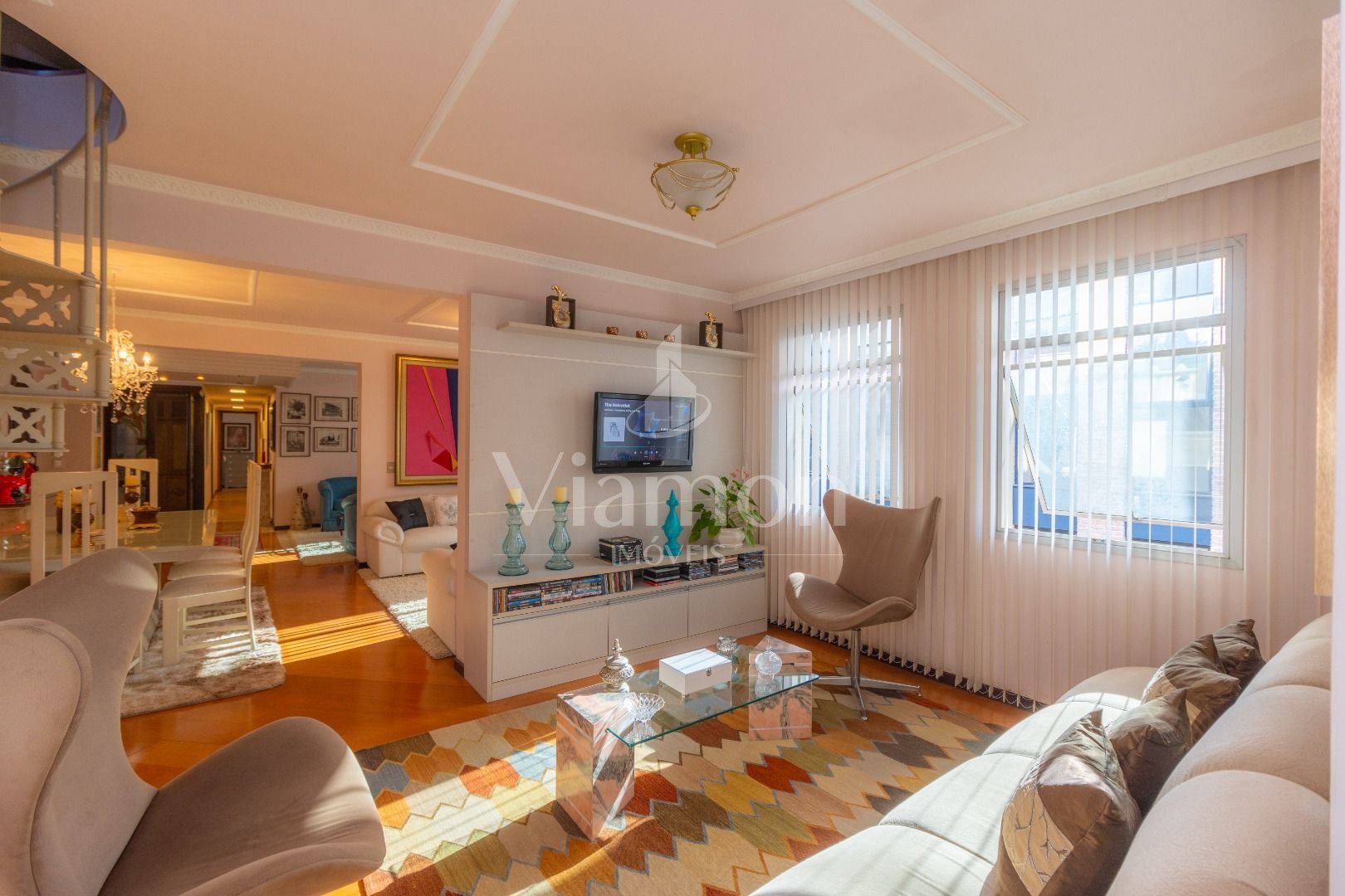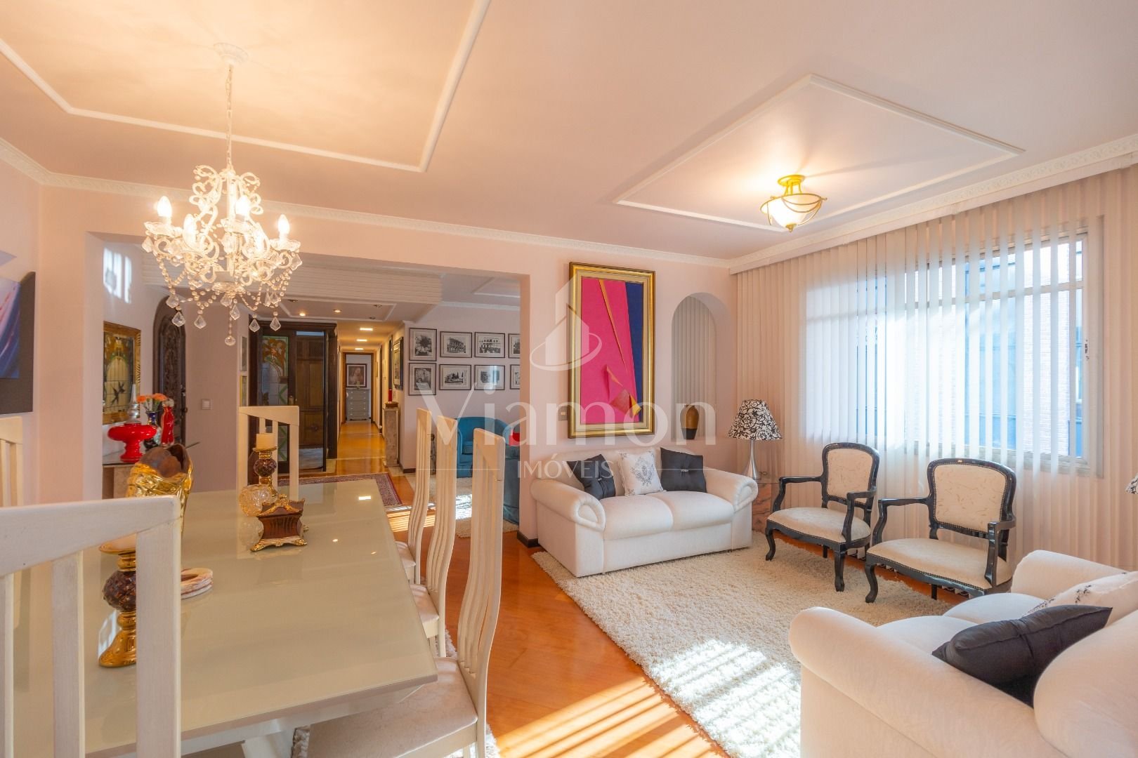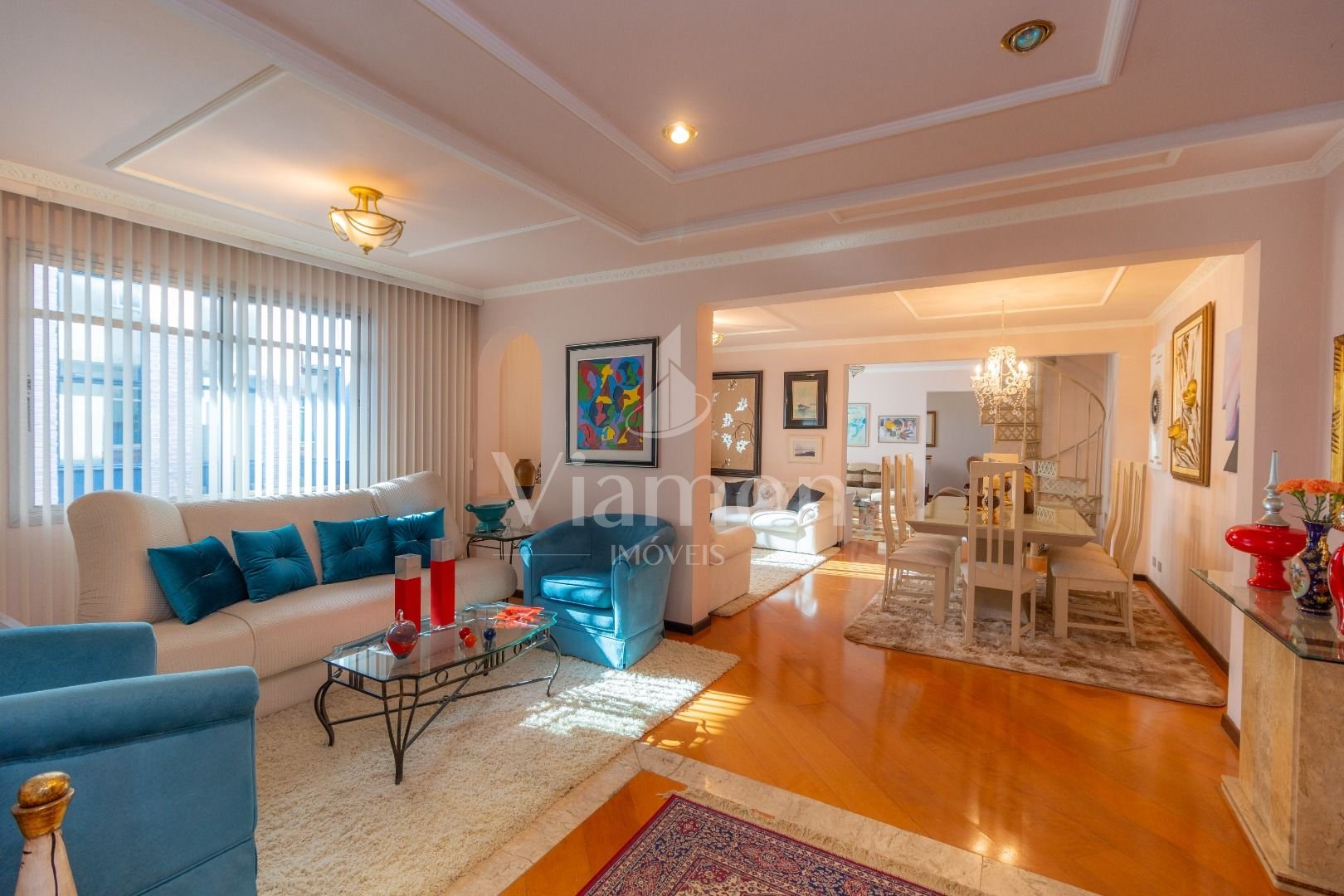 Quatro salas integradas: sala de estar, sala de TV, sala de jantar e copa ao lado da cozinha.