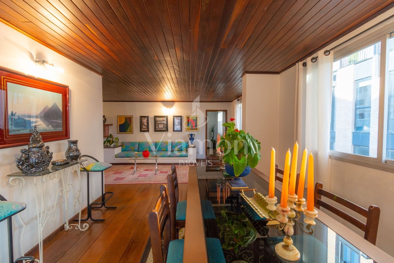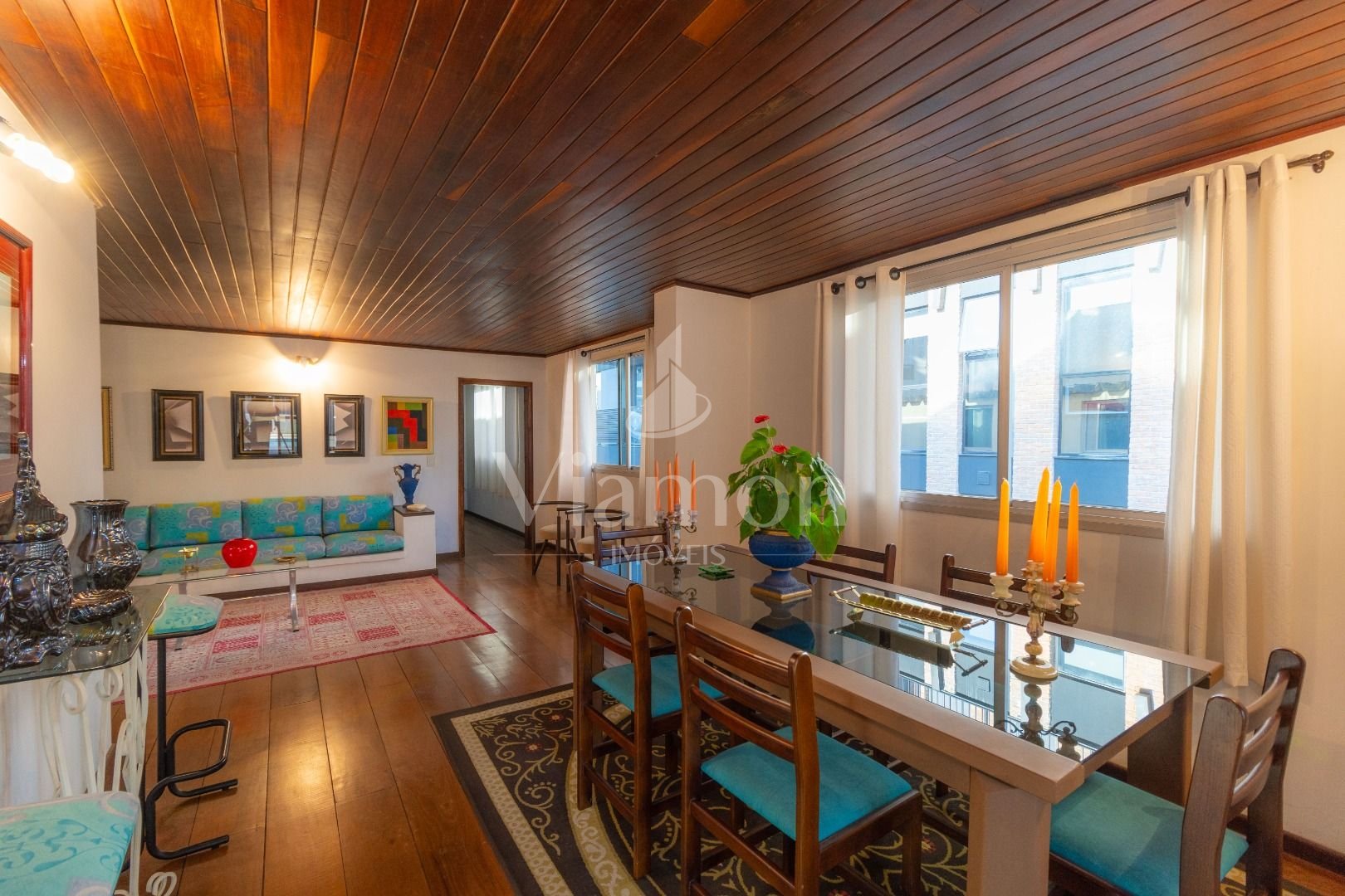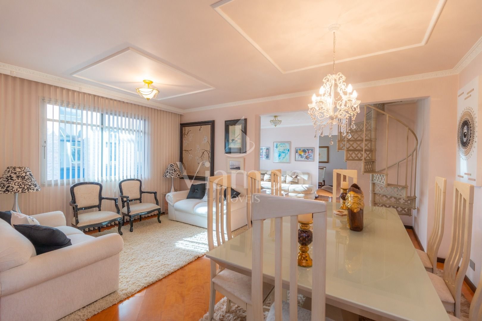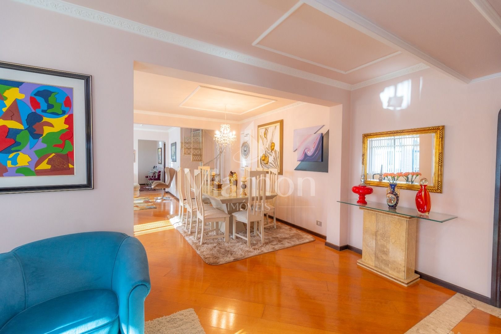 Quatro salas integradas: sala de estar, sala de TV, sala de jantar e copa ao lado da cozinha.
