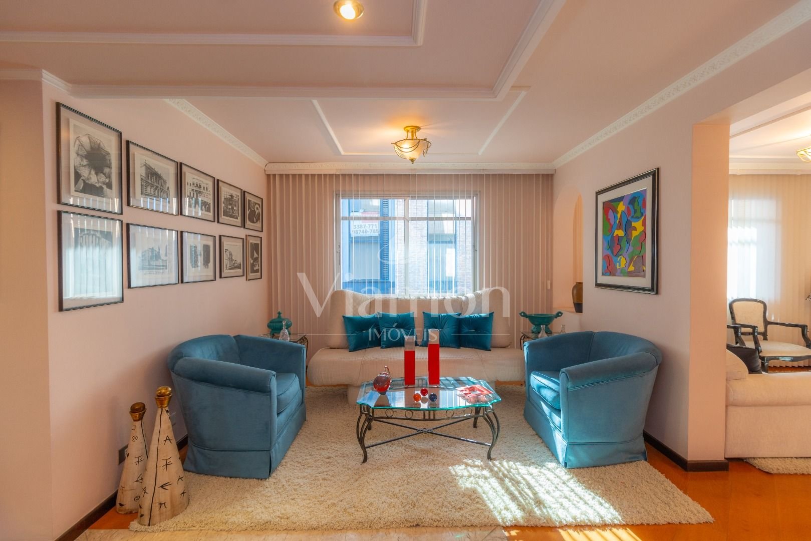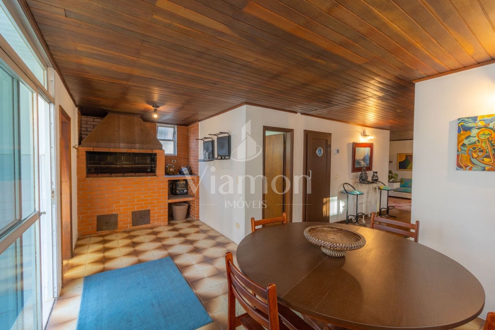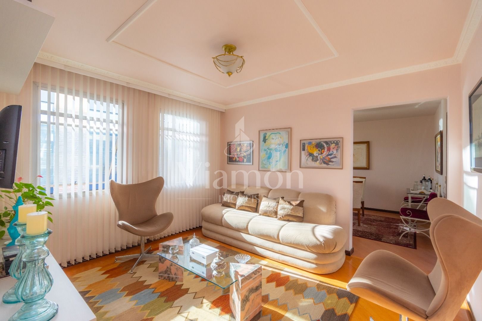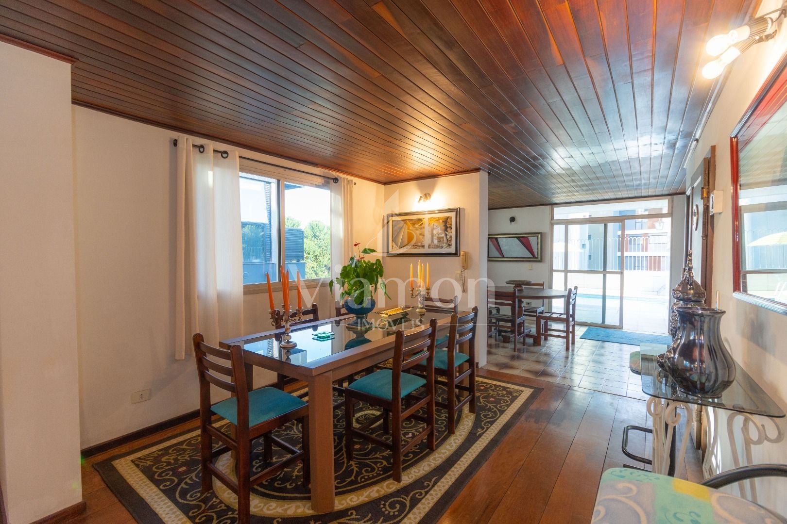 Quatro salas integradas: sala de estar, sala de TV, sala de jantar e copa ao lado da cozinha.