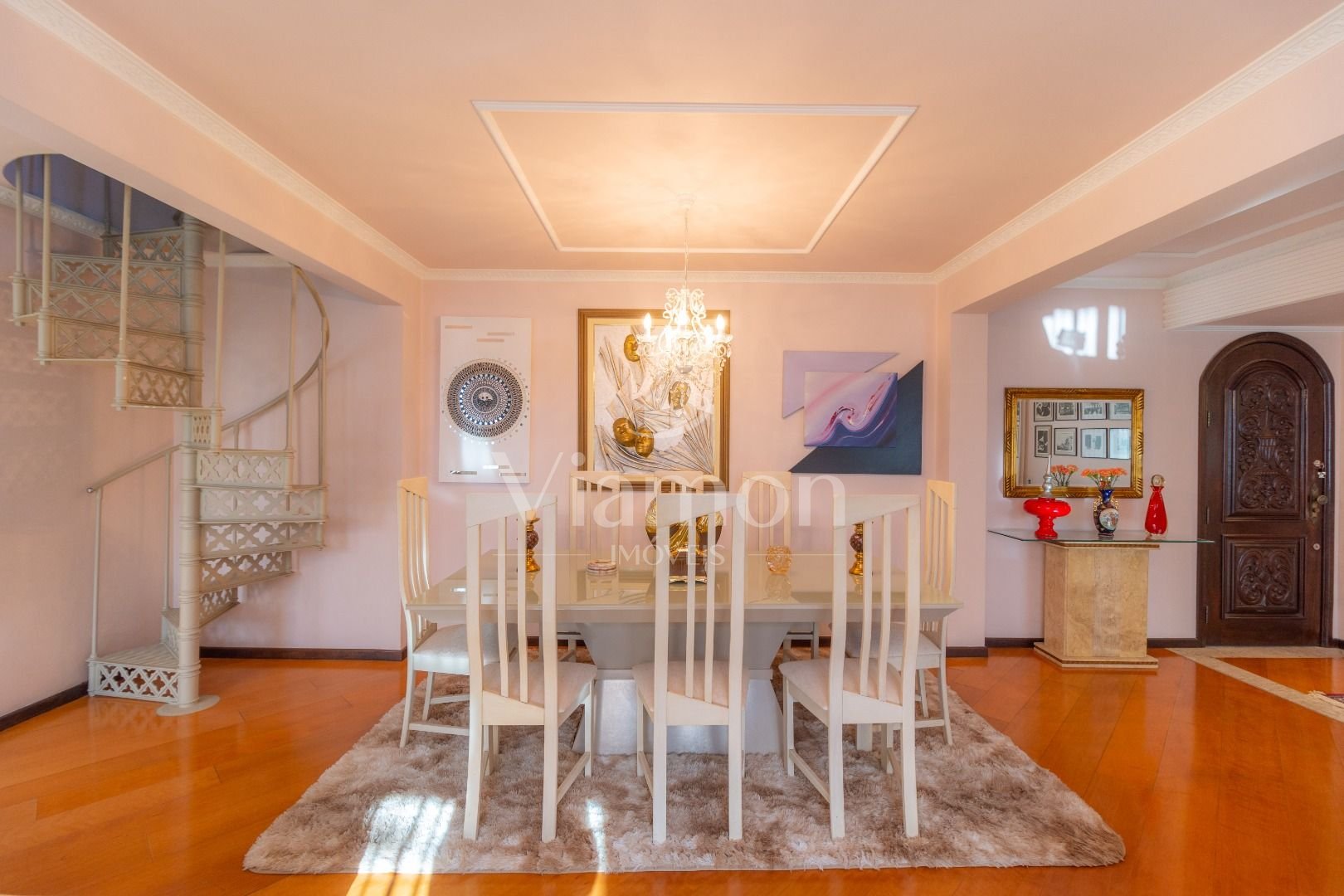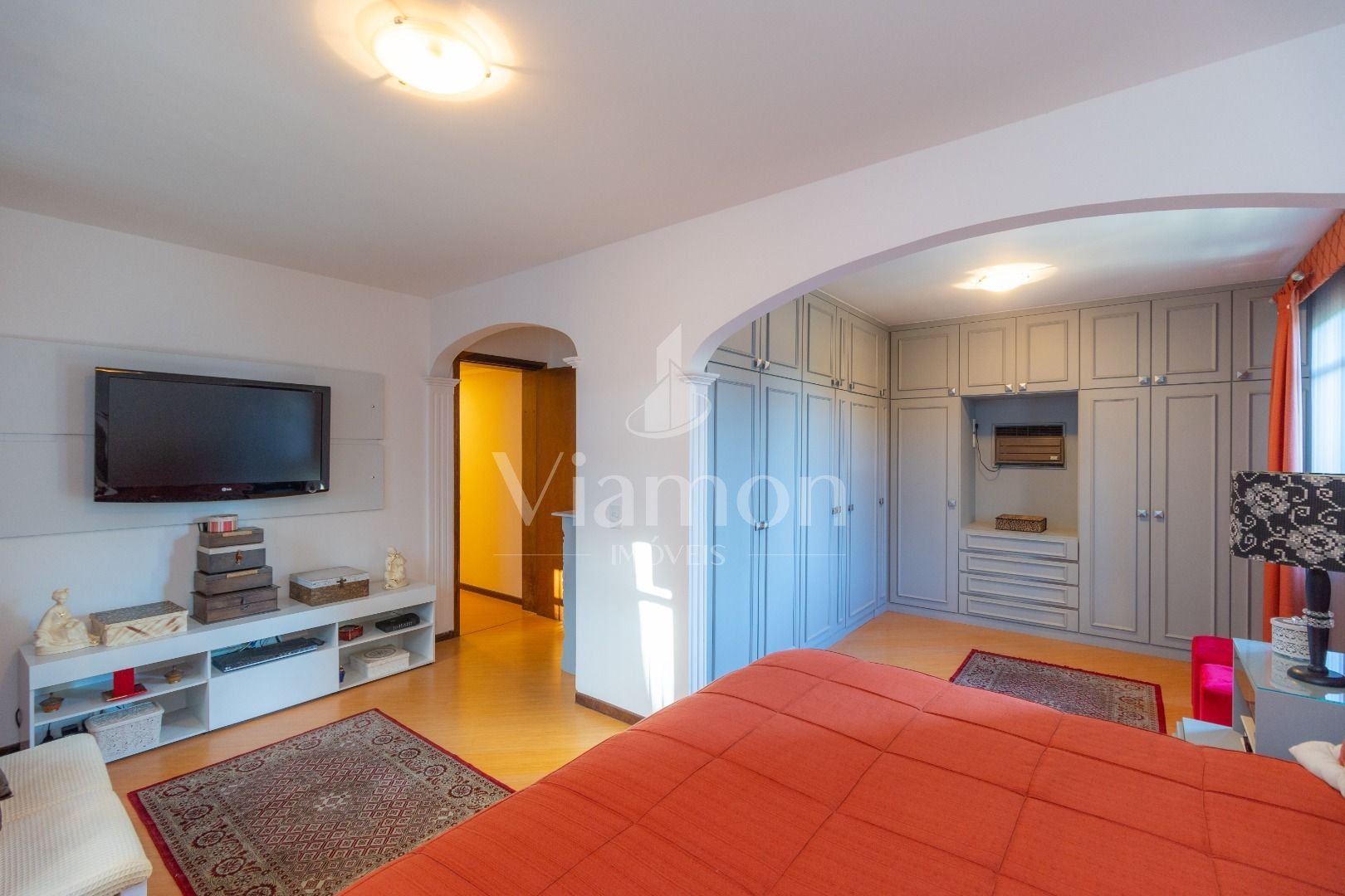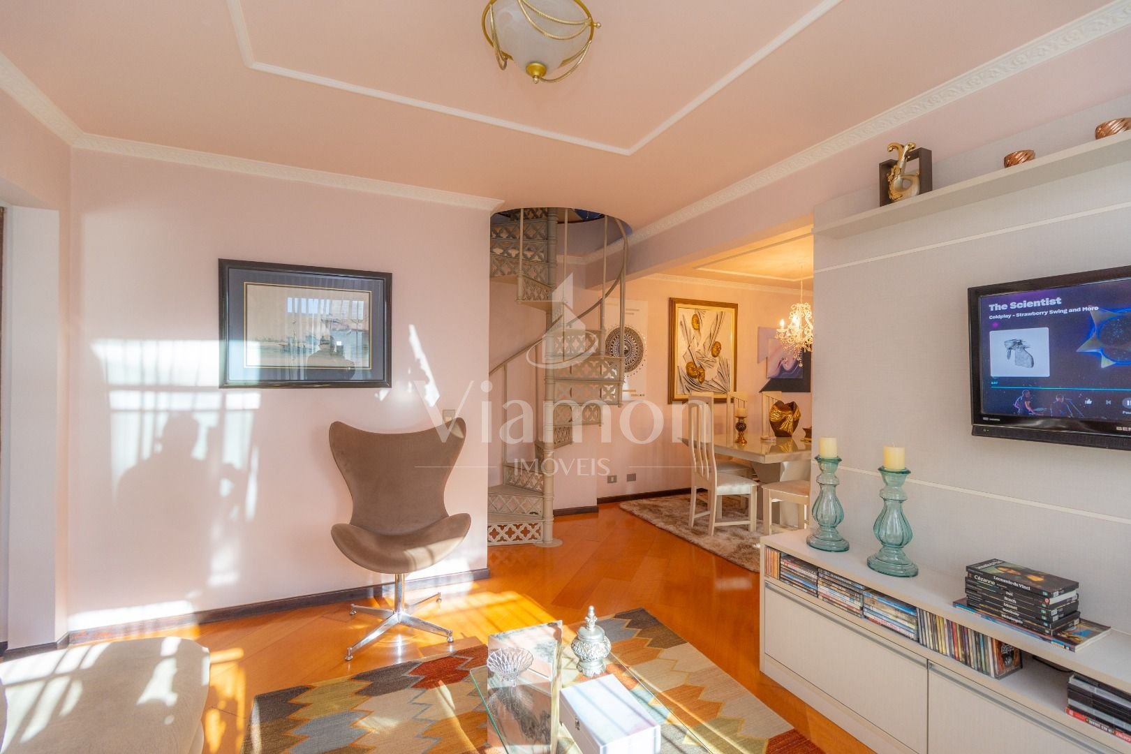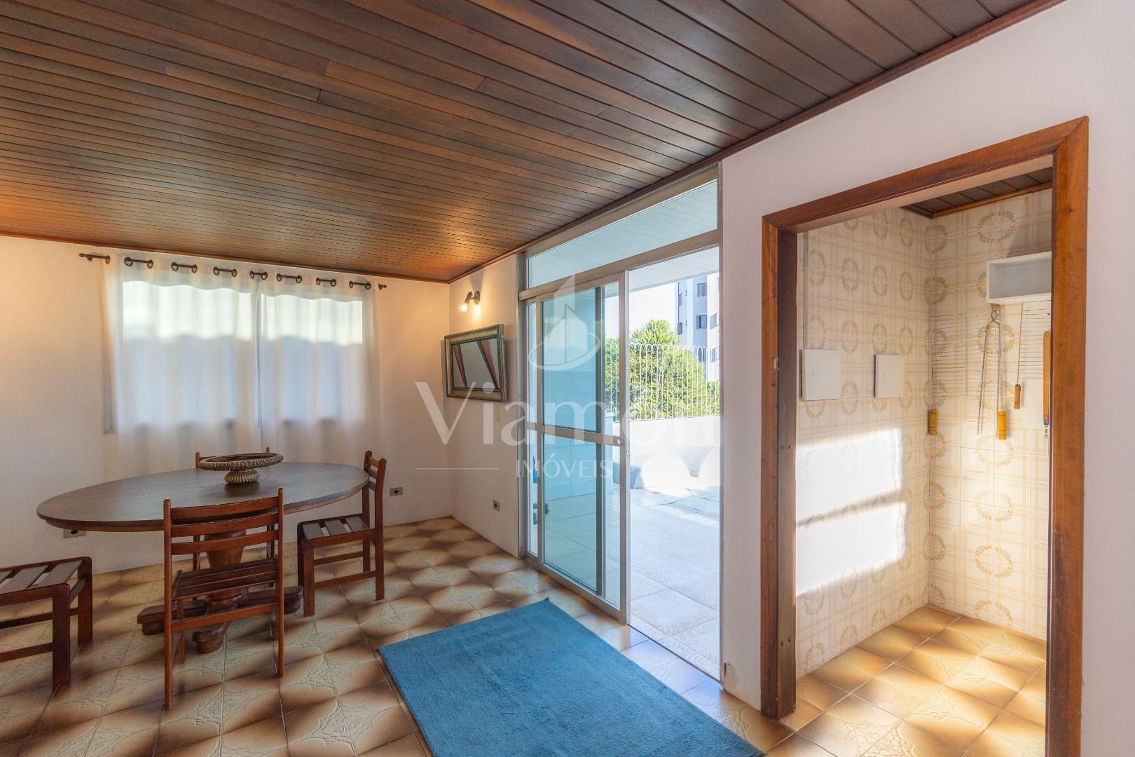 Quatro salas integradas: sala de estar, sala de TV, sala de jantar e copa ao lado da cozinha.