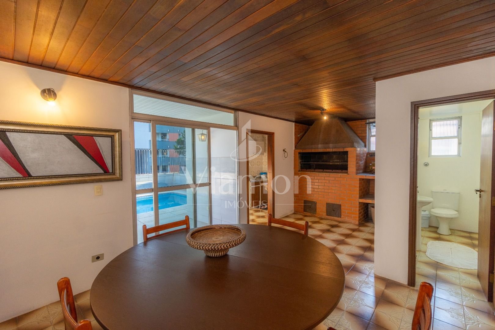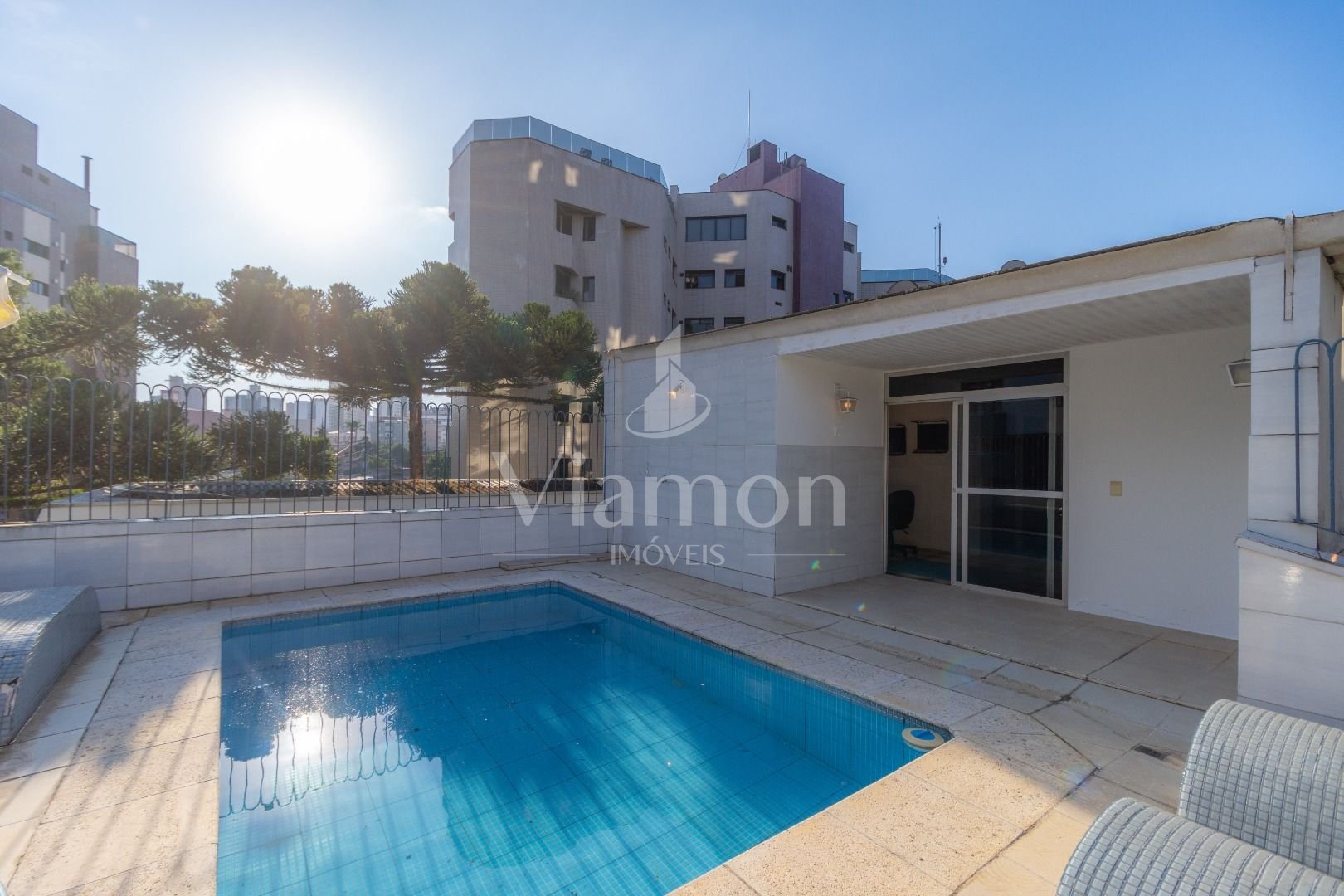 Varanda com piscina, perfeita para relaxar sob o guarda-sol, contemplando os pinheiros, os pássaros e o céu estrelado.