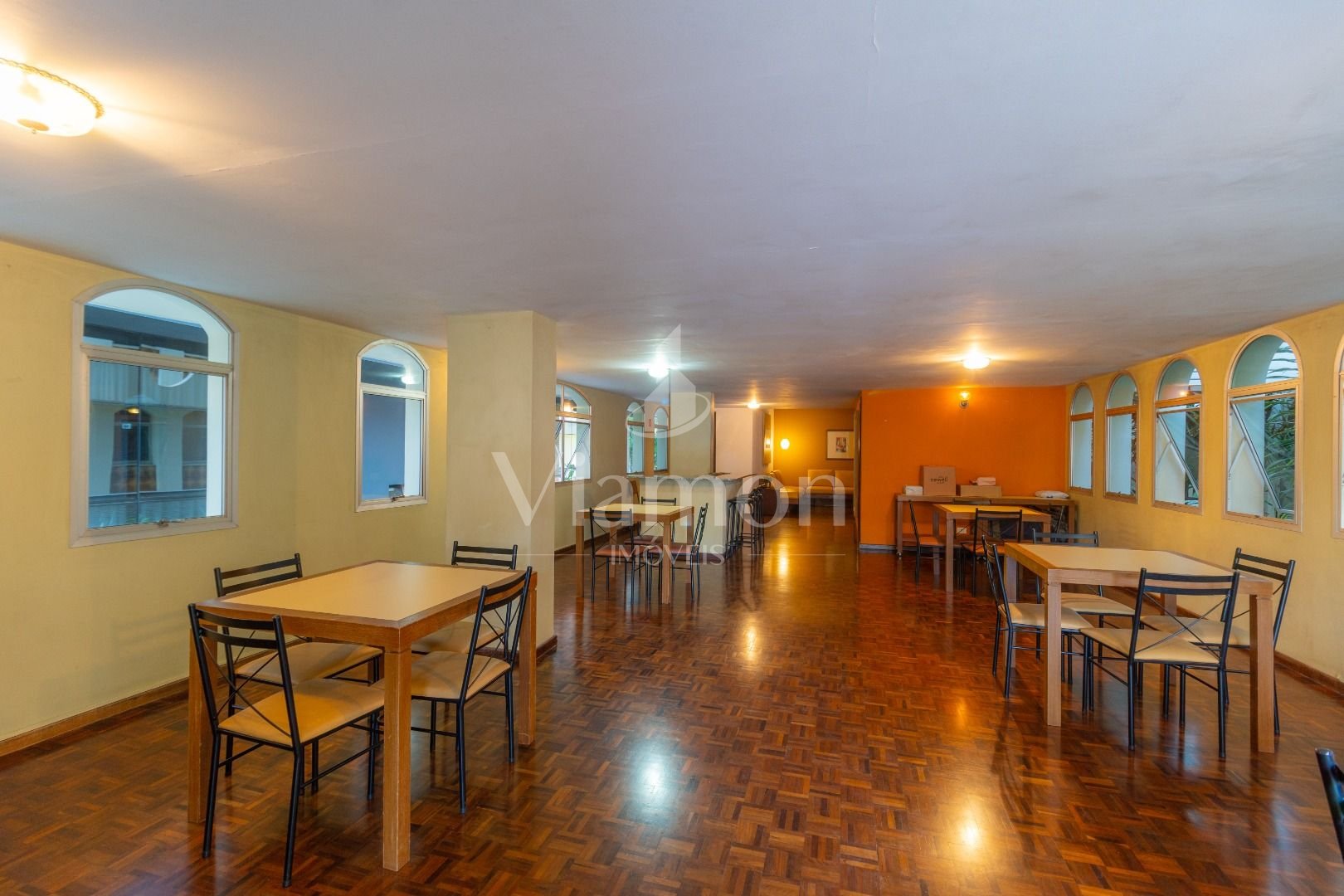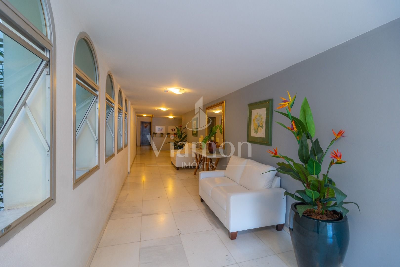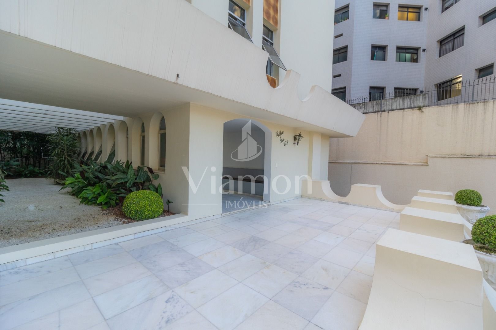 Salão de festas e jardim no piso térreo, com hall de entrada em mármore branco.